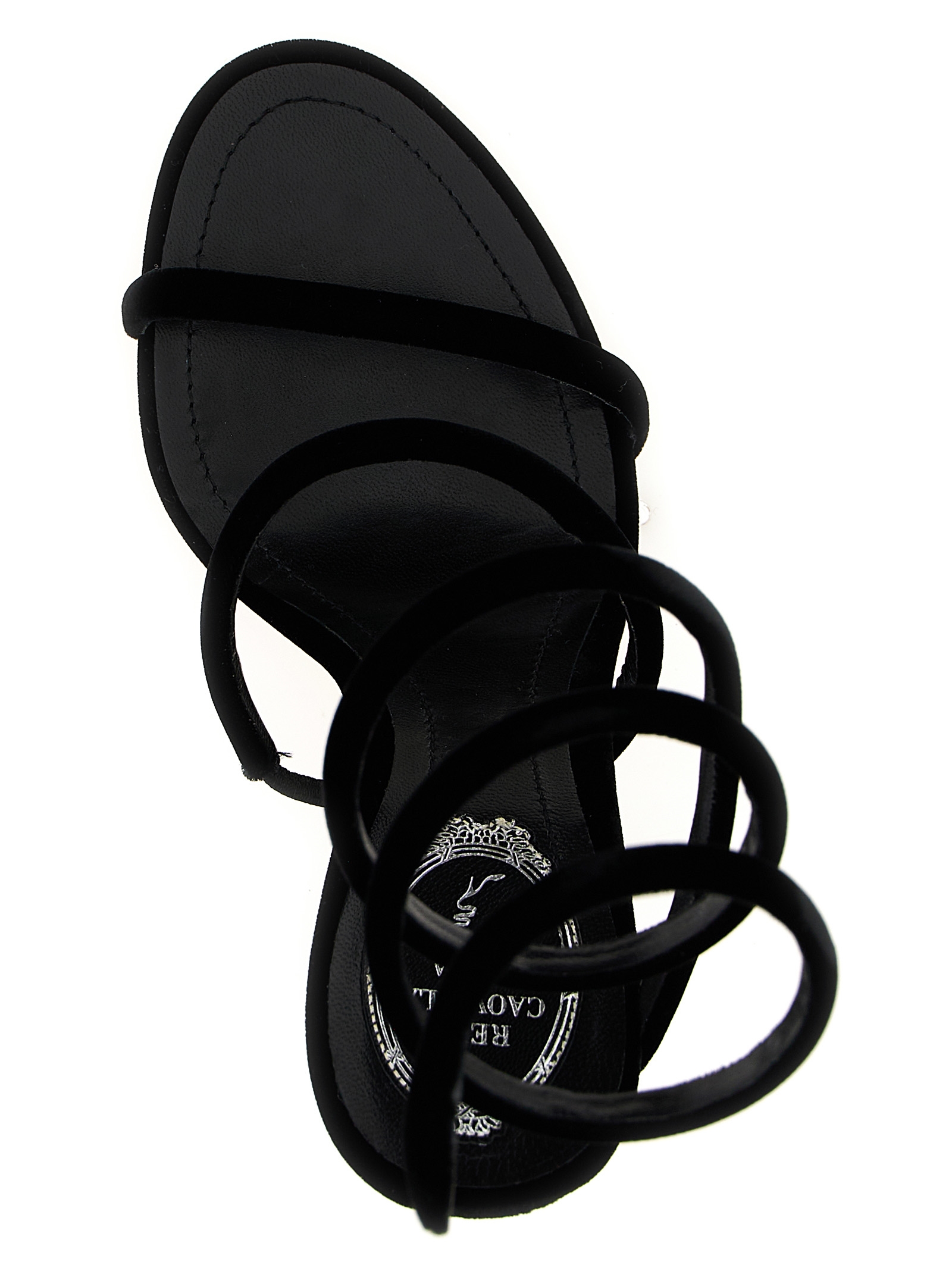 ‘Cleo’ velvet sandals with ankle wrap band, heel, leather sole.