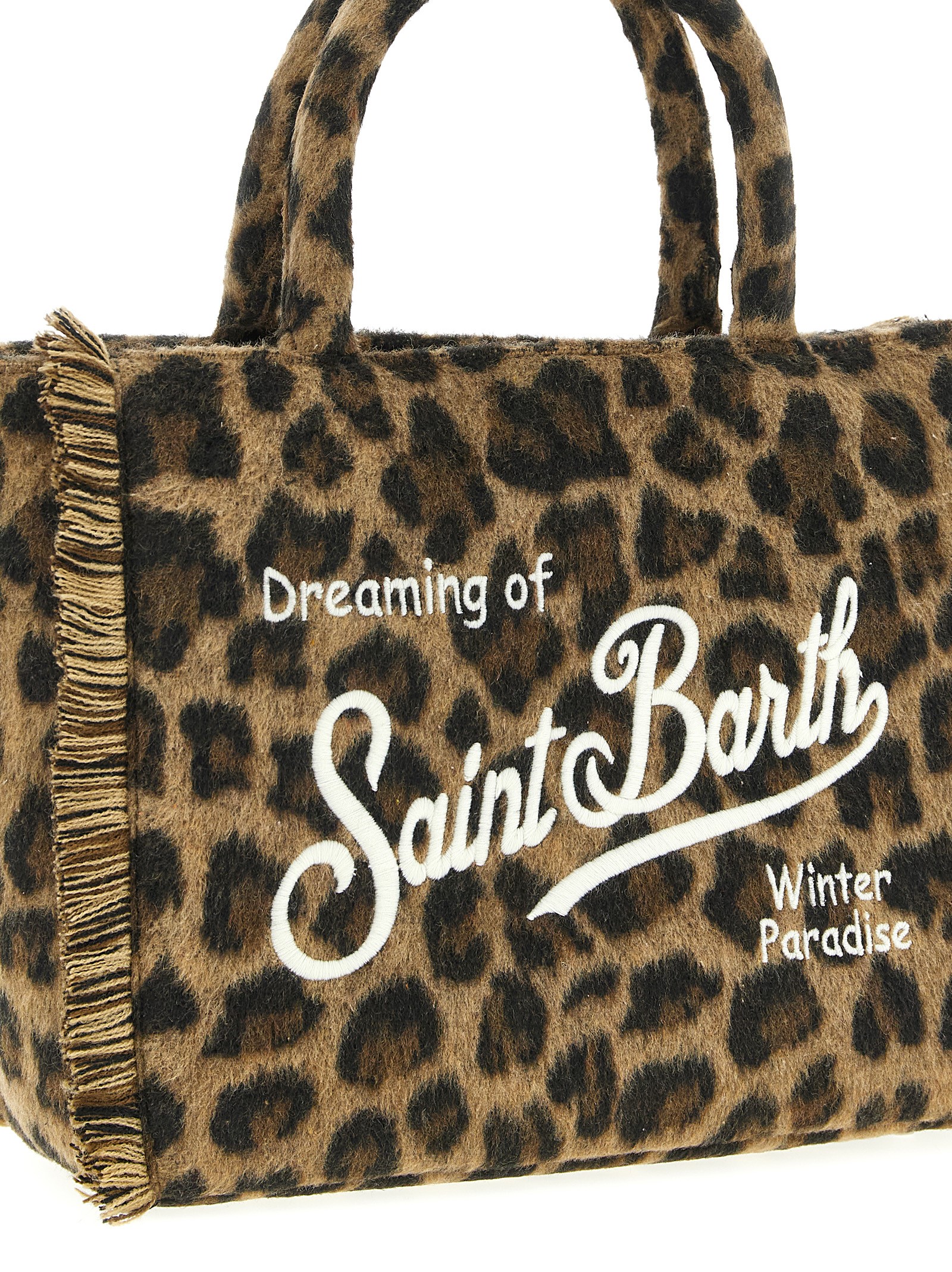 ‘Colette Felt’ leopard-print wool blend handbag with fringed edges, suede lining, contrast front and back logo embroidery, double fixed handle, top zip closure, rigid bottom with metal feet, adjustable and removable shoulder strap.