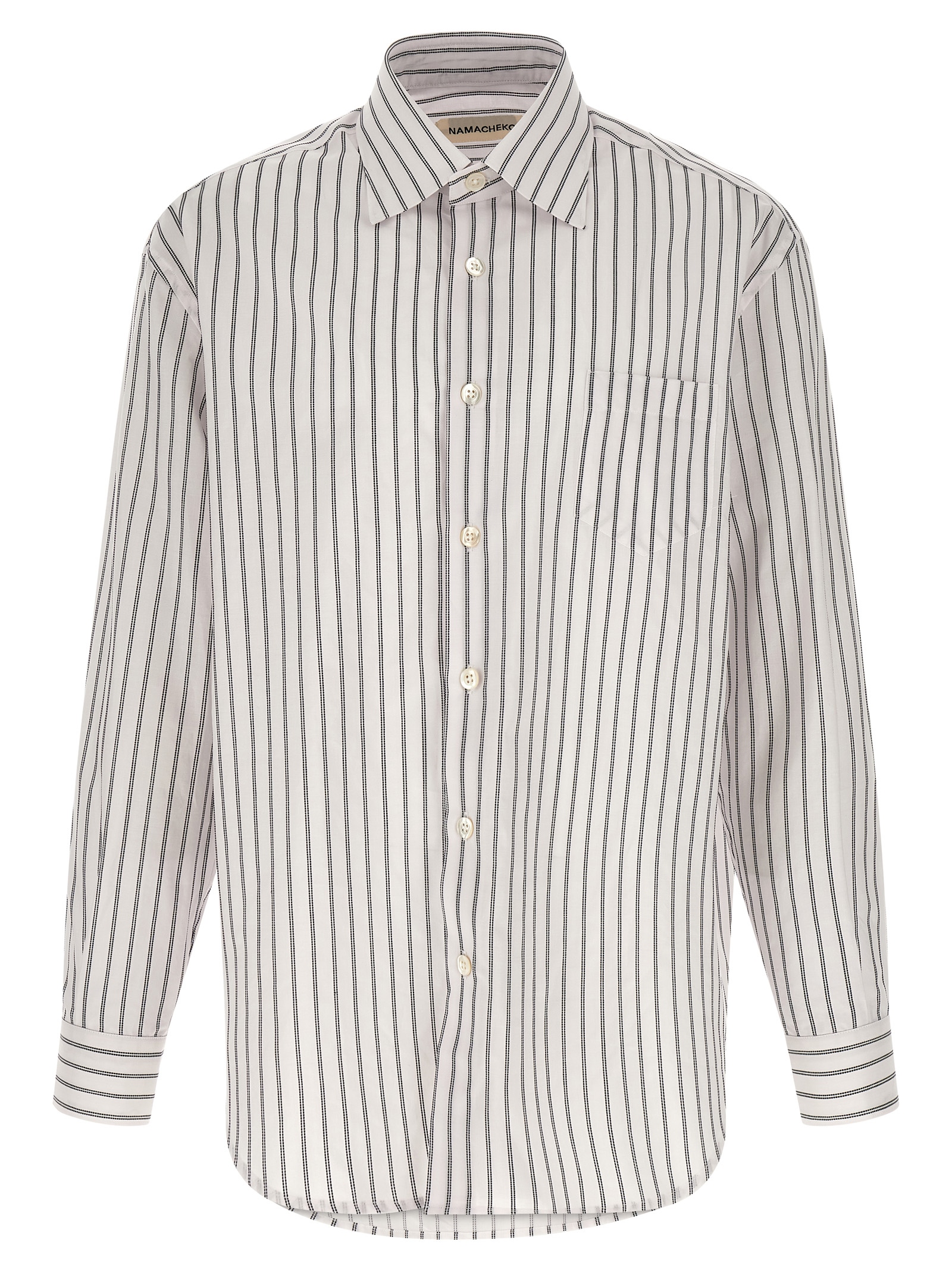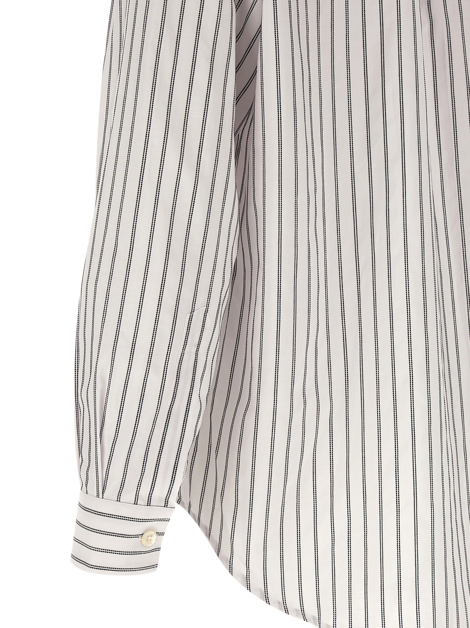 ‘Colt’ cotton shirt with contrast jacquard stripes, wide and square silhouette, narrow collar, breast pocket, front mother-of-pearl button closure, long sleeves with cuffs and dropped shoulder, back rack with cannon pleats, rounded hem.