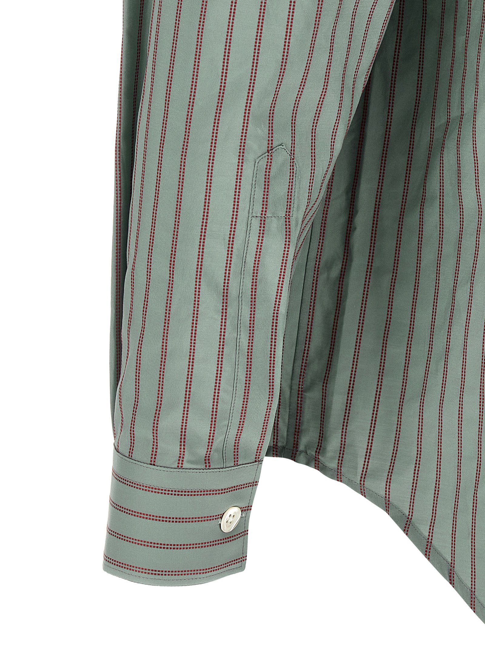 ‘Colt’ cotton shirt with contrast jacquard stripes, wide and square silhouette, narrow collar, breast pocket, front mother-of-pearl button closure, long sleeves with cuffs and dropped shoulder, back rack with cannon pleats, rounded hem.