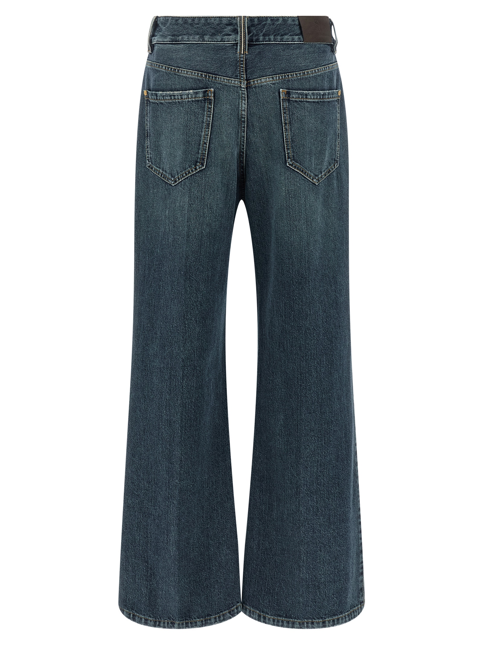 ‘Contemporary Loose’ used-effect Authentic stone washed denim jeans, contrast stitching, wide flared leg, stretched pleat, regular waist, front zip and button closure, five pockets, ‘Monile’ detail and leather logo label at the back.