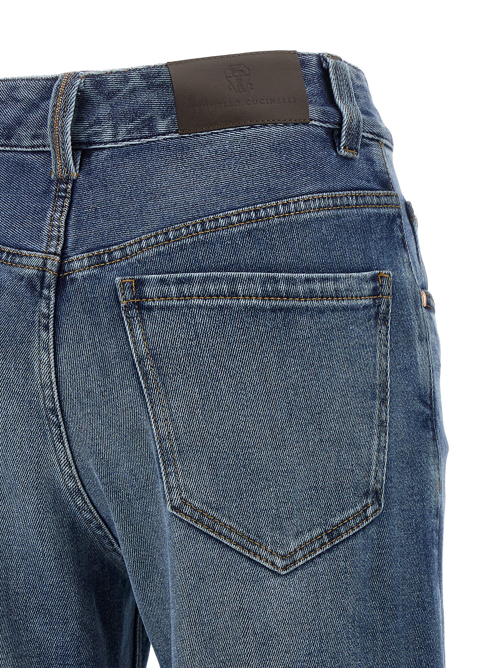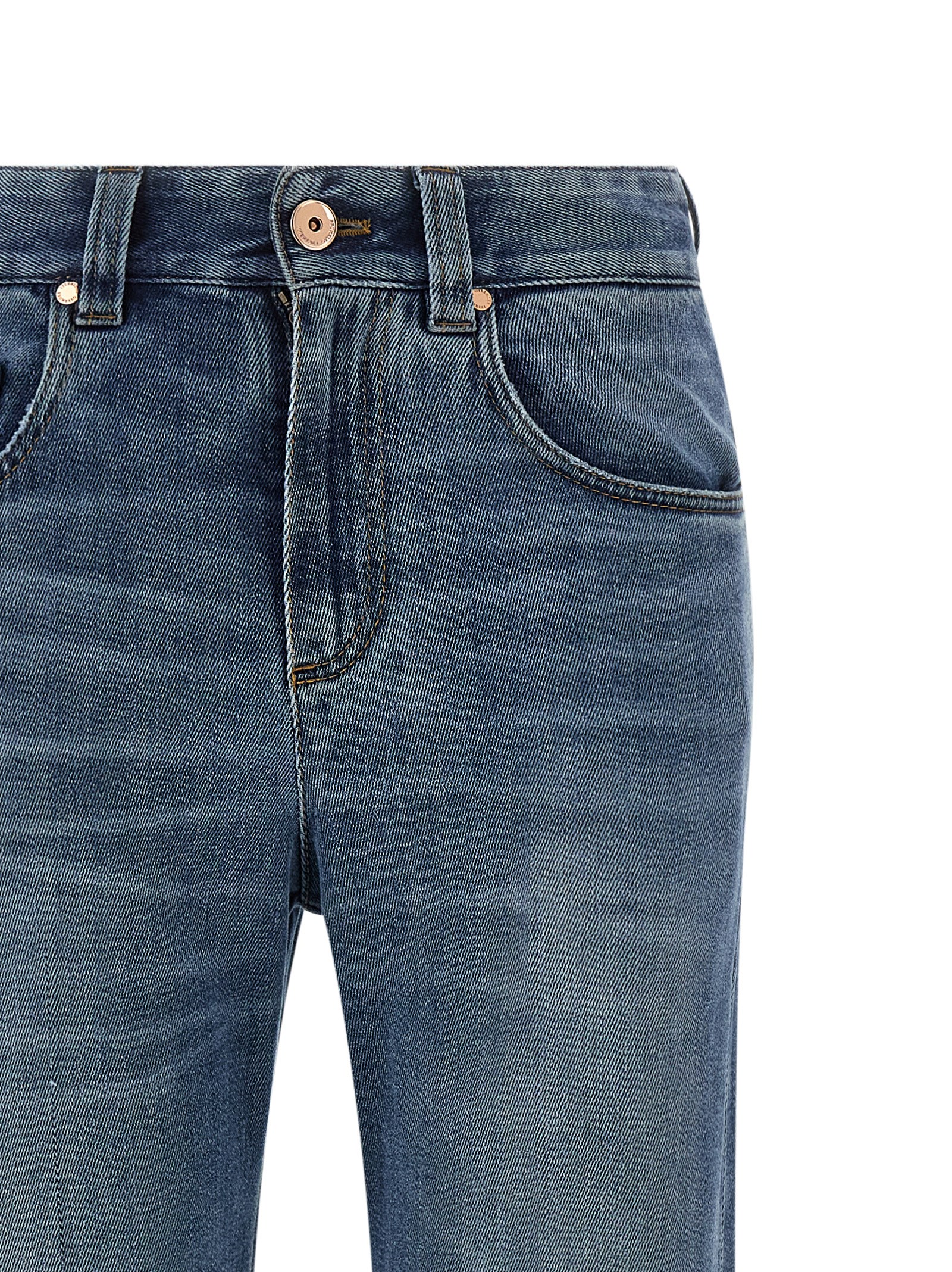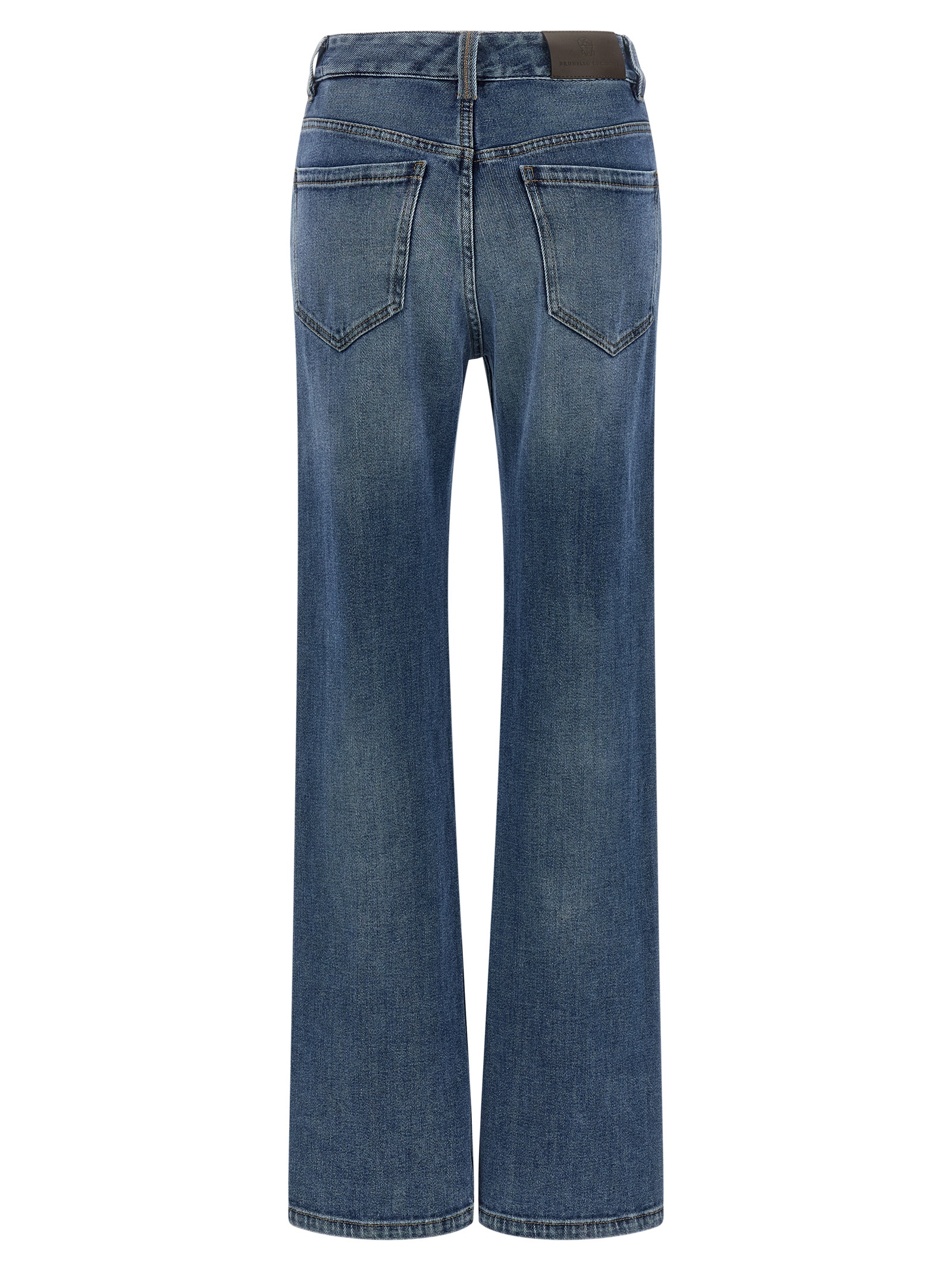 ‘Contemporary Loose’ light stonewashed cotton denim jeans with used effect, straight leg, front zip and button closure, five pockets, Monile detail and back leather logo tag.