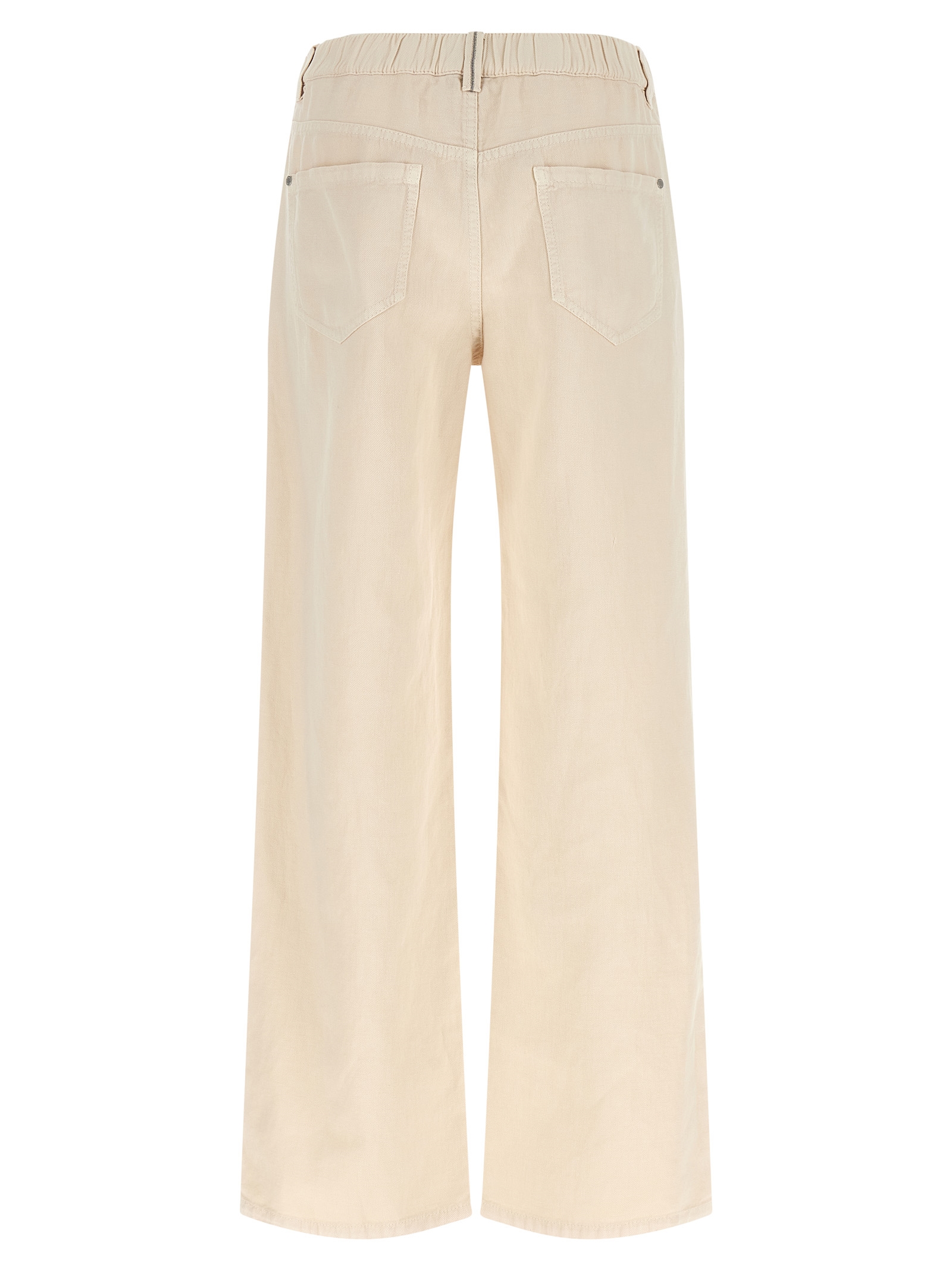 ‘Contemporary’ trousers in cotton and linen cover garment-dyed, pull-up model, relaxed and soft silhouette, wide and straight leg, elastic waistband, front zip and button closure, front pockets with pocket, back patch pockets, back Monile detail at the back.