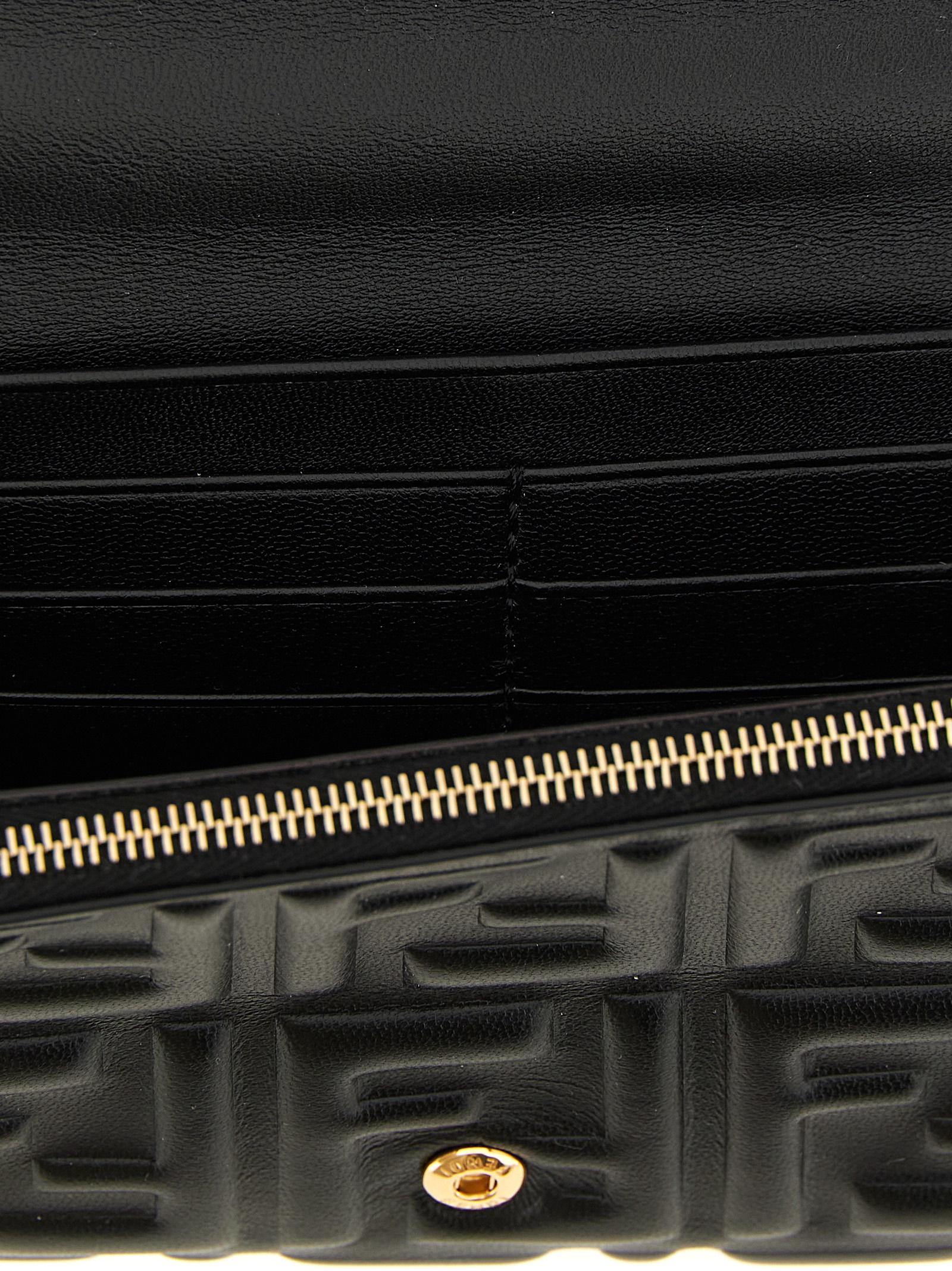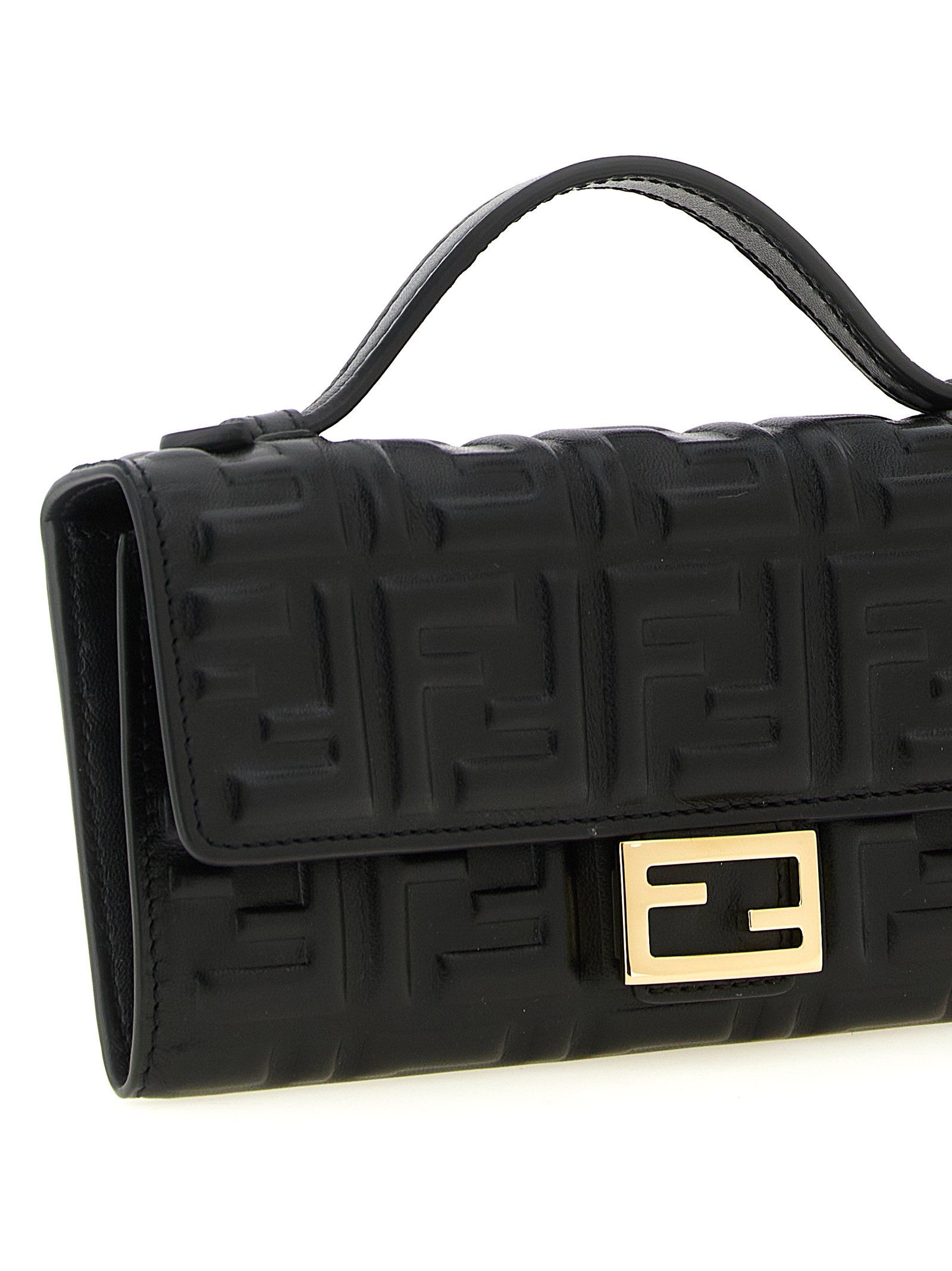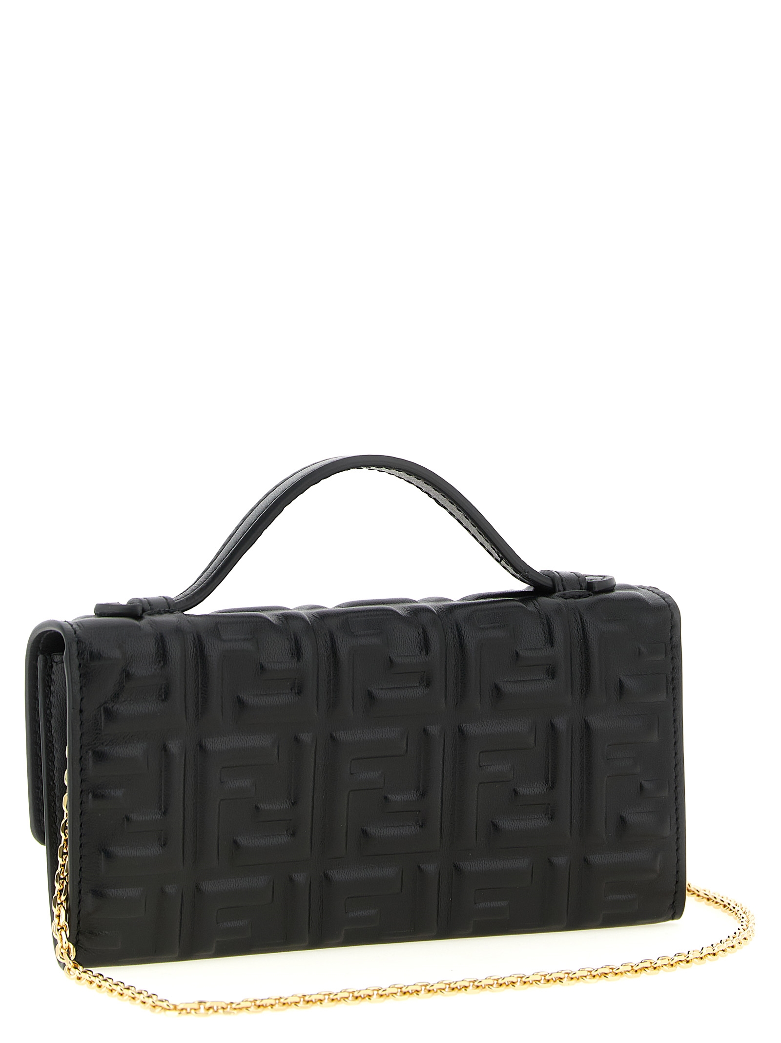 ‘Continental Baguette’ nappa wallet on chain with iconic embossed FF pattern with a three-dimensional effect, fixed top handle, flap closure with snap button and metal ‘Baguette’ logo on the front, removable chain shoulder strap.