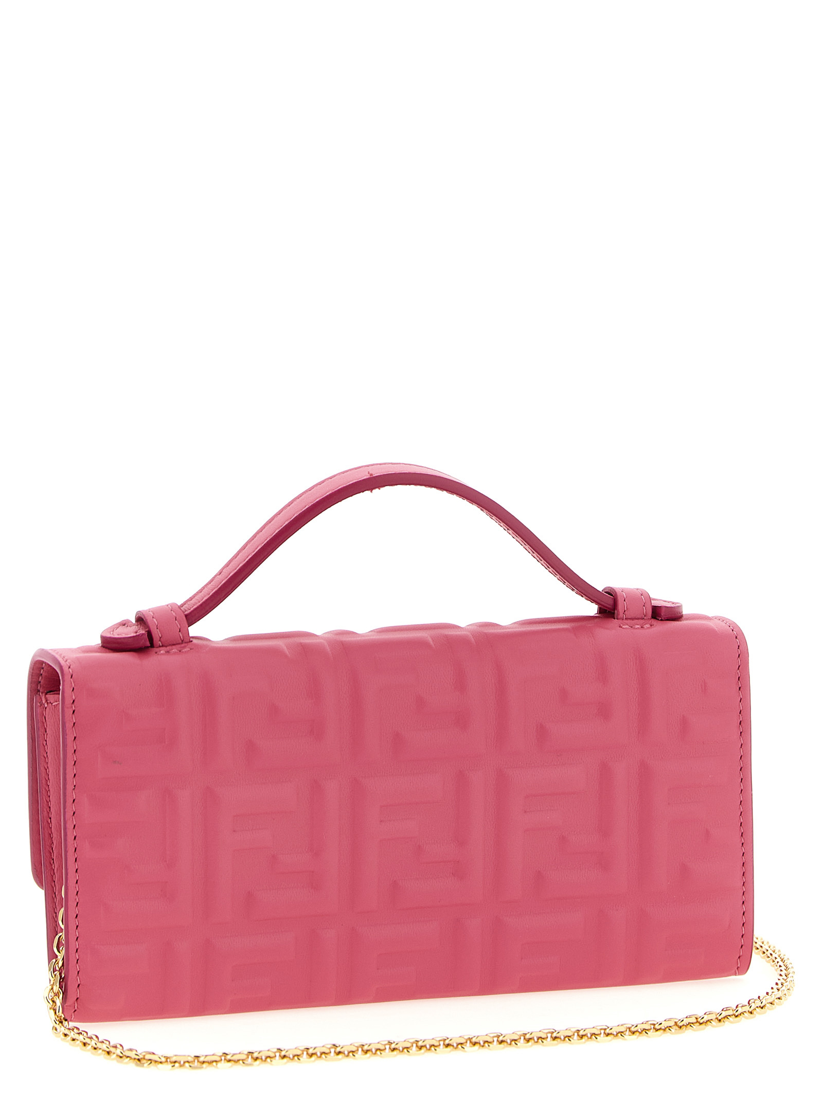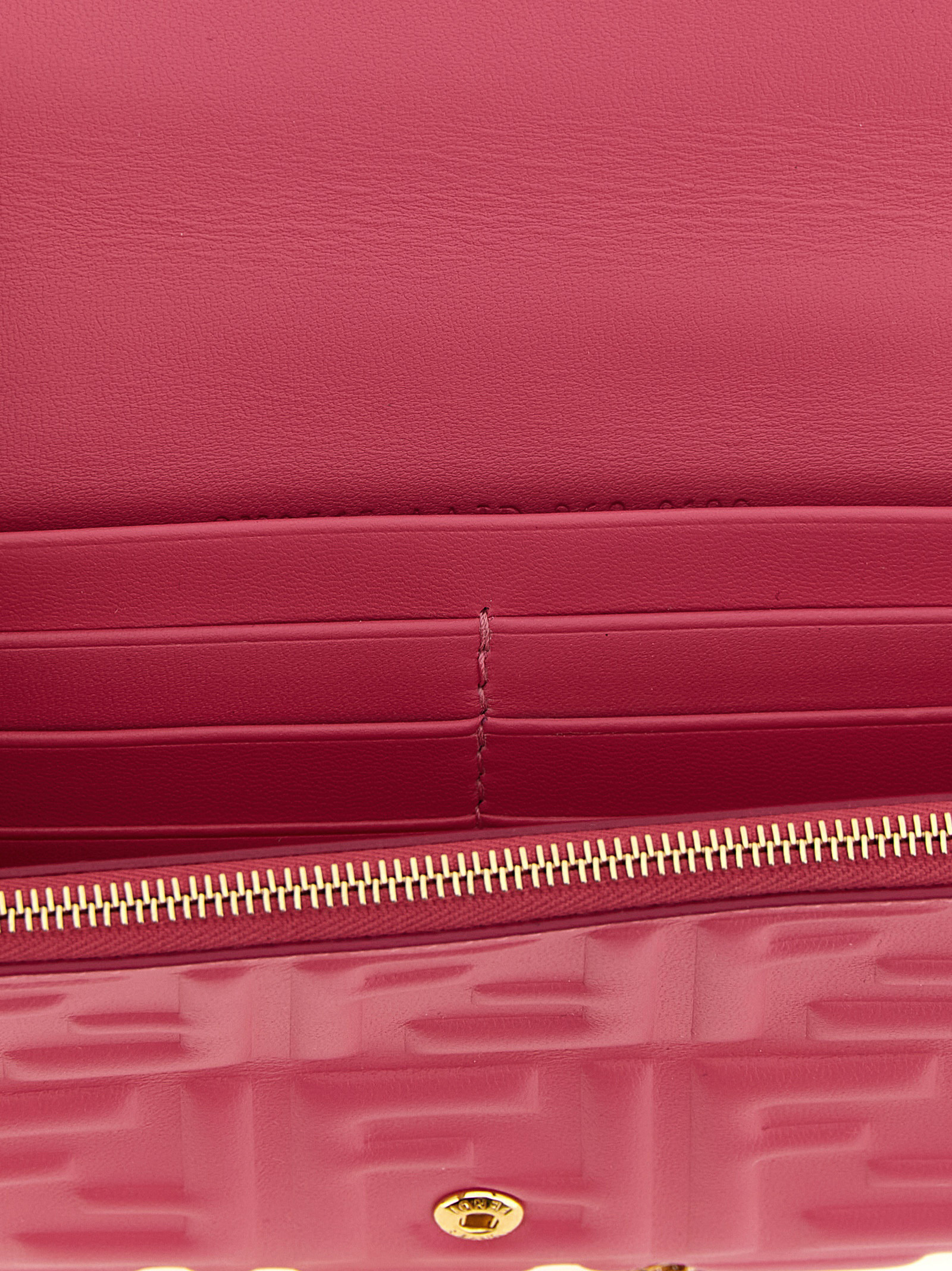 ‘Continental Baguette’ nappa wallet on chain with iconic embossed FF pattern with a three-dimensional effect, fixed top handle, flap closure with snap button and metal ‘Baguette’ logo on the front, removable chain shoulder strap.