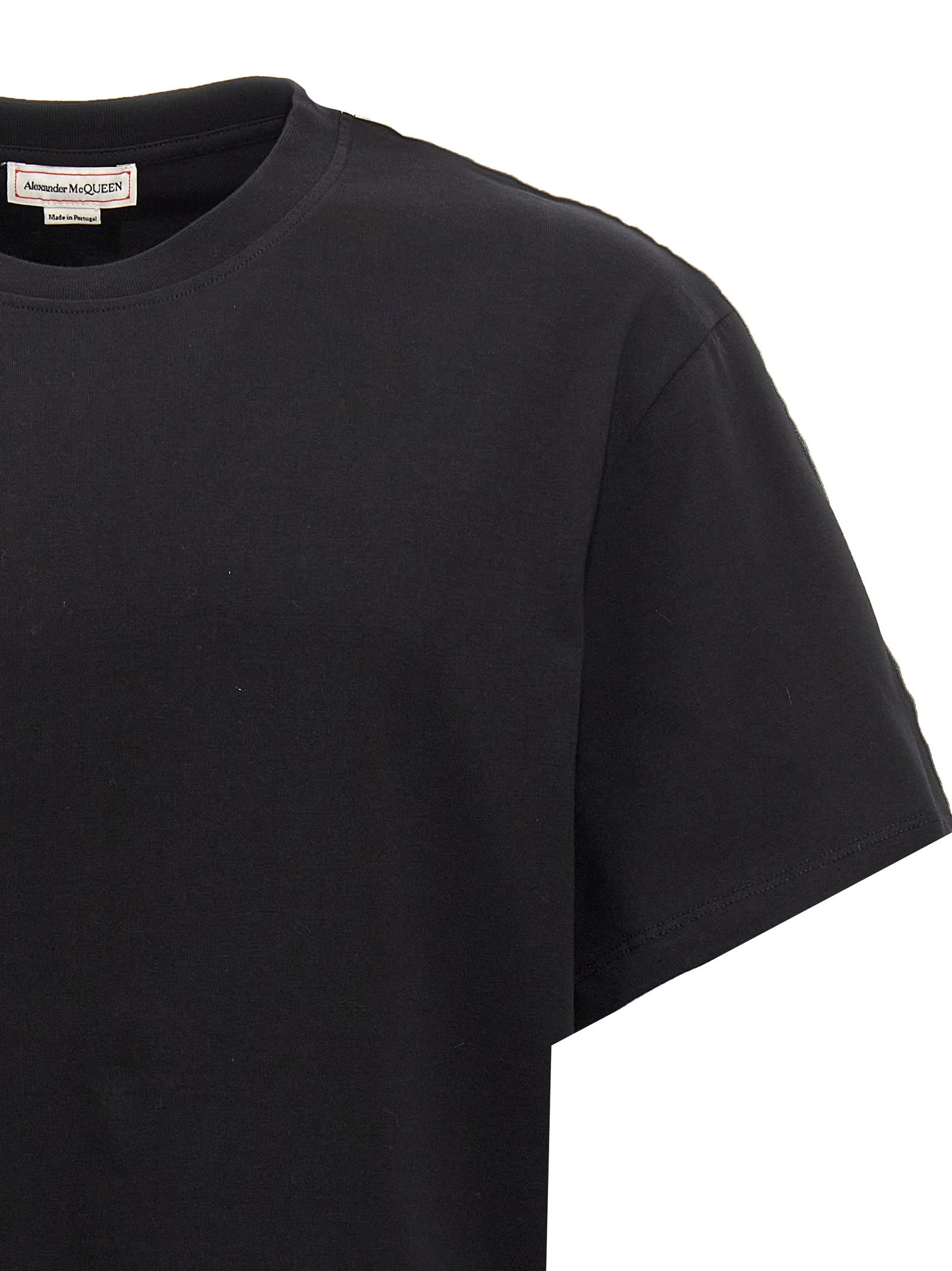 Cotton t-shirt with contrast bands on the shoulders, crew neck, short sleeves.