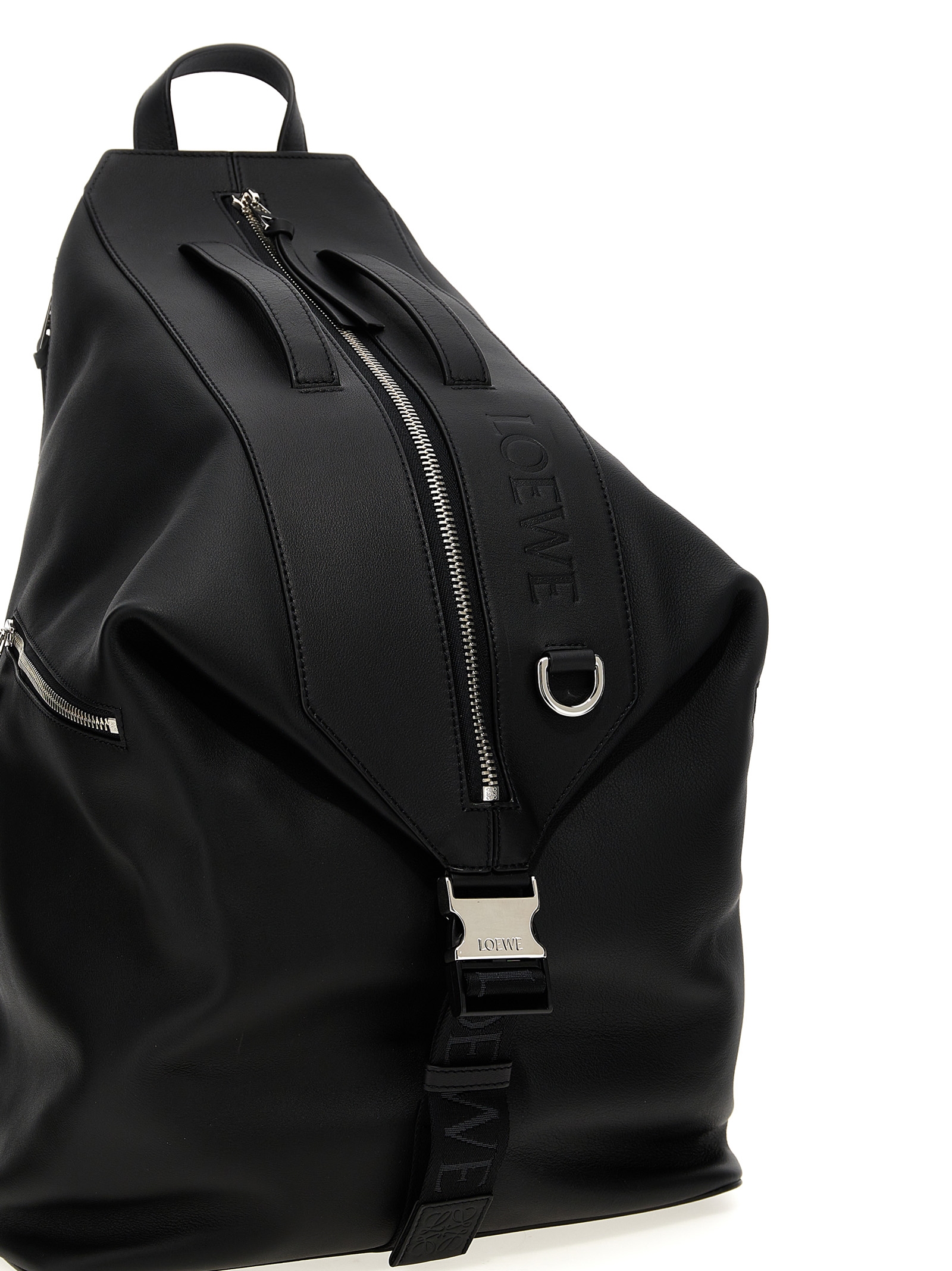 ‘Convertible’ classic calf leather backpack, front buckle that detaches into a duffel bag, embossed logo, zip closure, fixed handle, pockets, adjustable padded shoulder straps, mesh backrest.