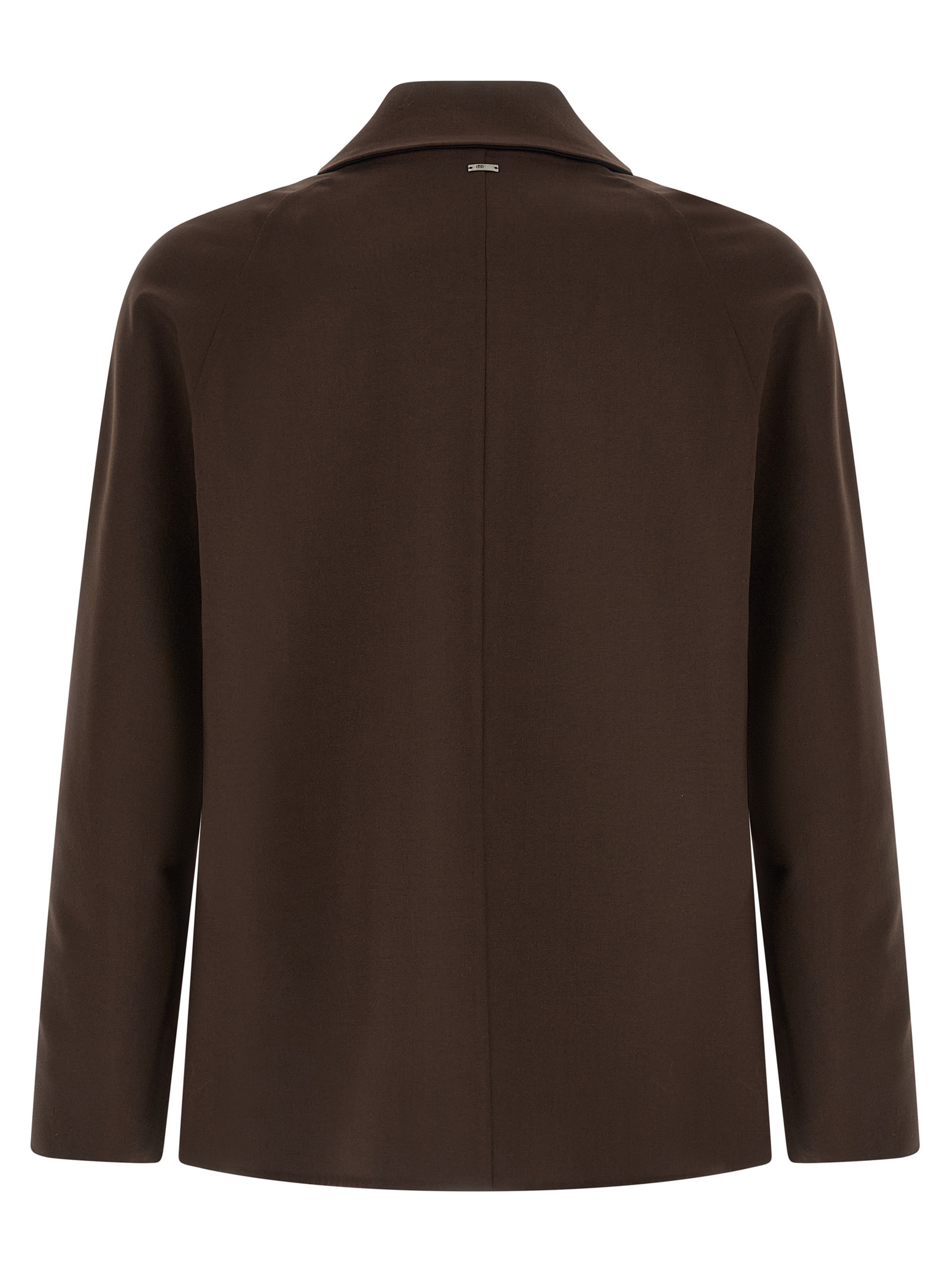 Cool wool jacket with shirt collar, flared silhouette, front button closure, pockets, long sleeves, unlined.