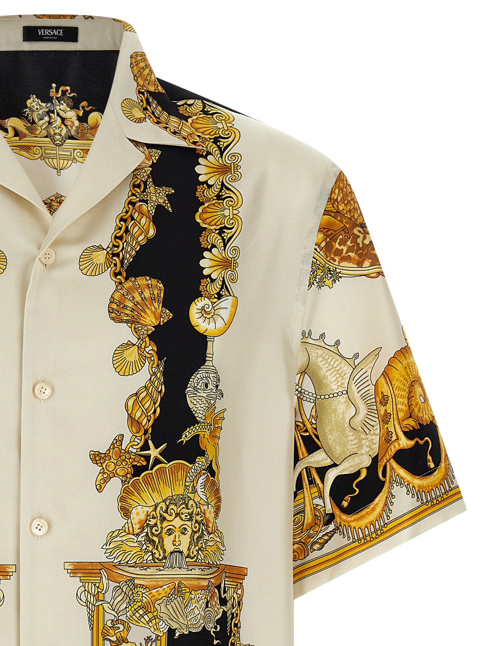 All-over ‘Coral Theatre’ print silk twill shirt, front button closure, short sleeves, side slits.