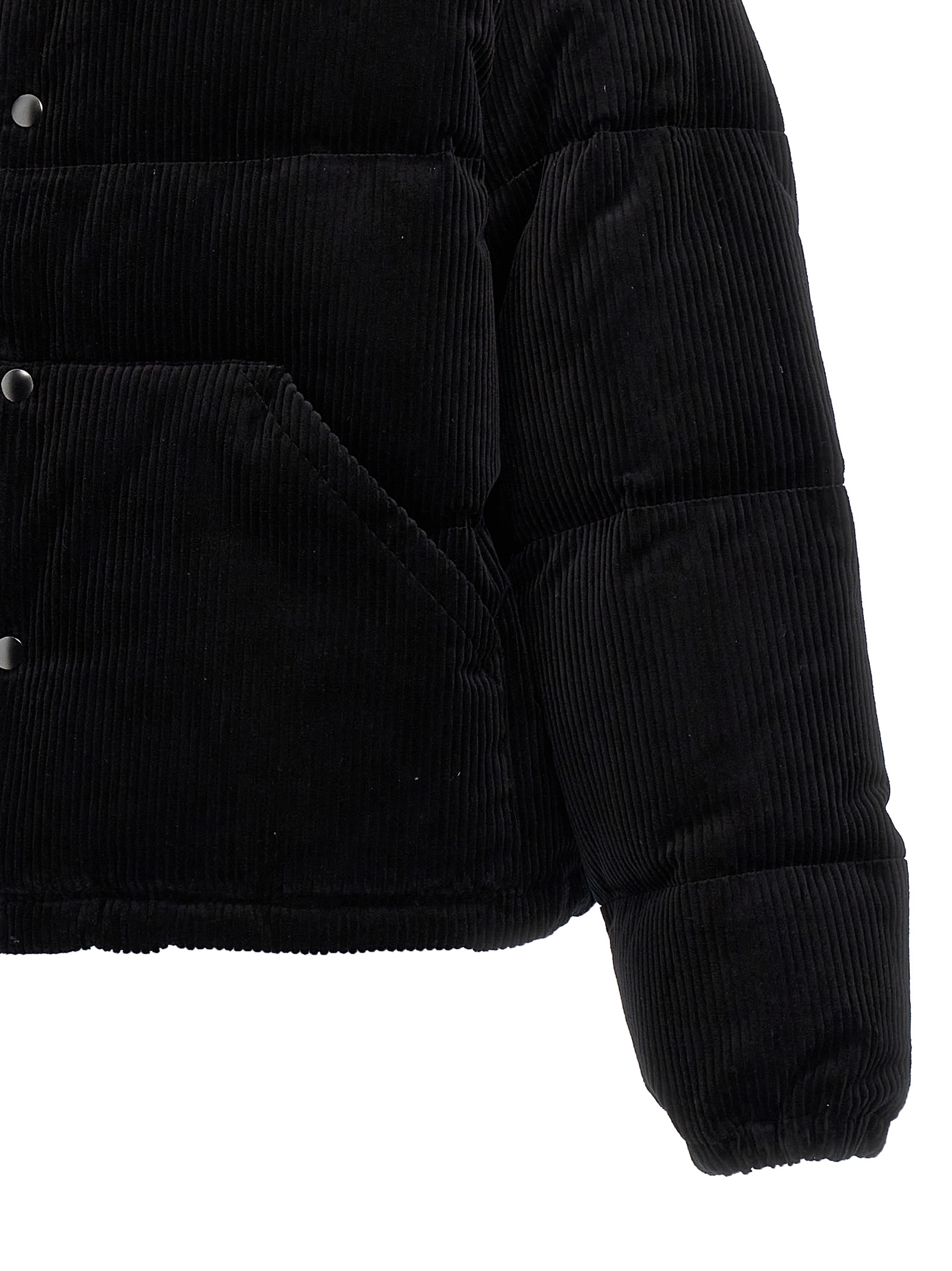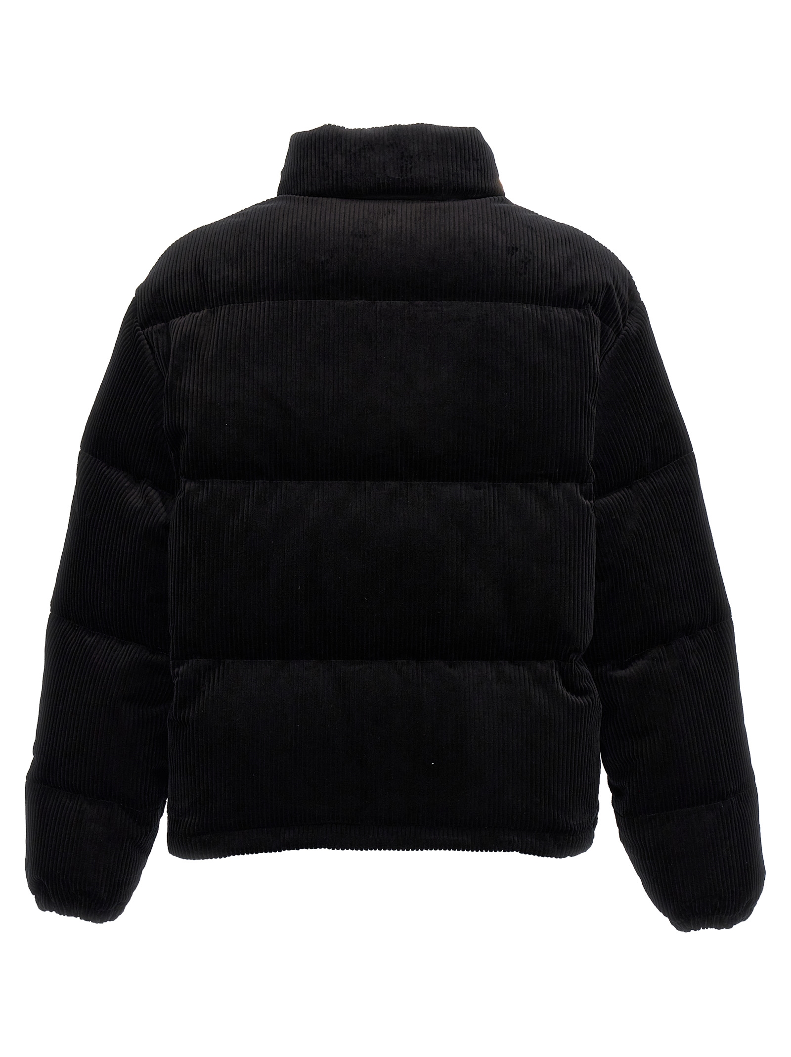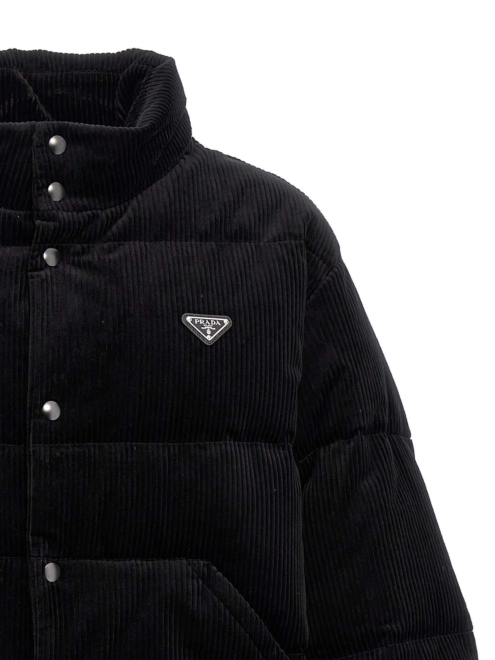 Corduroy down jacket, feather padding, zip and button closure, triangle metal enamel logo appliqué, removable hood, pockets, long sleeves with elastic cuffs, adjustable drawstring at the hem.