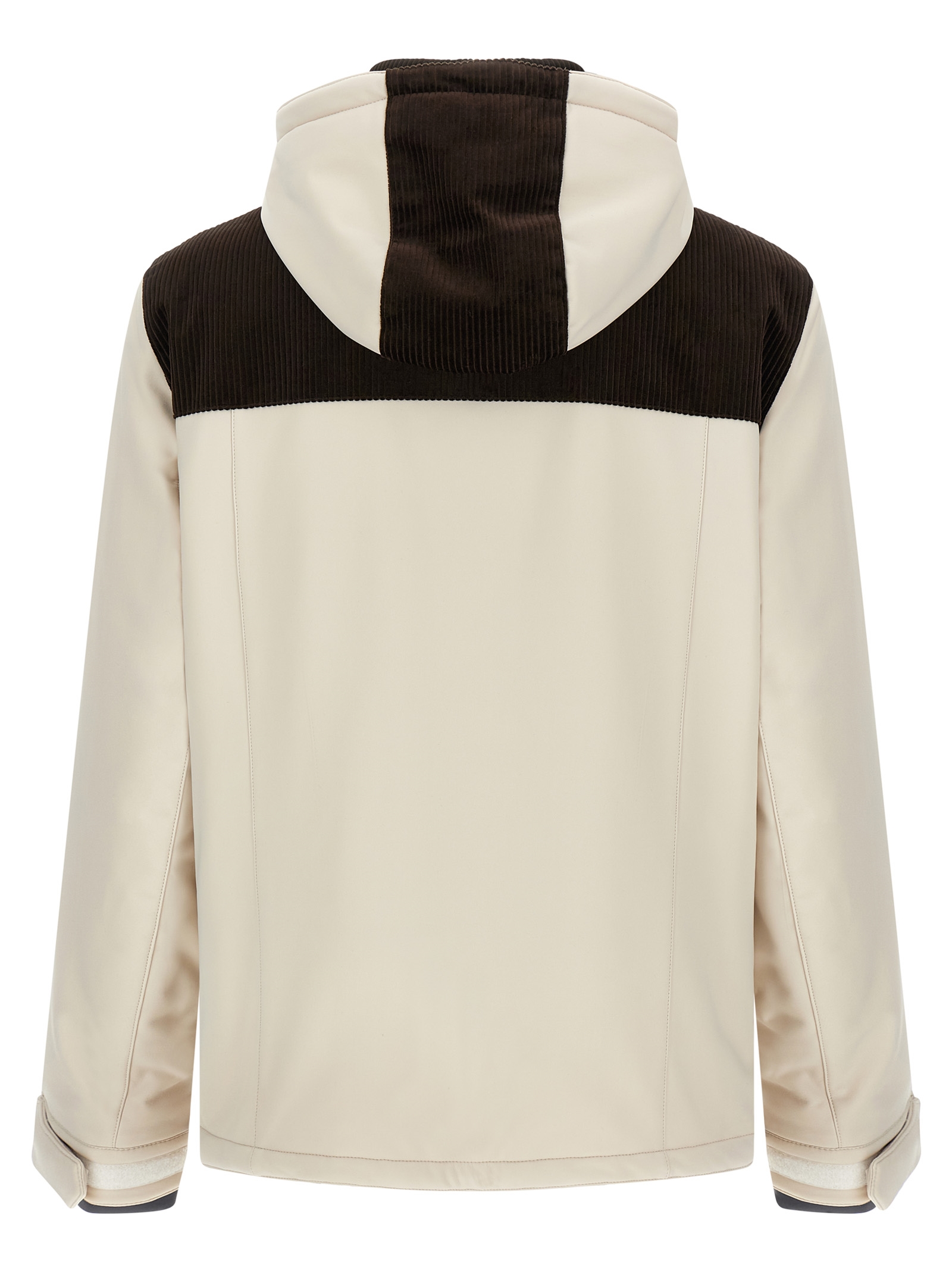 Ski jacket in water-repellent technical fabric with corduroy inserts, quilted nylon lining with goose down padding, adjustable and removable hood, standing collar, logo embroidery and front zip closure, pockets, long sleeves with stretch knit cuffs, gaiter and drawstring on the hem.