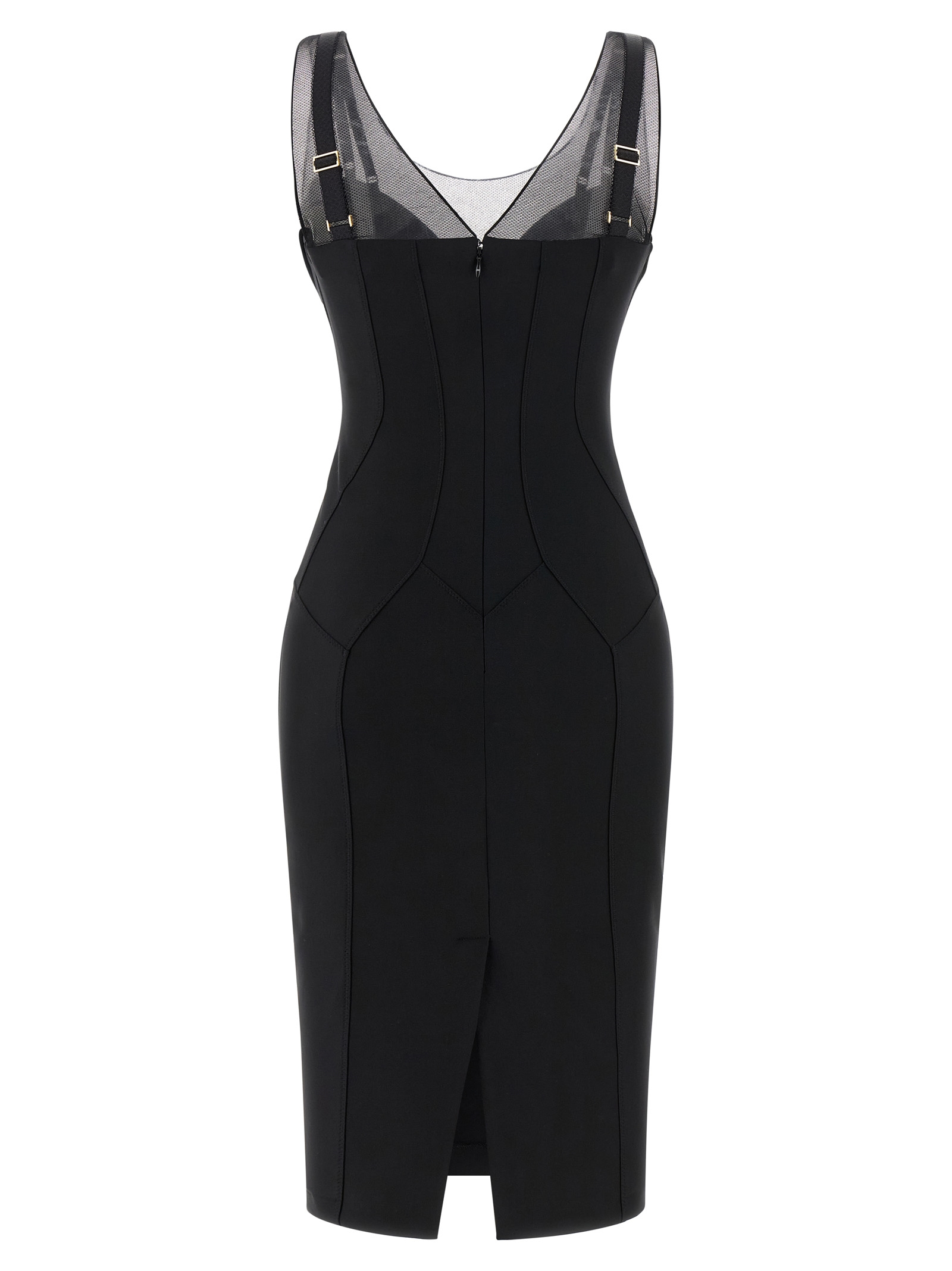 Light jersey midi dress with tone-on-tone tulle inserts, bustier construction with zigzag stitching, pre-shaped and padded cups, lingerie-inspired elastics on shoulders and hips, adjustable shoulder straps, sleeveless, zip closure and back split.