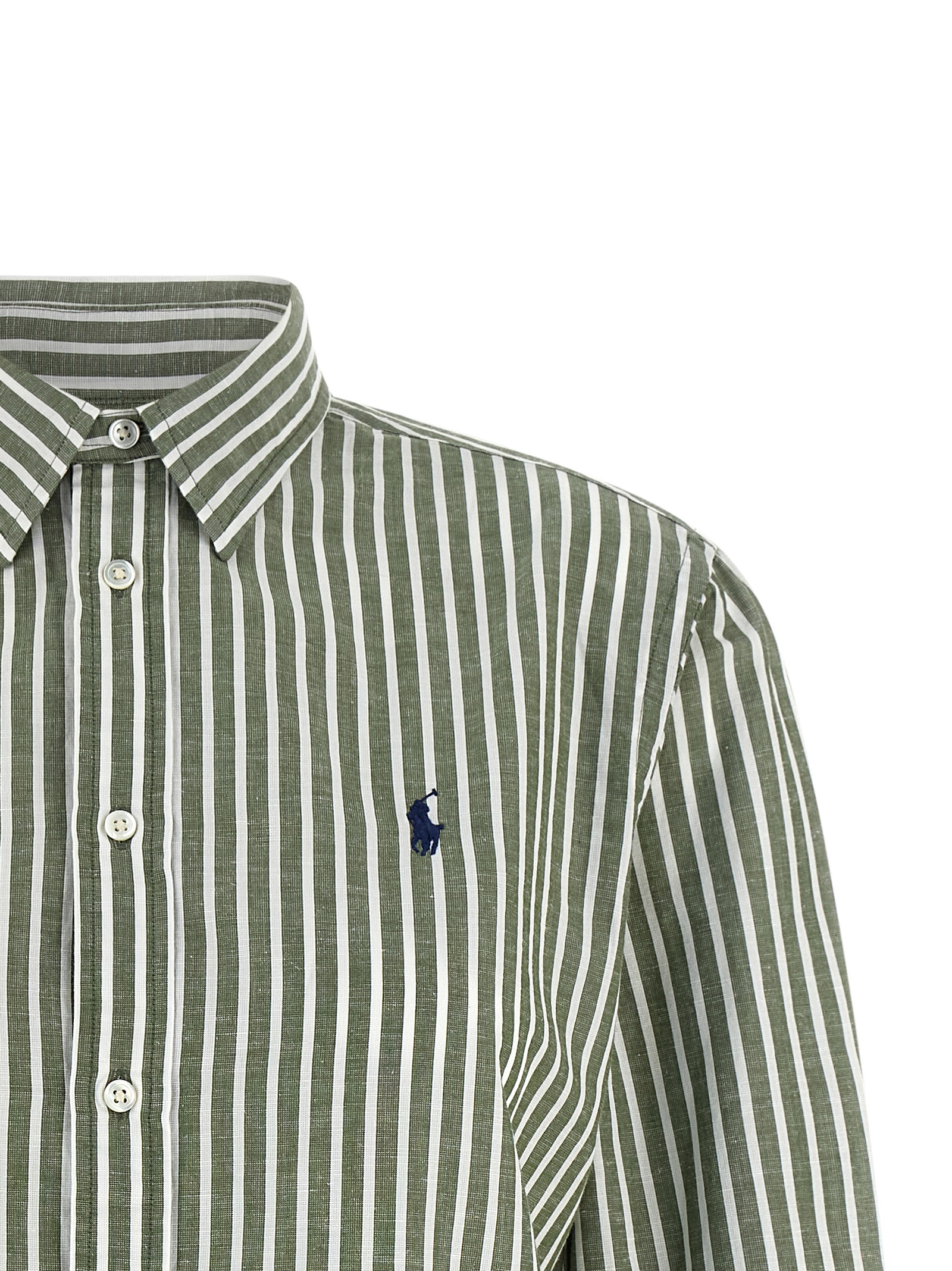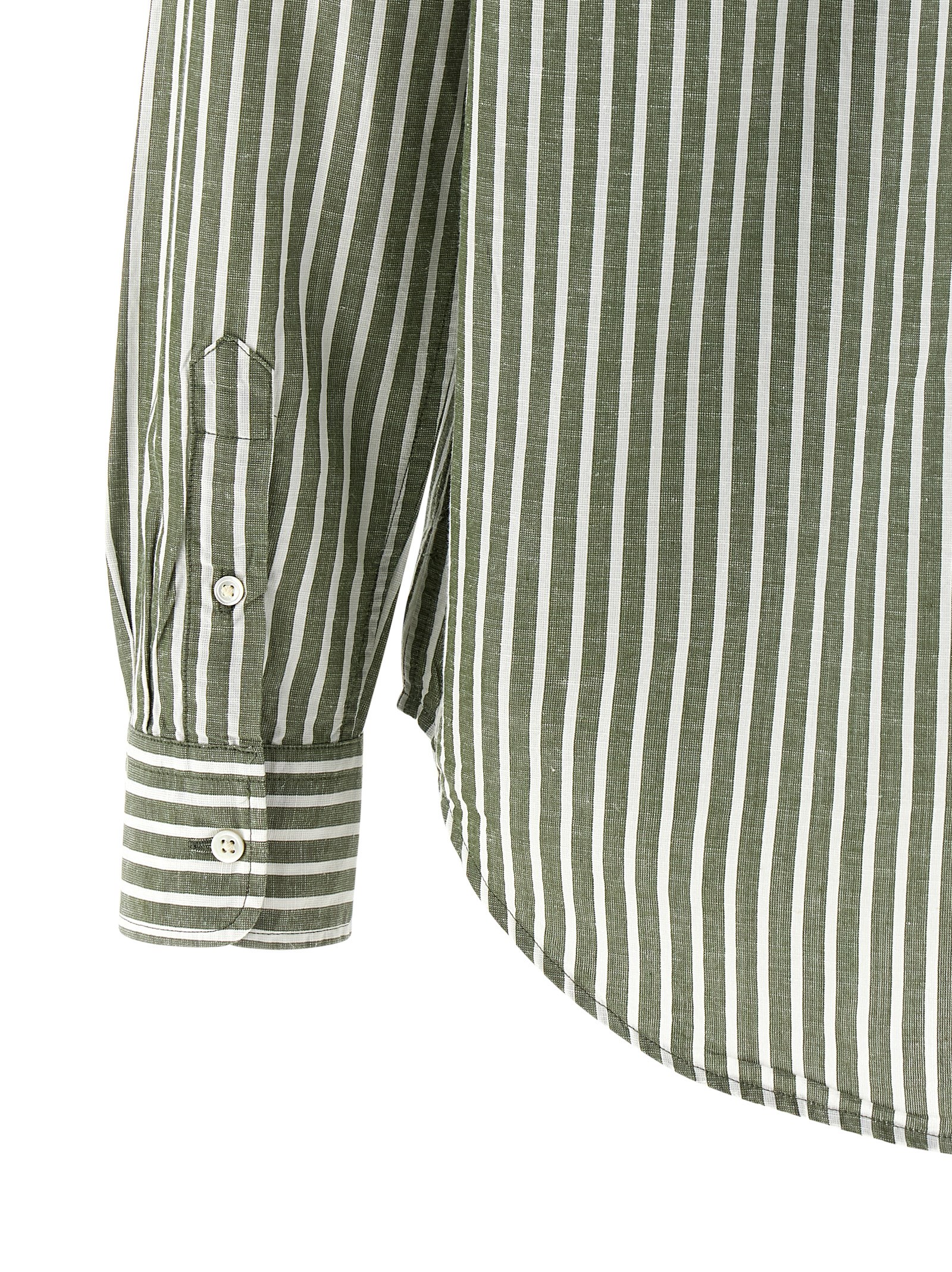 Striped cotton and linen blend shirt dyed in thread, ‘Pony’ logo embroidery and mother-of-pearl button closure on the front, pointed collar, long cuffed sleeves, back rack with cannon pleats, rounded hem.
