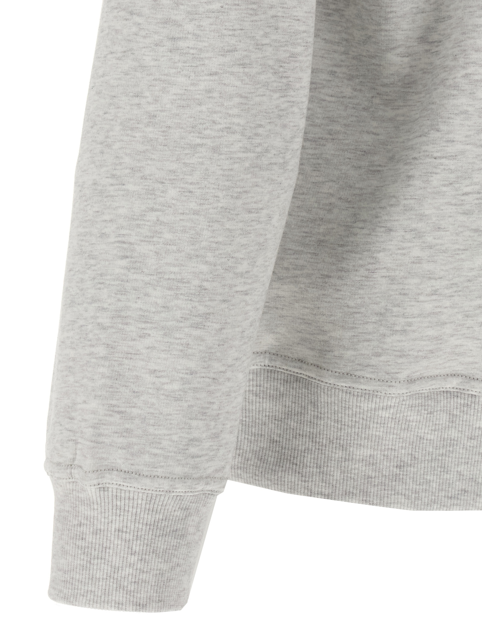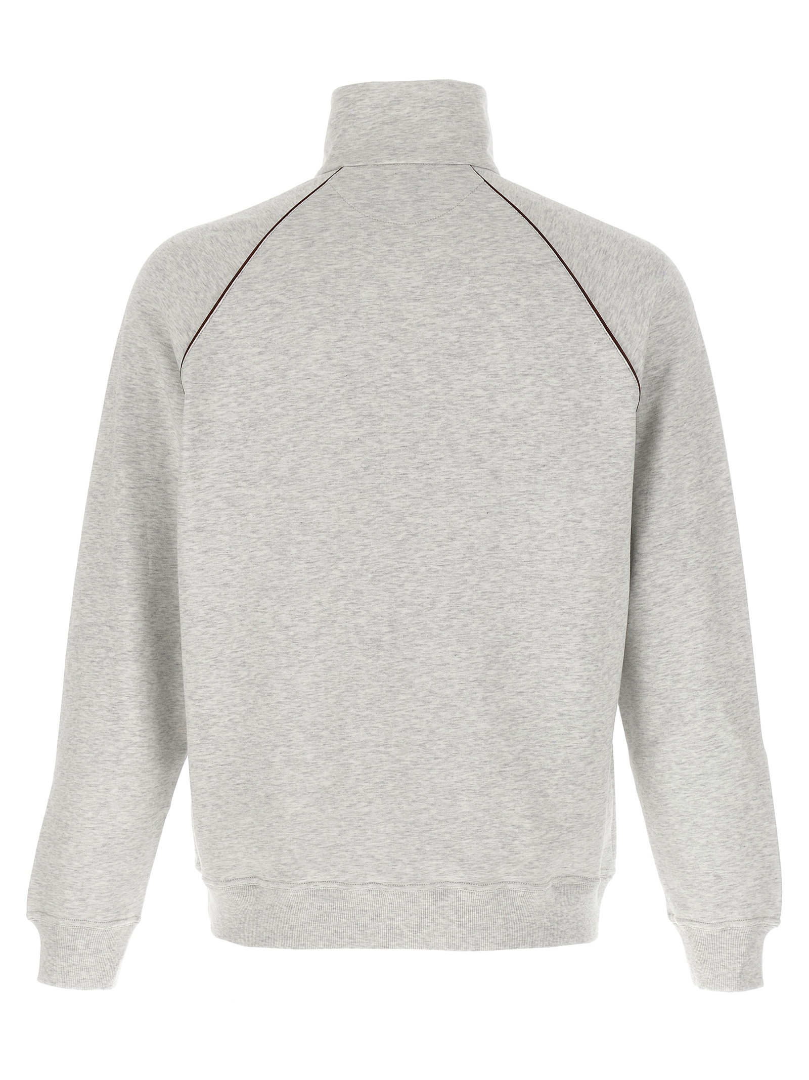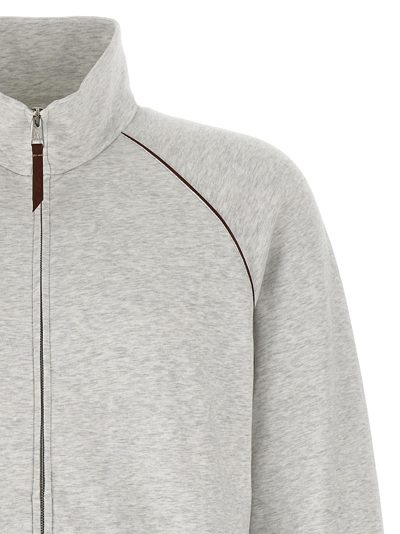 Melange gauze cotton sweatshirt with leather details, front zip closure, high neck, pockets, long cuffed sleeves.