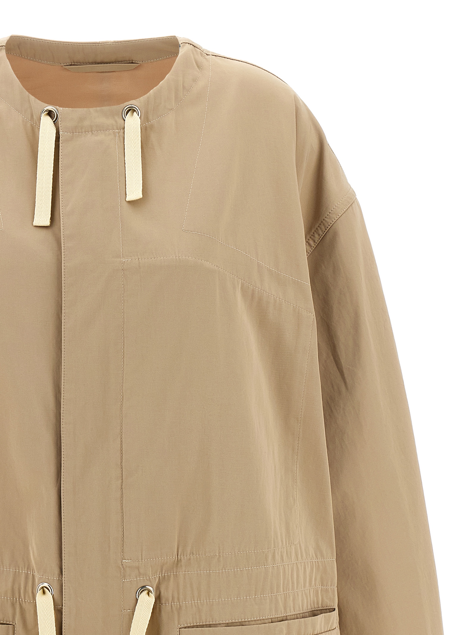 Cotton parka with drawstring crewneck, zip closure and front snap buttons, unlined, drawstring at the waist, pockets, long sleeves with dropped shoulders, elastic hem.