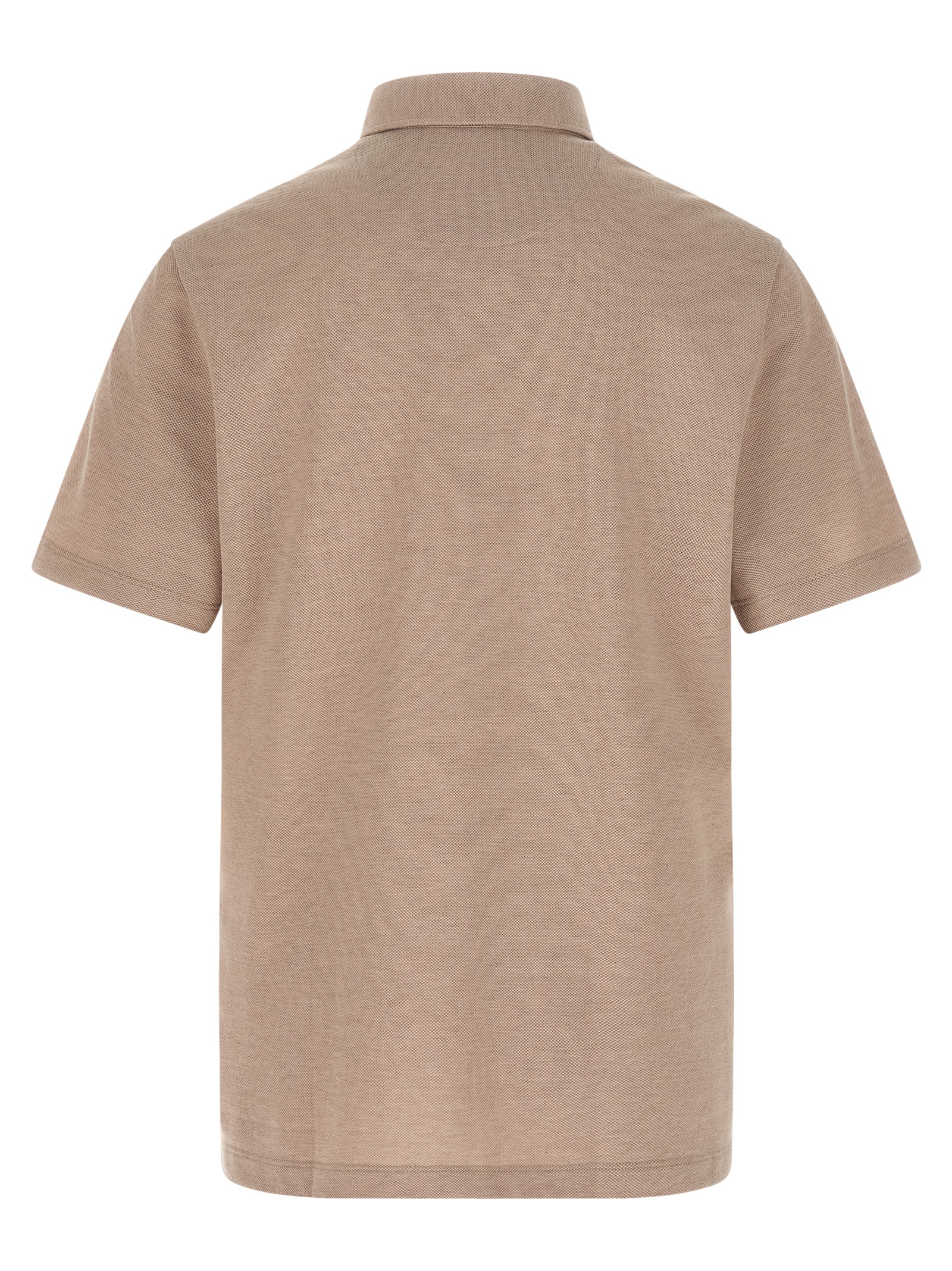 Cotton piqué polo shirt, tone-on-tone leather fly with front embossed logo, collar and buttons, short sleeves, side slits.