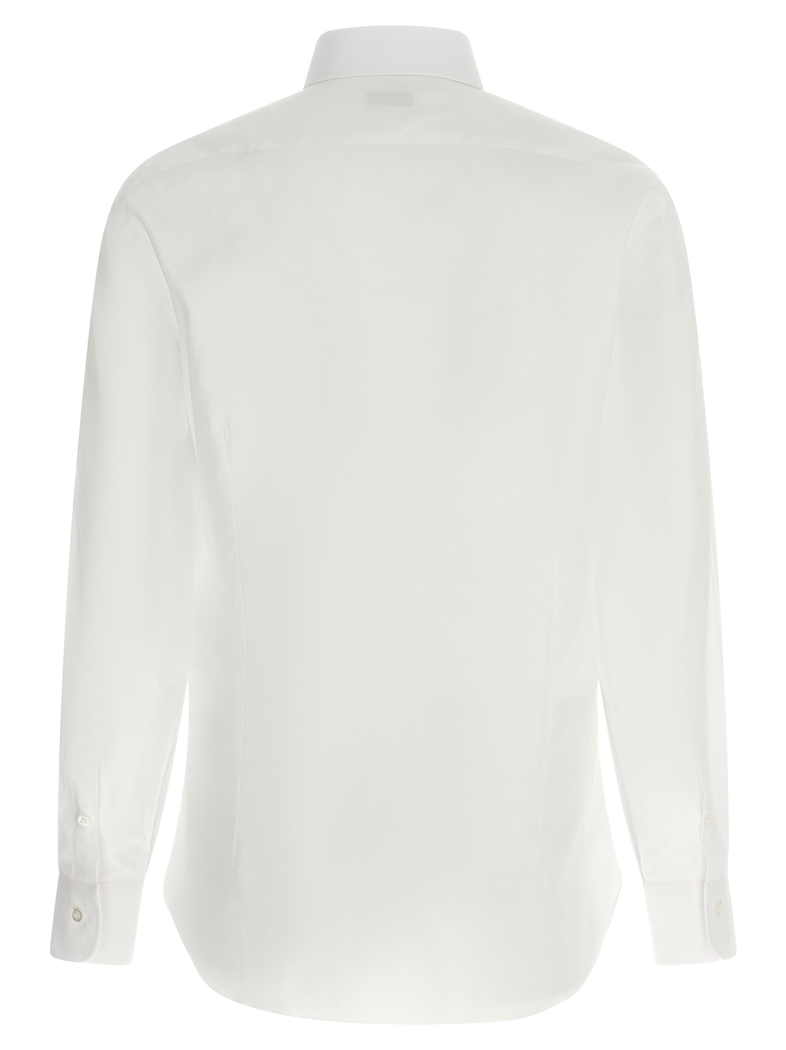 Hand-stitched cotton shirt, front mother-of-pearl button closure with classic lily stitching and embroidered buttonholes, long sleeves with round cuffs, rounded hem with tone-on-tone satin logo detail on the side slits.