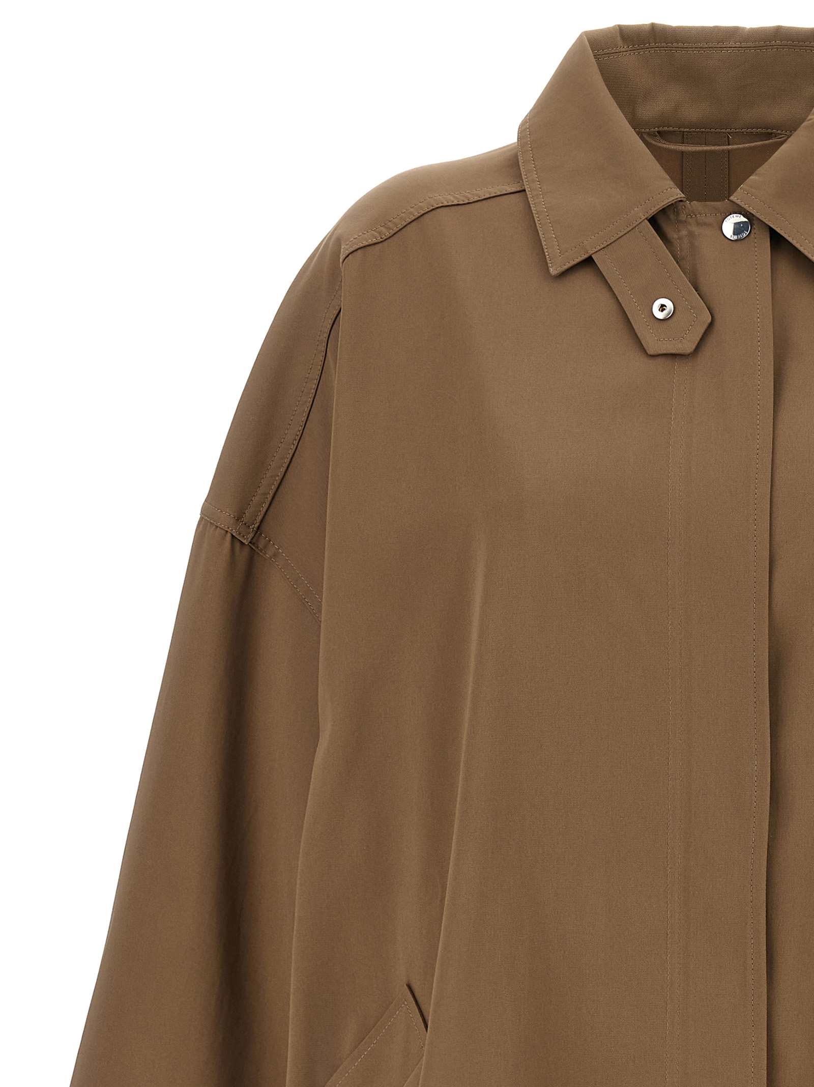 Medium-weight cotton trench coat with A-shaped silhouette, front zip and snap button closure, pockets, long sleeves with adjustable strap and dropped shoulder, unlined.