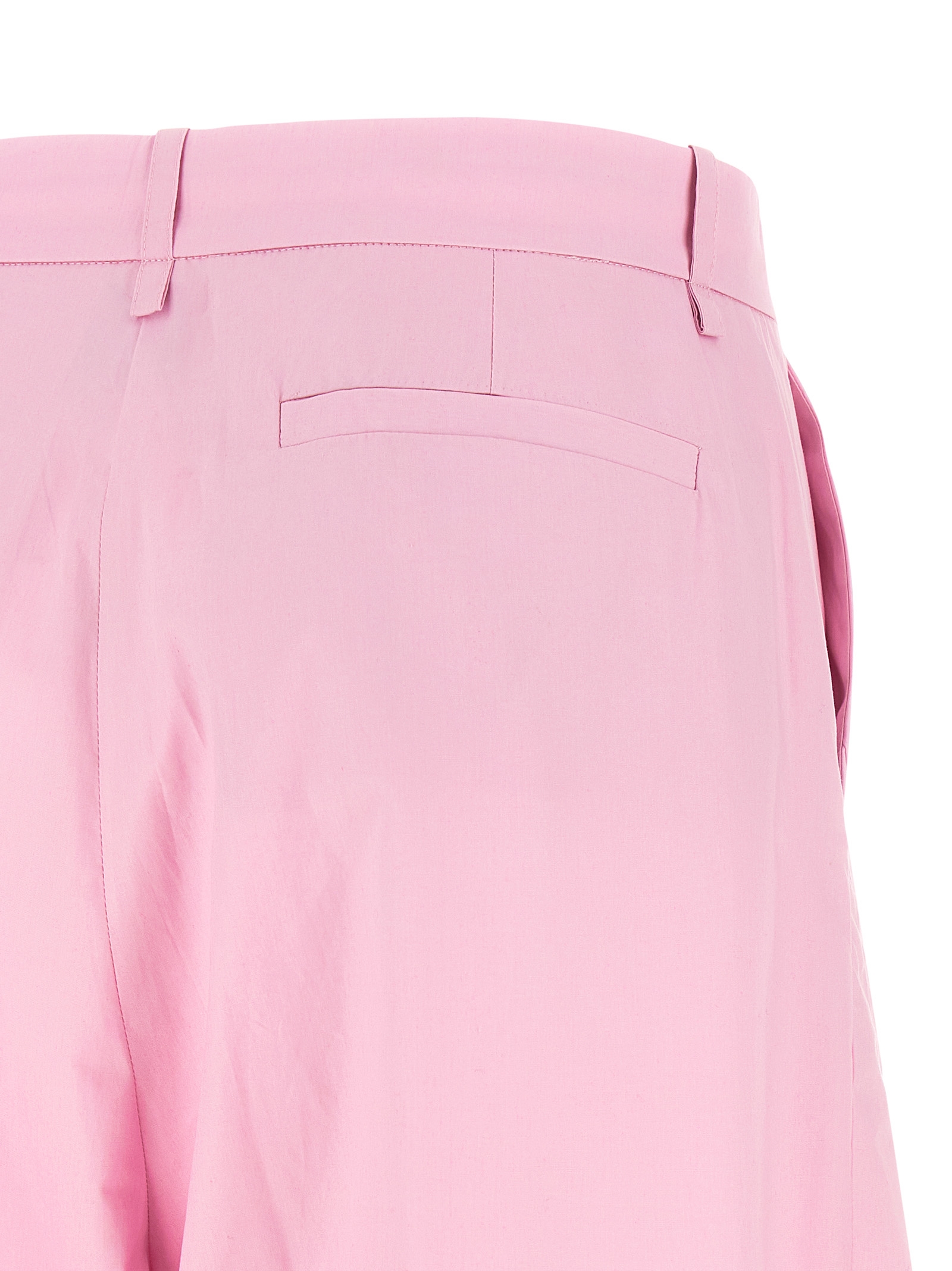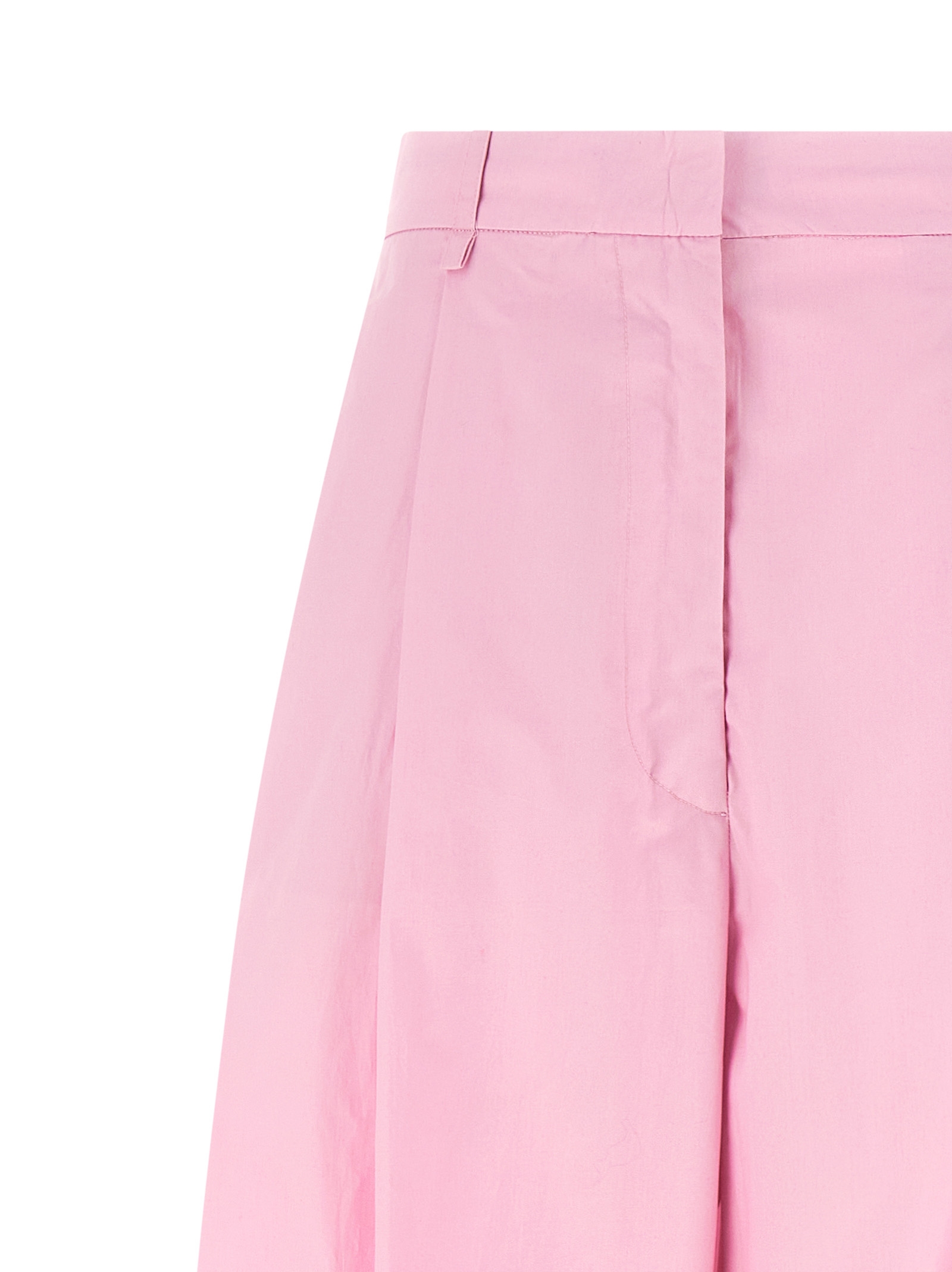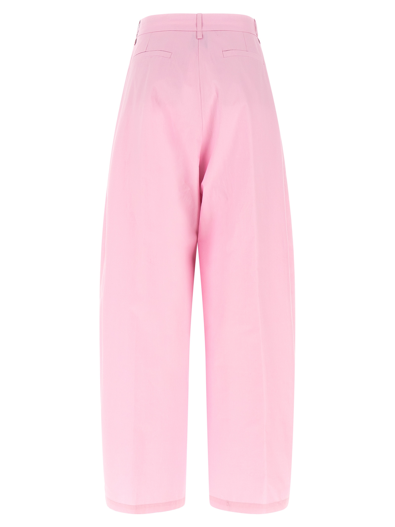 Cotton poplin pants, extra wide and curved leg, pins, hook and front button zip closure, front American pockets, back welt pockets.