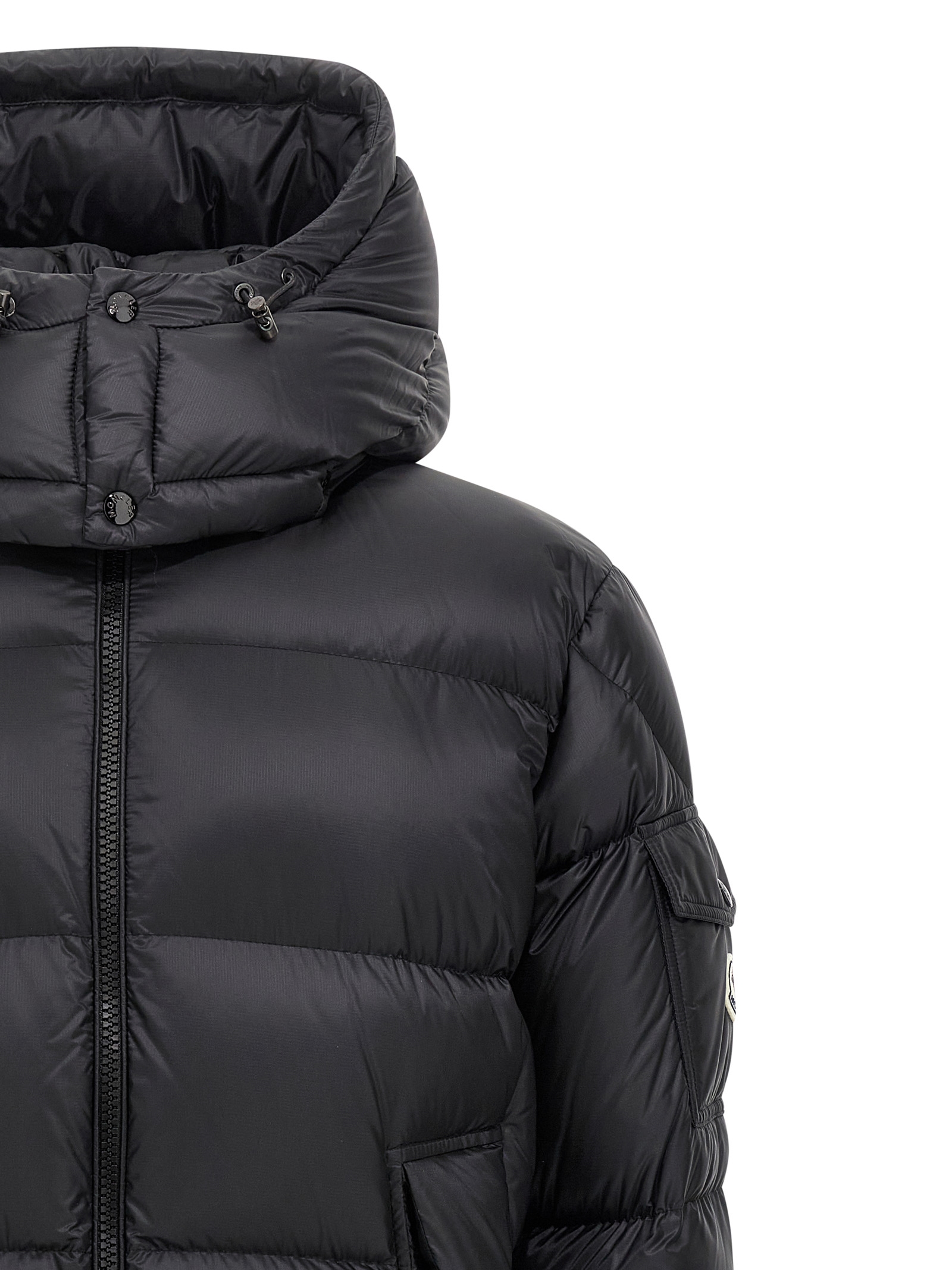 ‘Couyere’ water-repellent quilted micro ripstop down jacket with goose down padding, adjustable and removable hood, standing collar, front zip closure, pockets, long sleeves with elastic cuffs and felt logo patch, drawstring at the hem.
