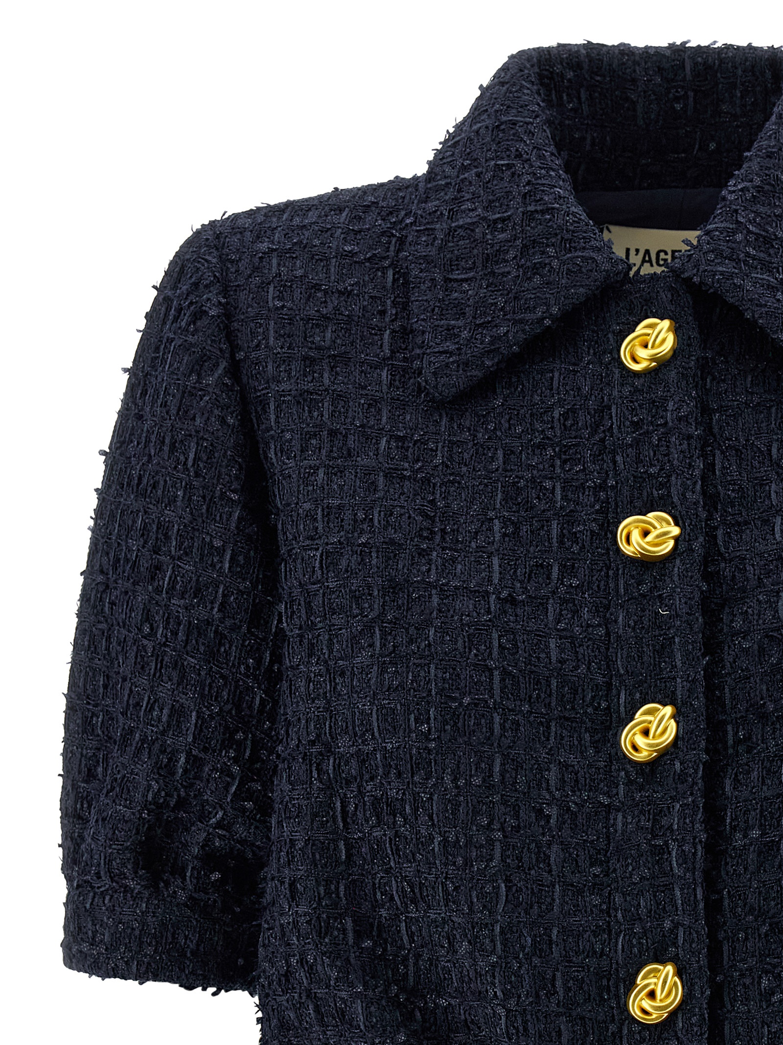 ‘Cove’ tweed blazer with Waffle texture, crop model, shirt collar, front metal button closure, short puff sleeves with cuffs, lining.