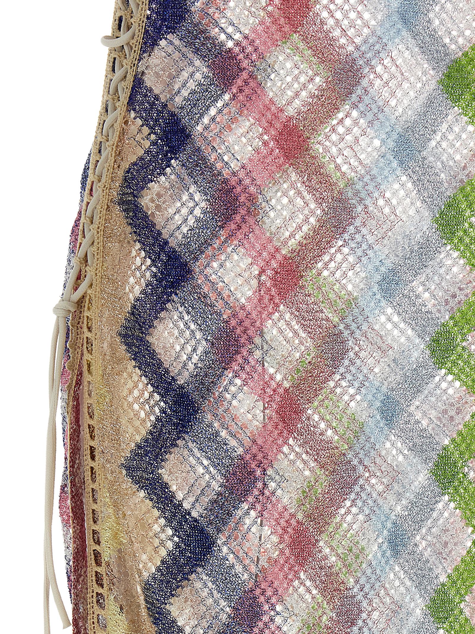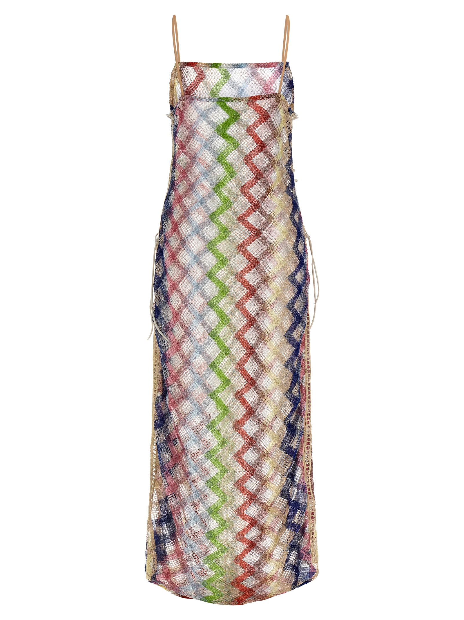 Long cover-up dress, mesh with lamé pattern, thin straps, adjustable opening on the sides with drawstring.