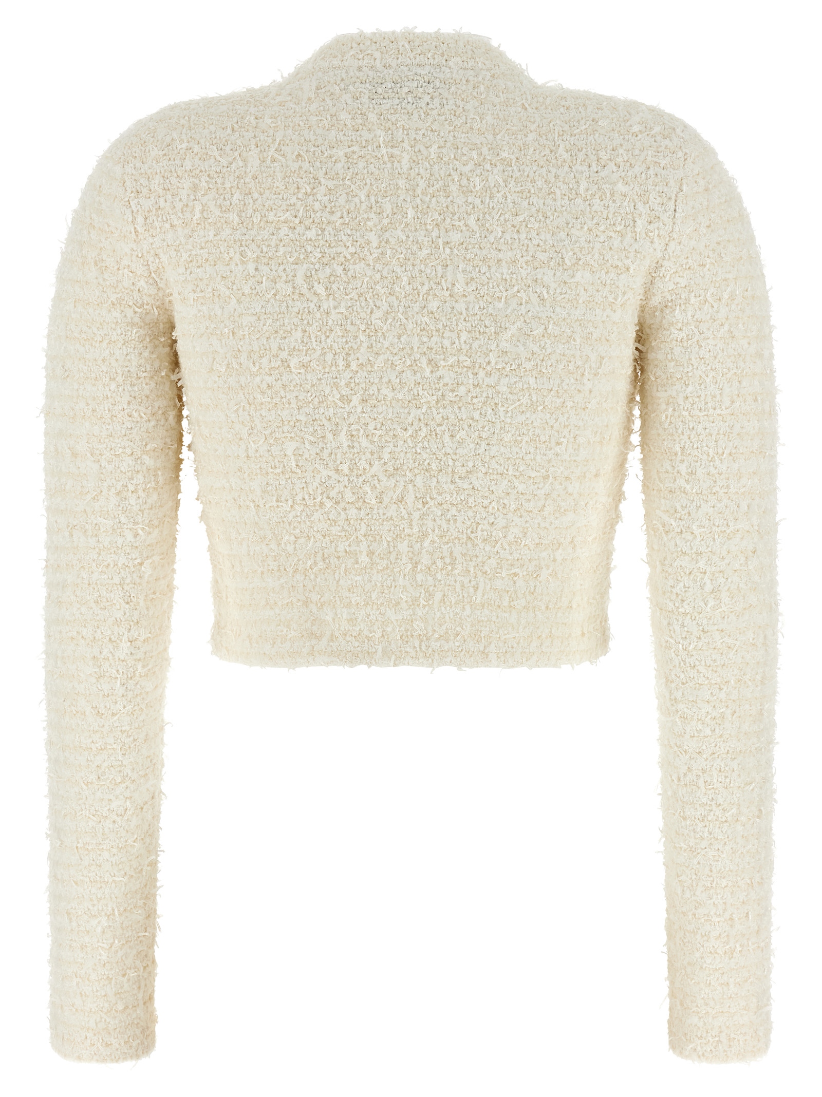 ‘Cream Textured Knit’ bouclé knit cropped cardigan with front hidden snap button closure with overlapping jewel buttons, crew neck with crystal appliqués, long sleeves, removable padded shoulder.
