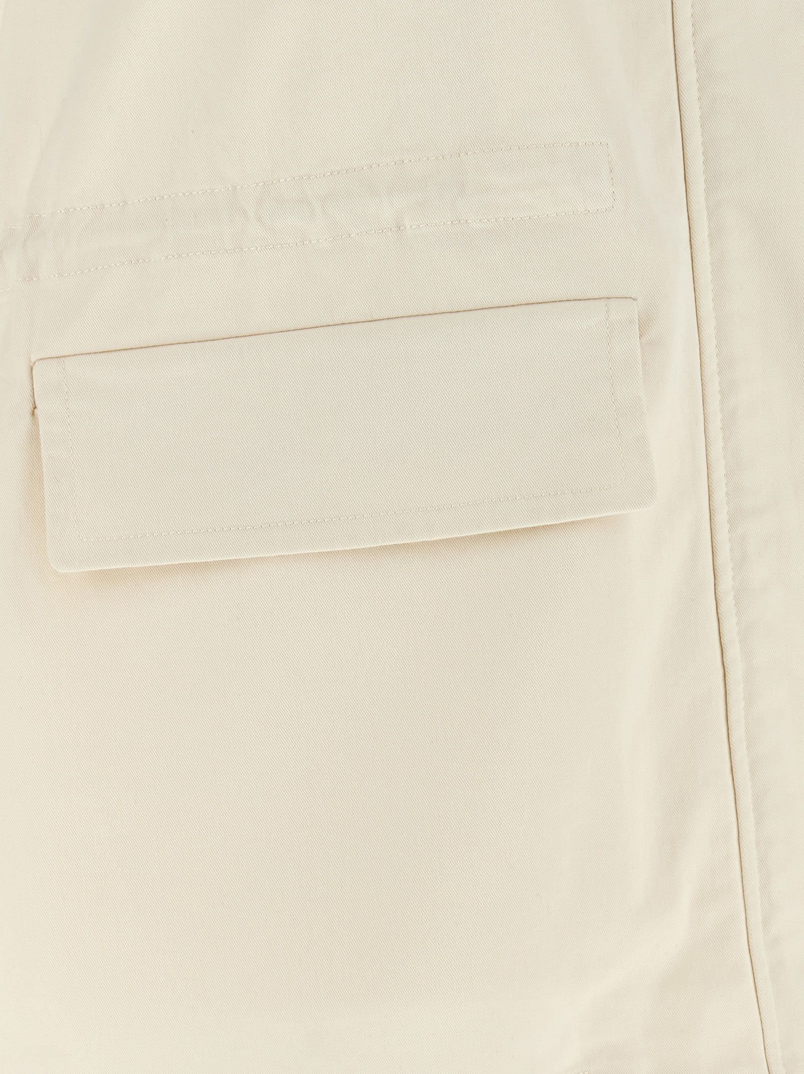 Cotton gabardine vest with tone-on-tone back crochet insert, high neck, zip and snap button closure on the front, pockets, and asymmetrical hem.