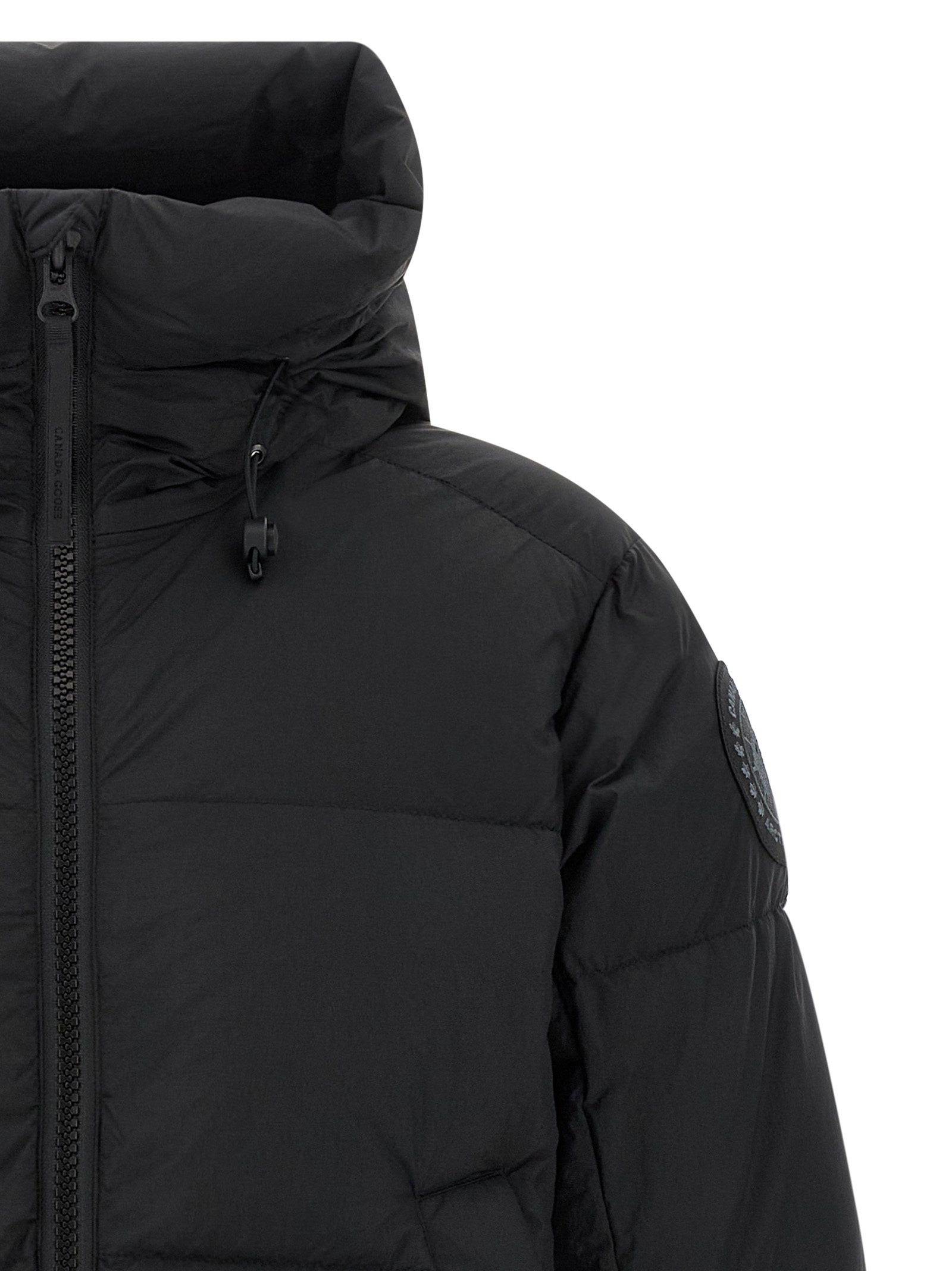 Crofton’ jacket in EnduraLuxe fabric with quilted matte finish and goose down padding, adjustable hood, high neck, front zip closure, pockets, long sleeves with windproof knit cuffs and tone-on-tone logo patch appliqué, drawstring on the hem.