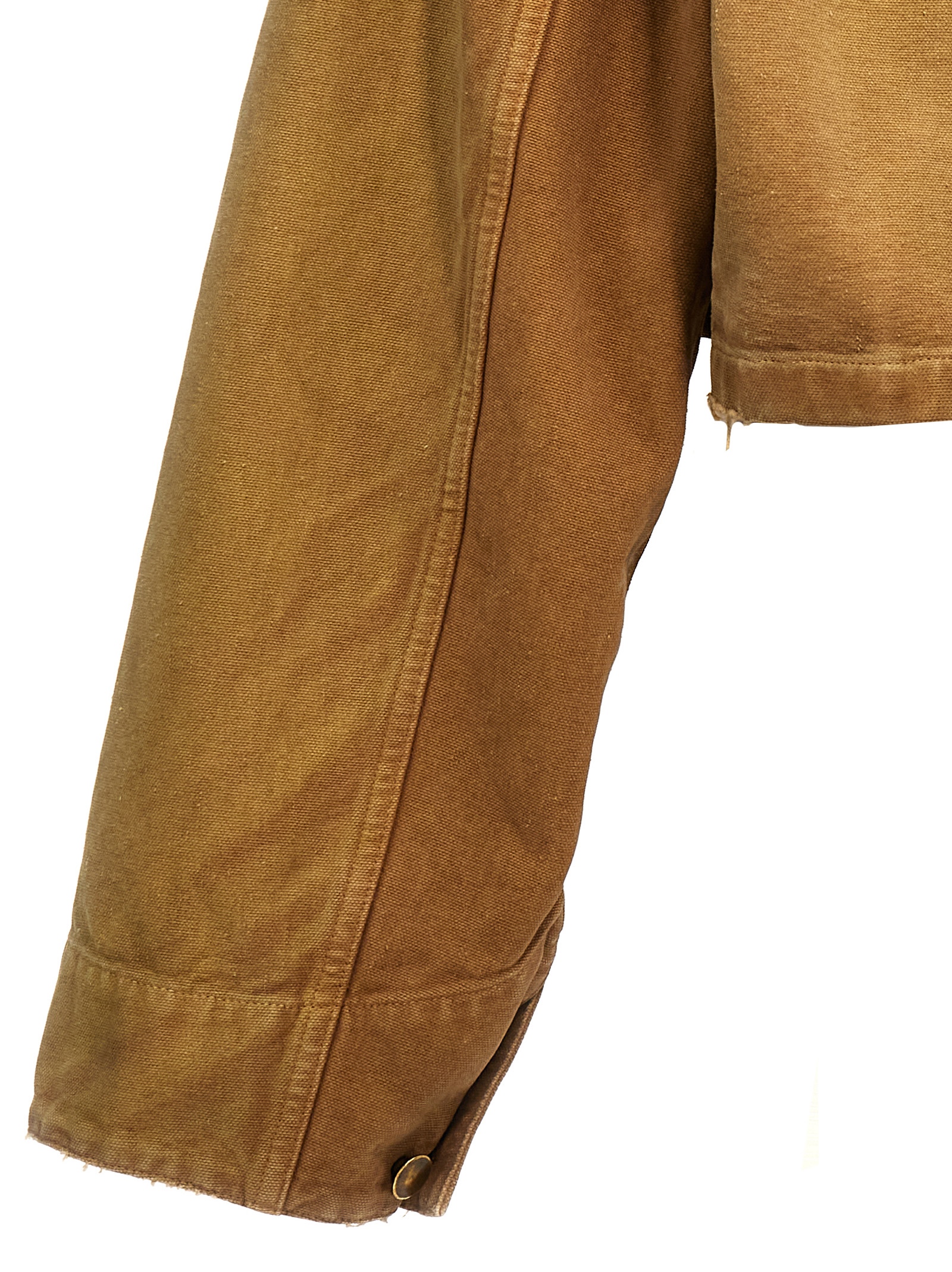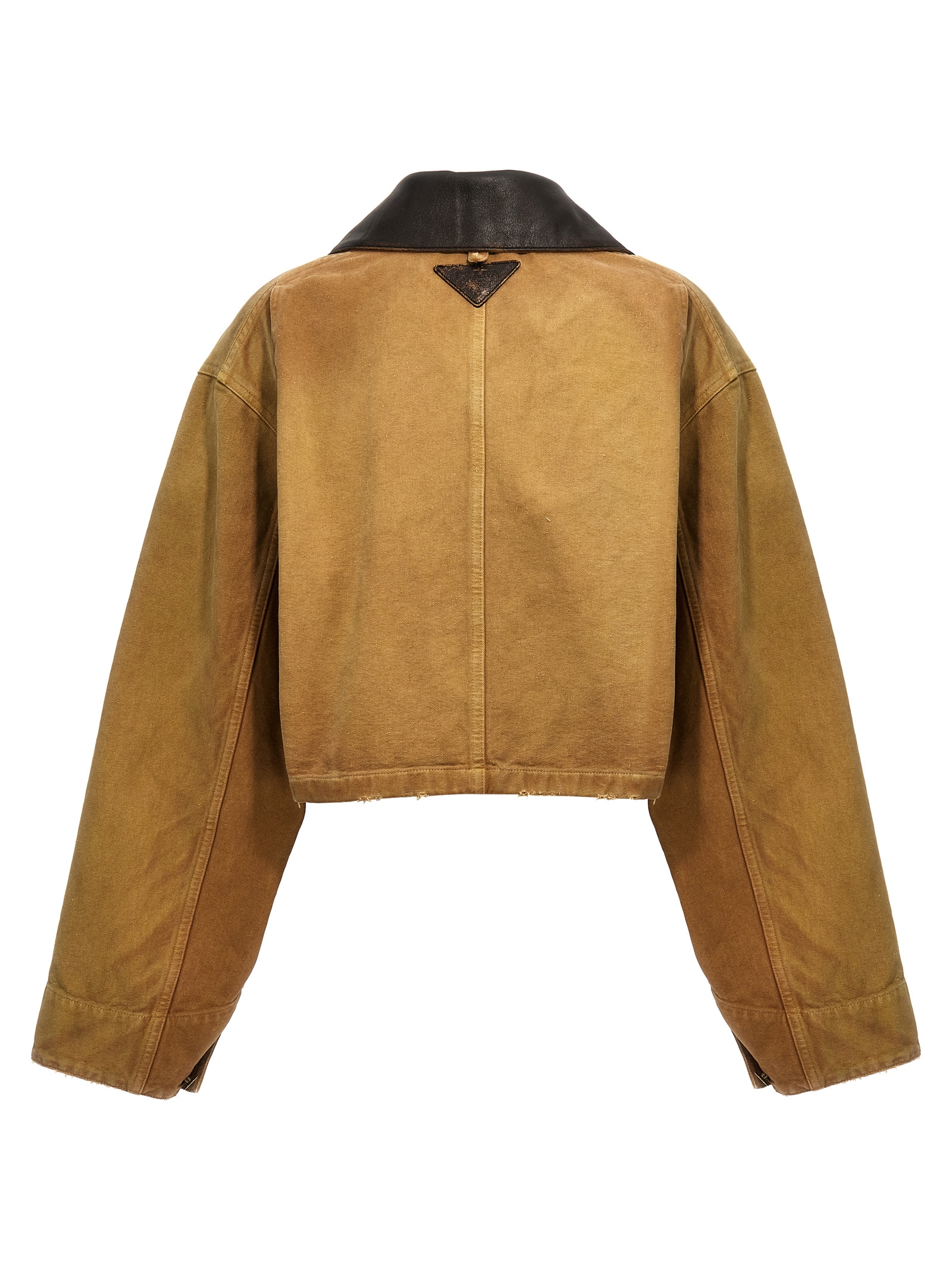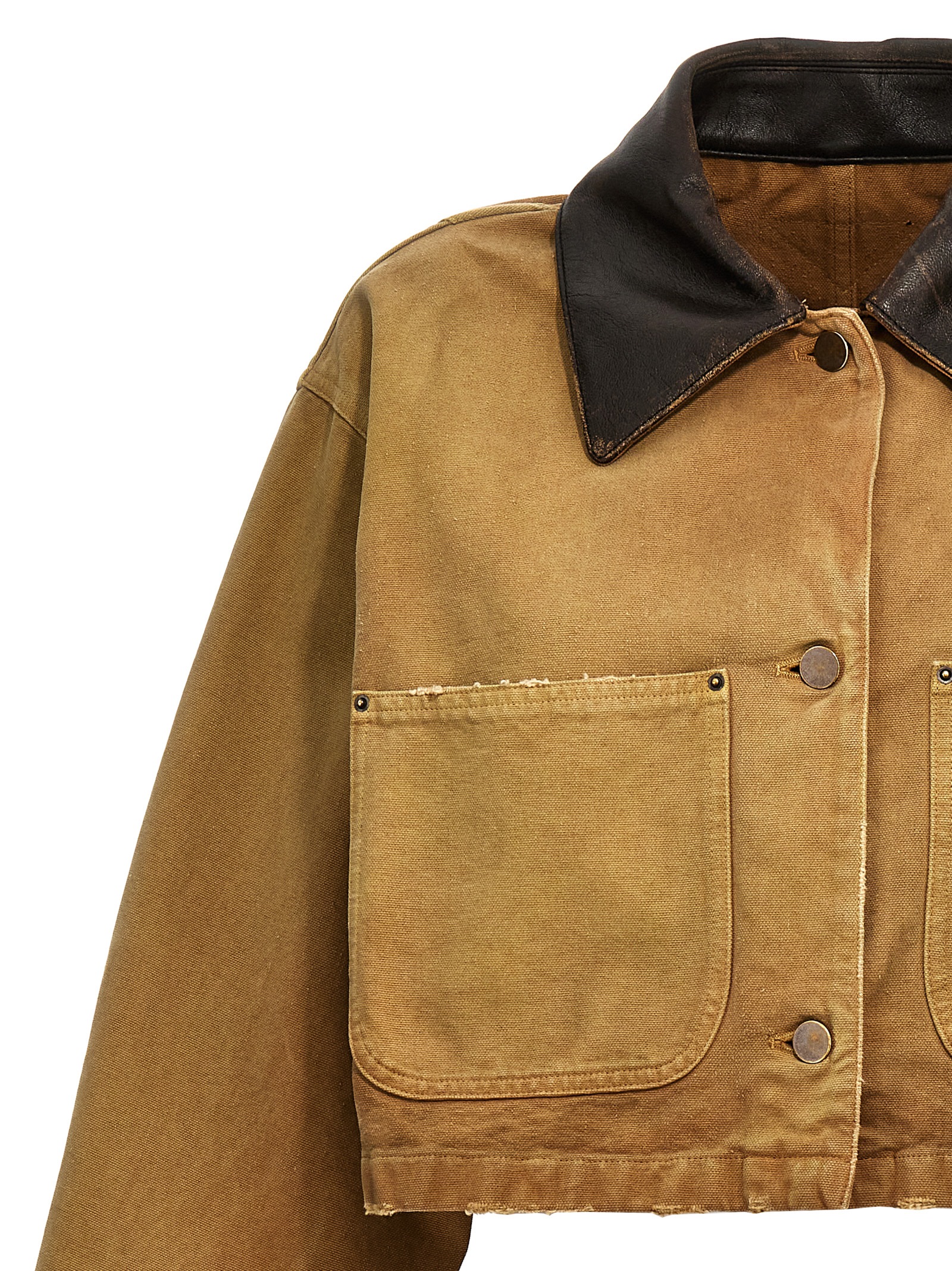 Canvas crop blouson with leather collar, back logo patch, front button closure, patch pockets, long sleeves with cuffs and button.