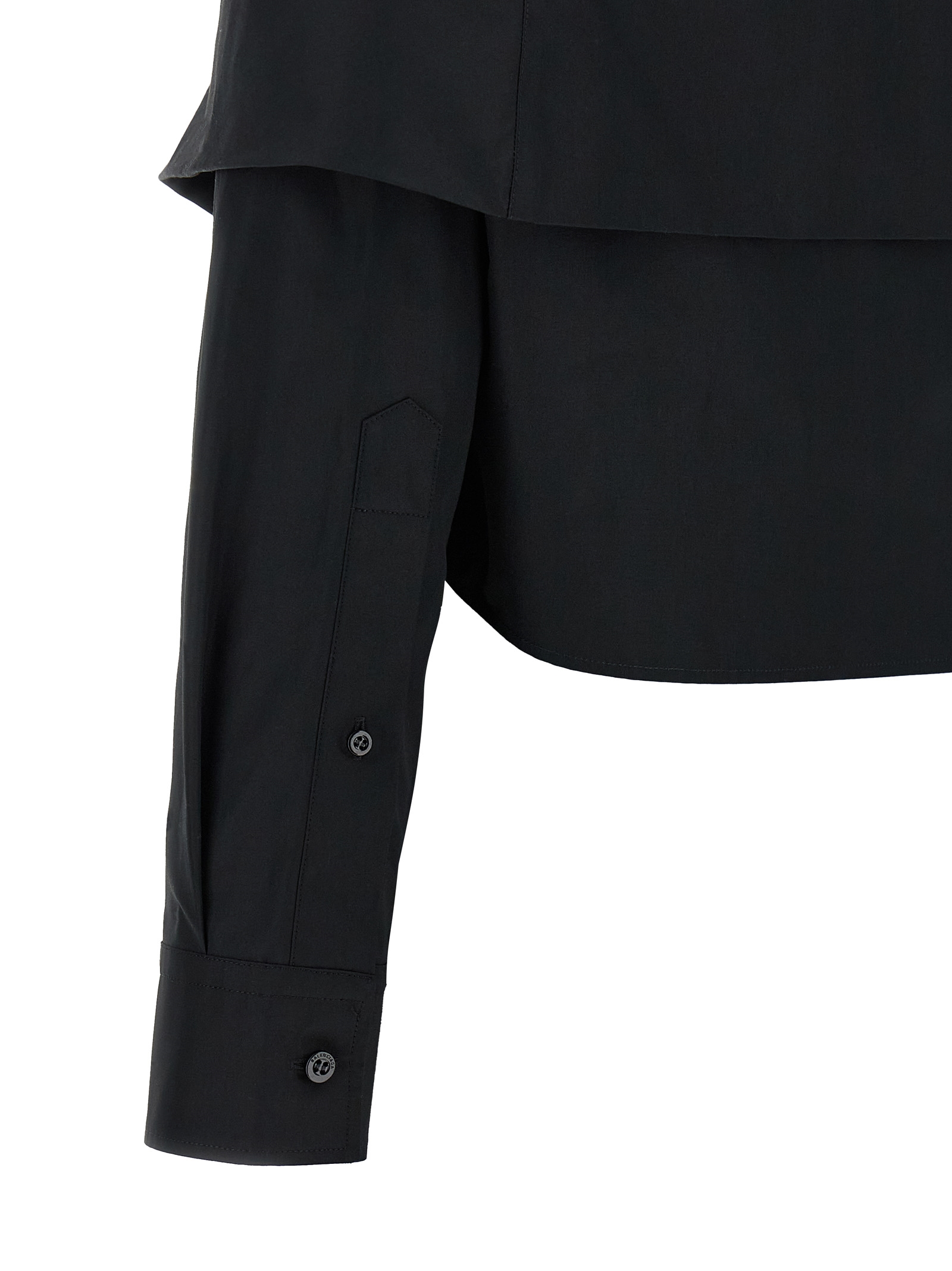 Sustained cotton shirt, off-the-shoulder crop model to be modulated on the shoulders with detail to be tied on the bottom of the garment and front button closure, pocket with tone-on-tone embroidered logo, long sleeves with cuffs.