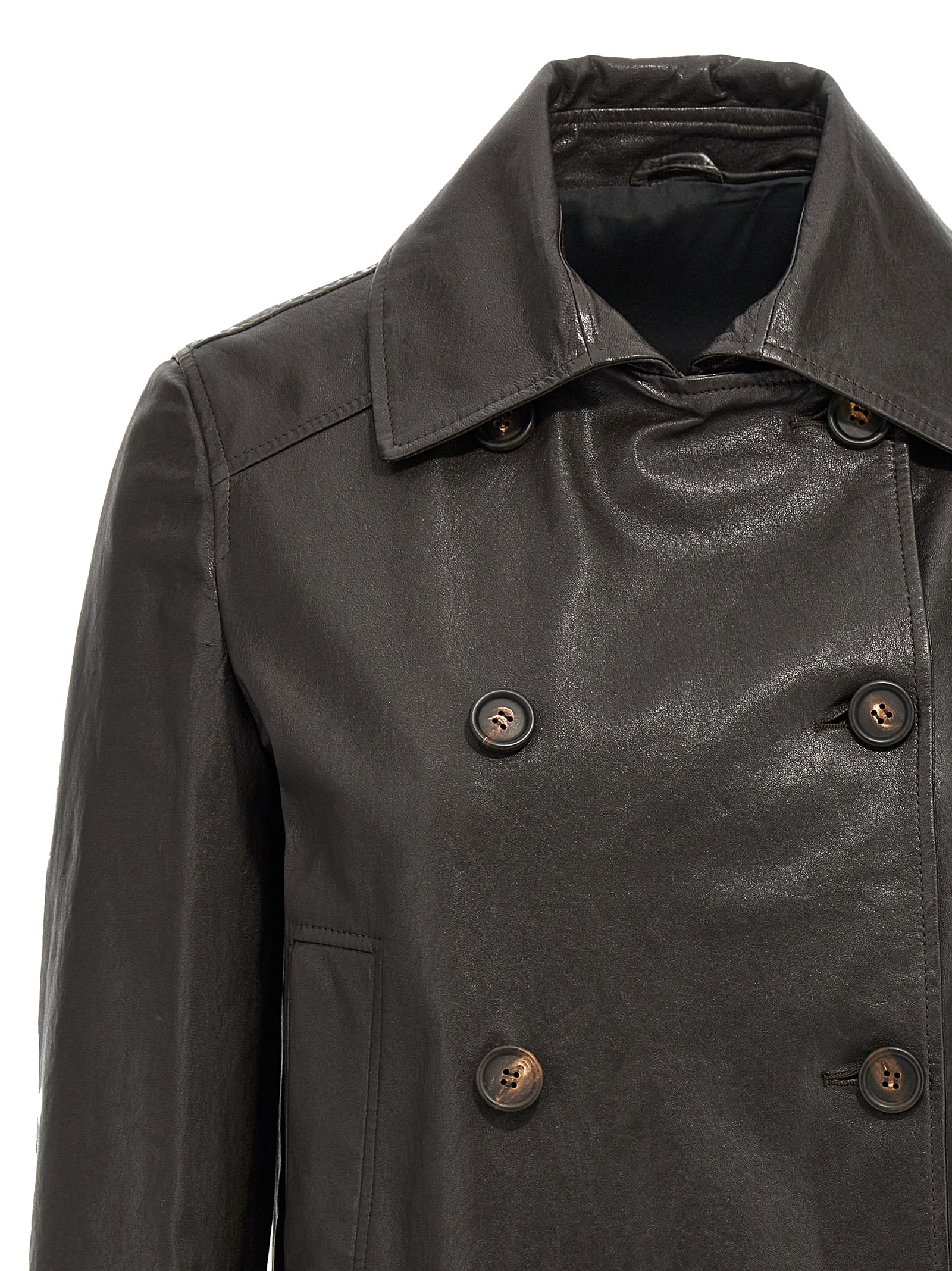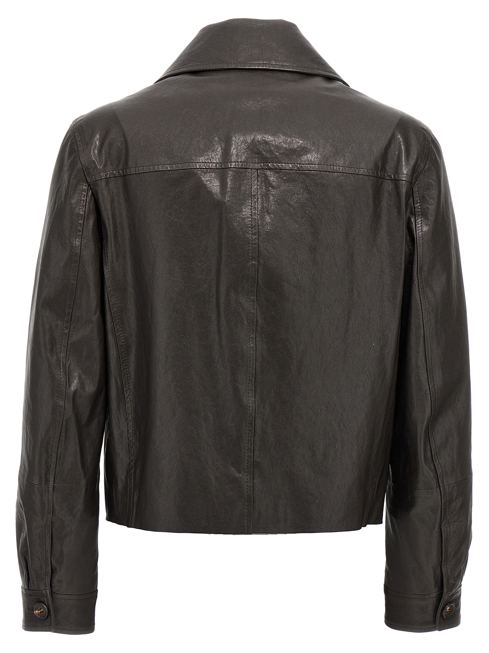 Shiny leather caban with Monile detail at the back, double-breasted crop style with front button closure, silk crêpe blend lining, pockets, long cuffed sleeves.