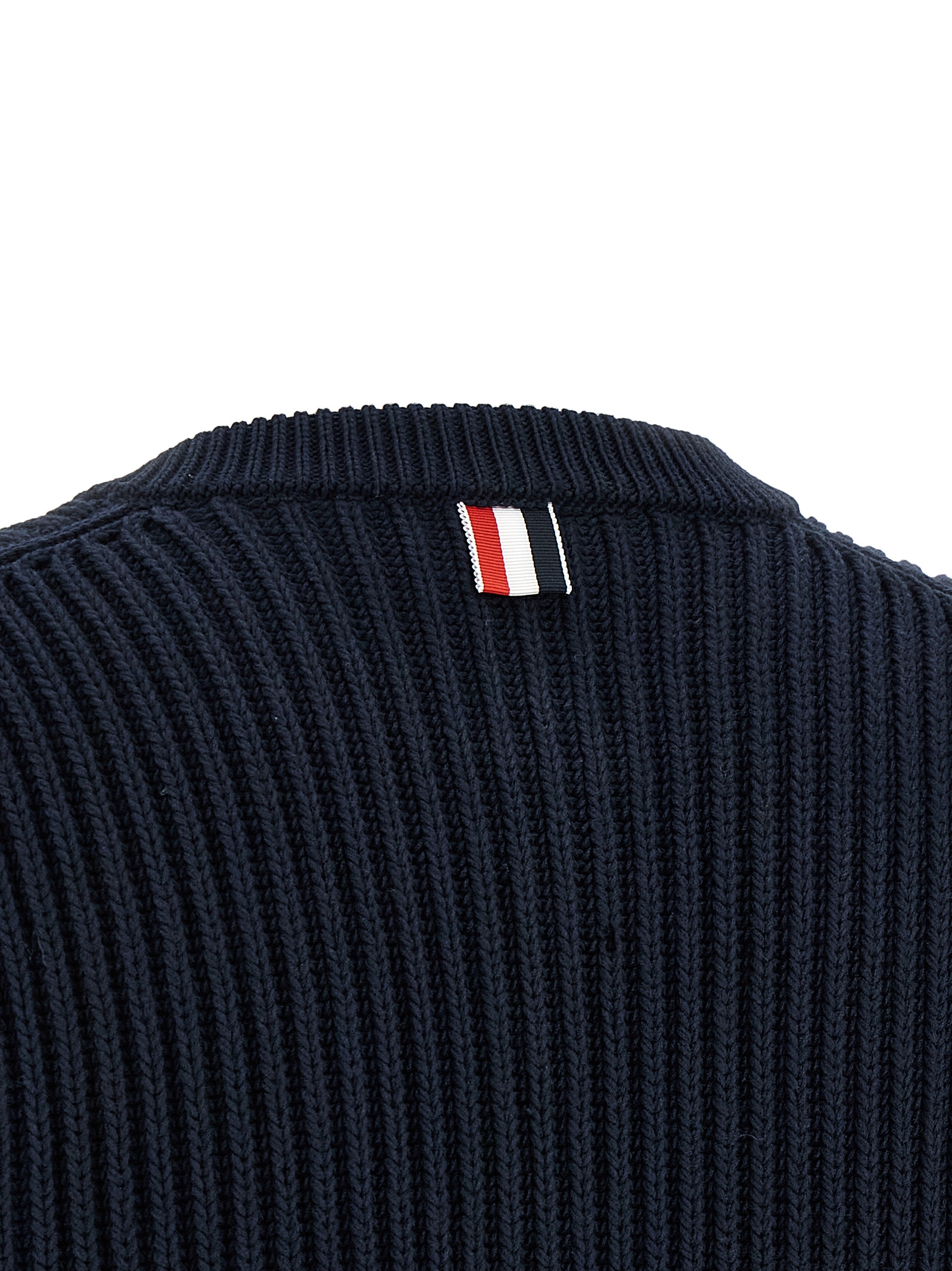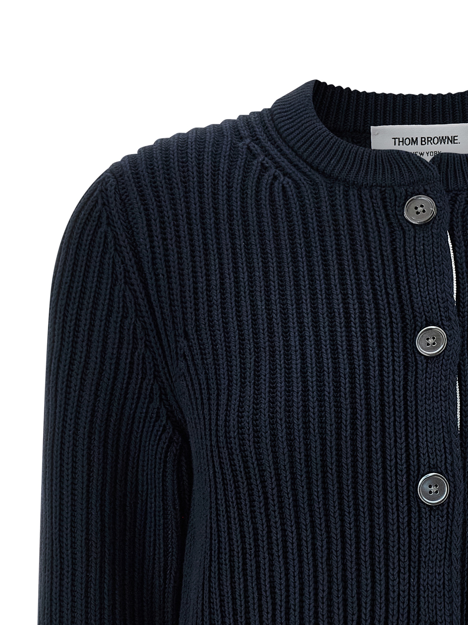 Knitted cotton cardigan, crop model, crew neck, front button closure with RWB grosgrain tape lining, long cuffed sleeves.