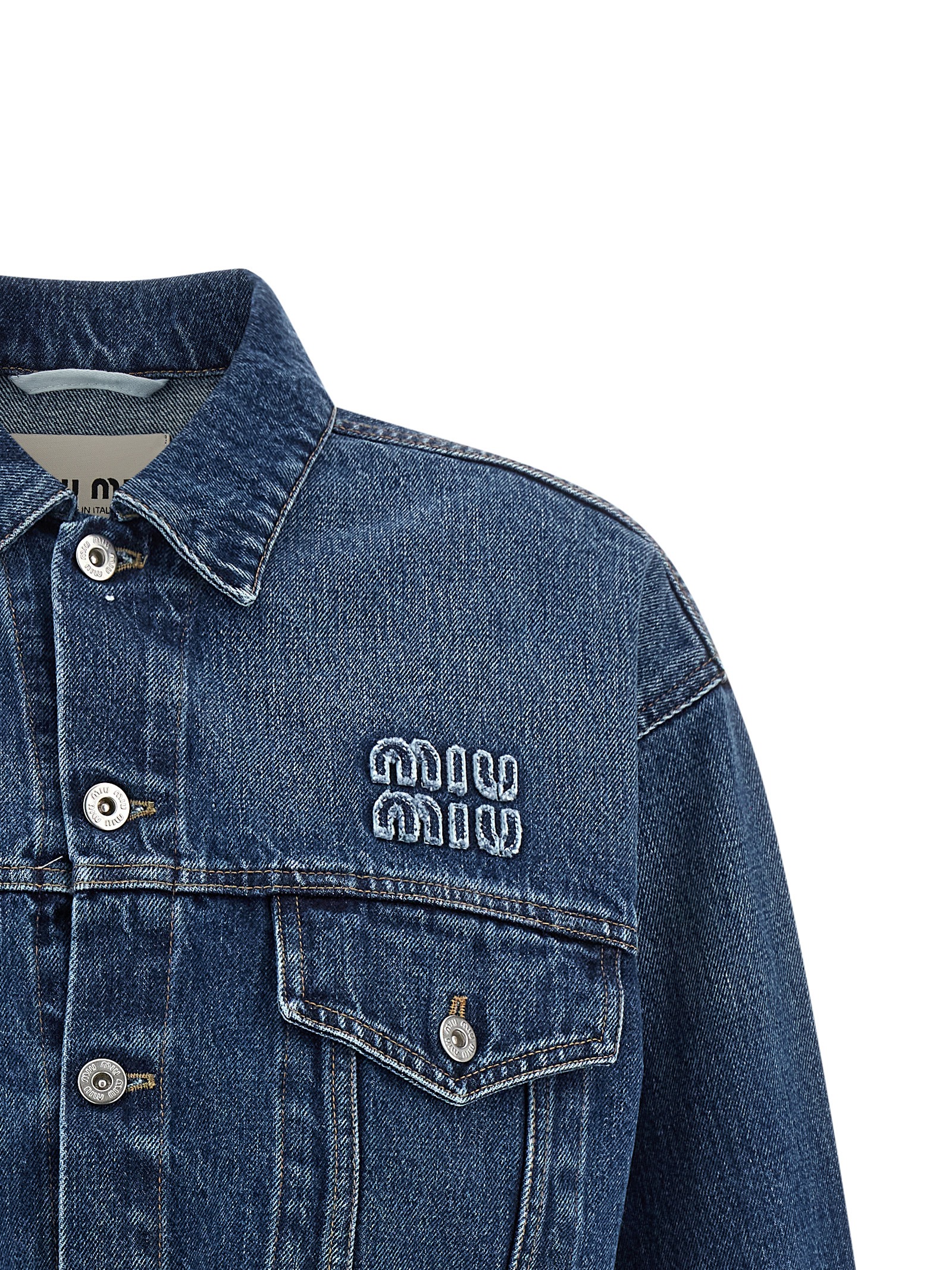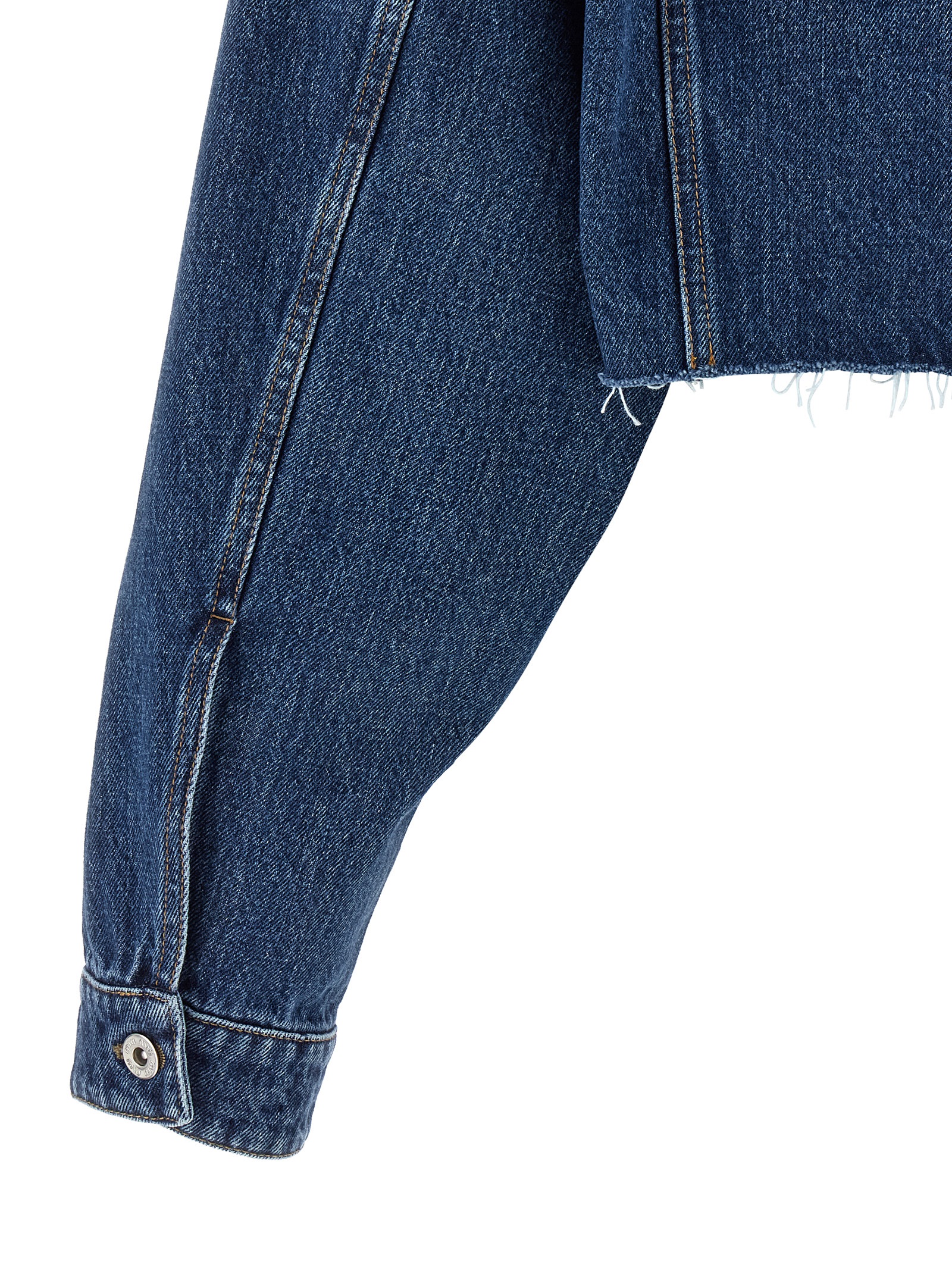 Stone-washed cotton denim jacket with contrast stitching, crop style, shirt collar, logo patch and front button closure, pockets, long cuffed sleeves, and raw cut hem.