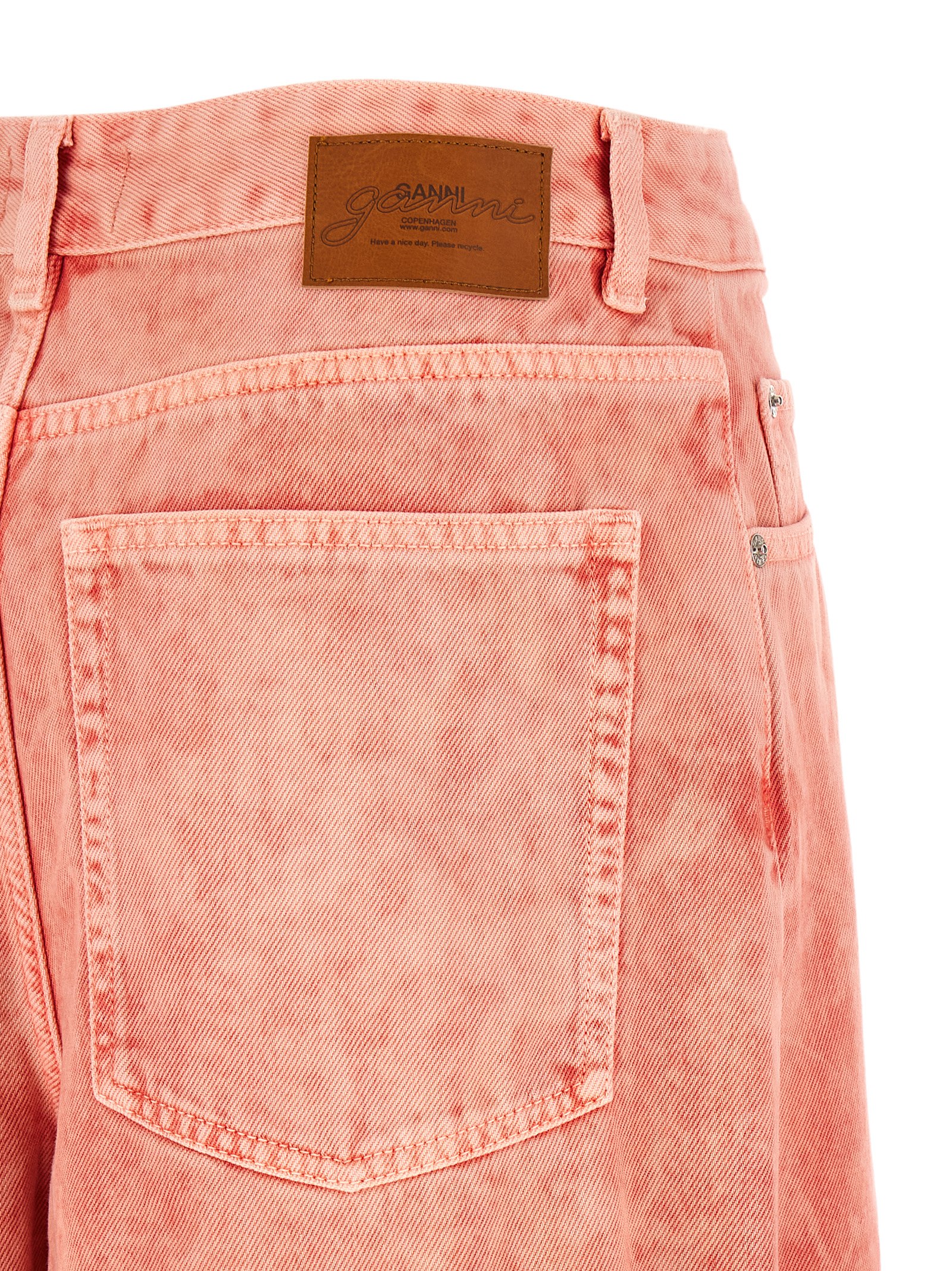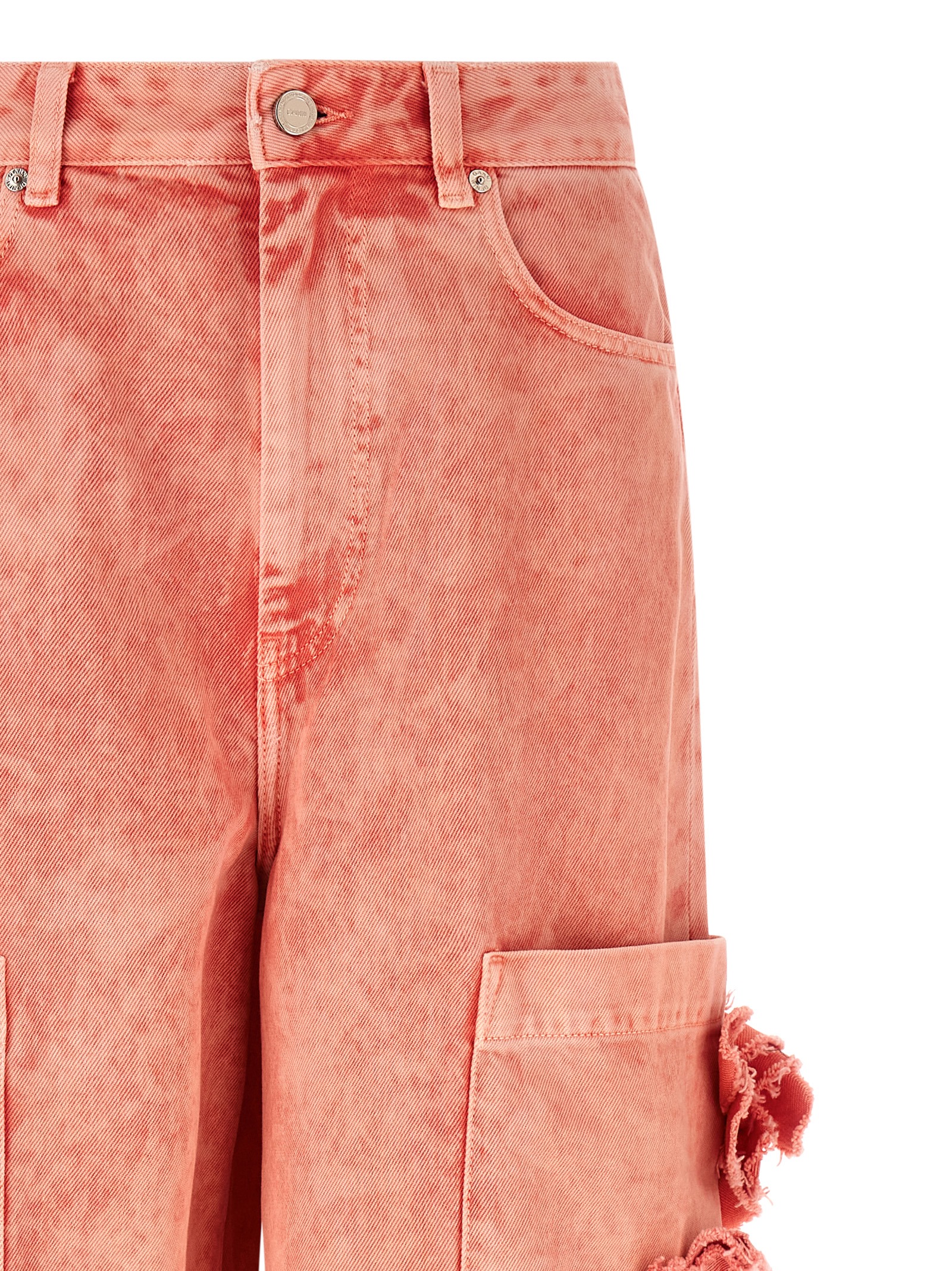 Stone-washed rigid denim jeans with crop cargo model with side pockets with 3D floral applications, flared wide leg, medium waist, low crotch, front zip and button closure, five pockets, and back leather logo tag.