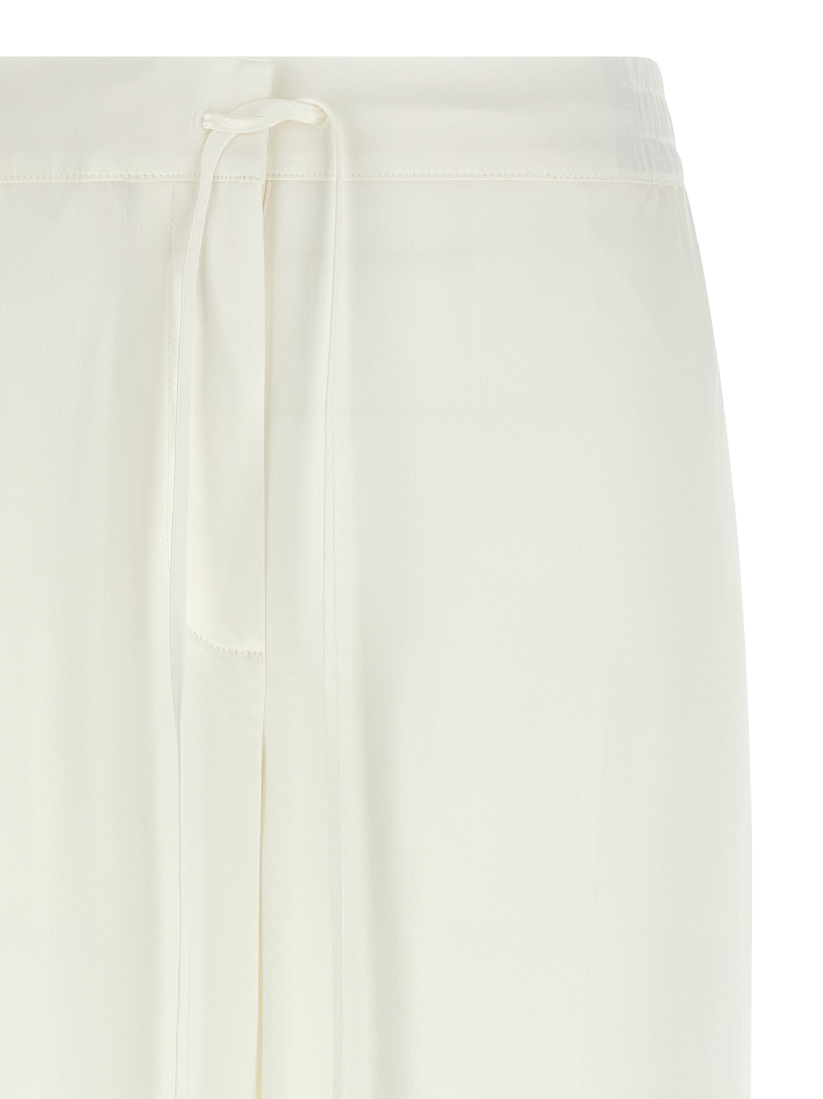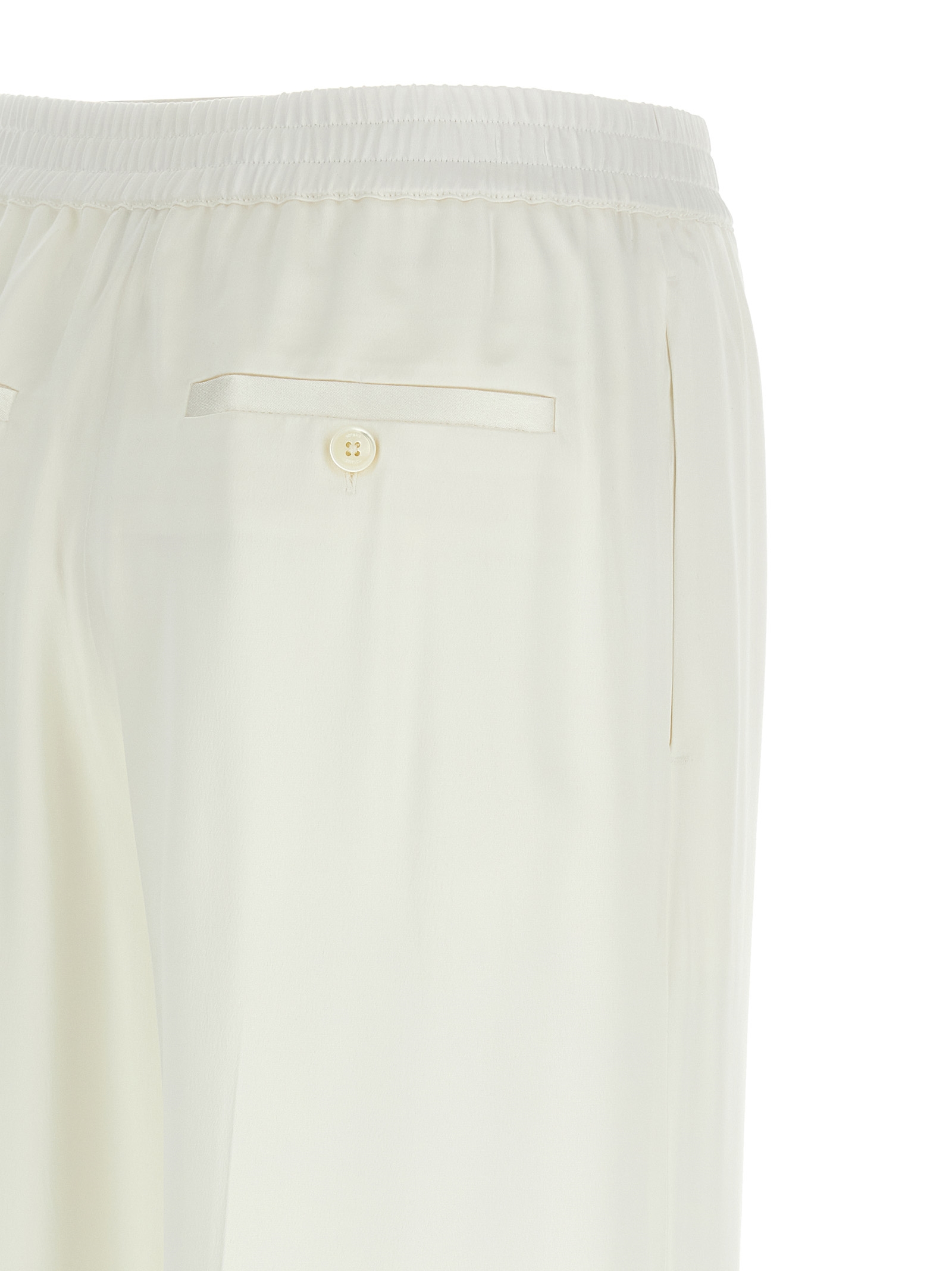 Satin trousers, crop model, wide leg, stretched pleat, back elastic and drawstring at the waist, flap with buttons, pockets, contrast band on the bottom of the leg.