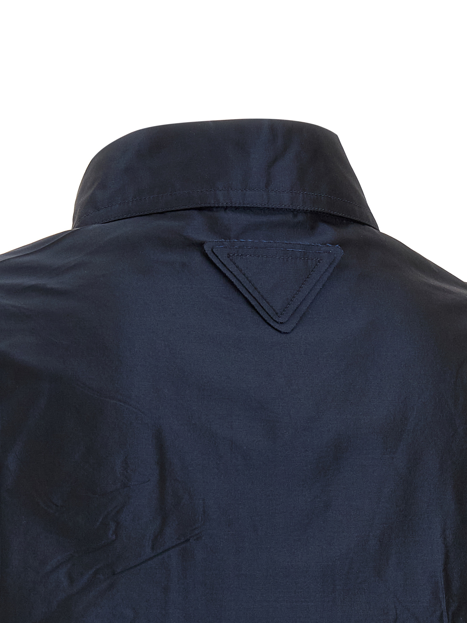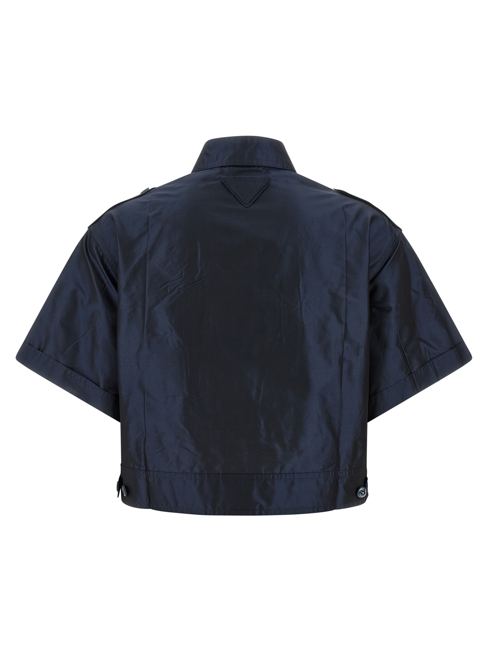 Cropped silk taffeta shirt with collar, front button closure, front flap and button pockets, short sleeves, back logo patch, and short sleeves.