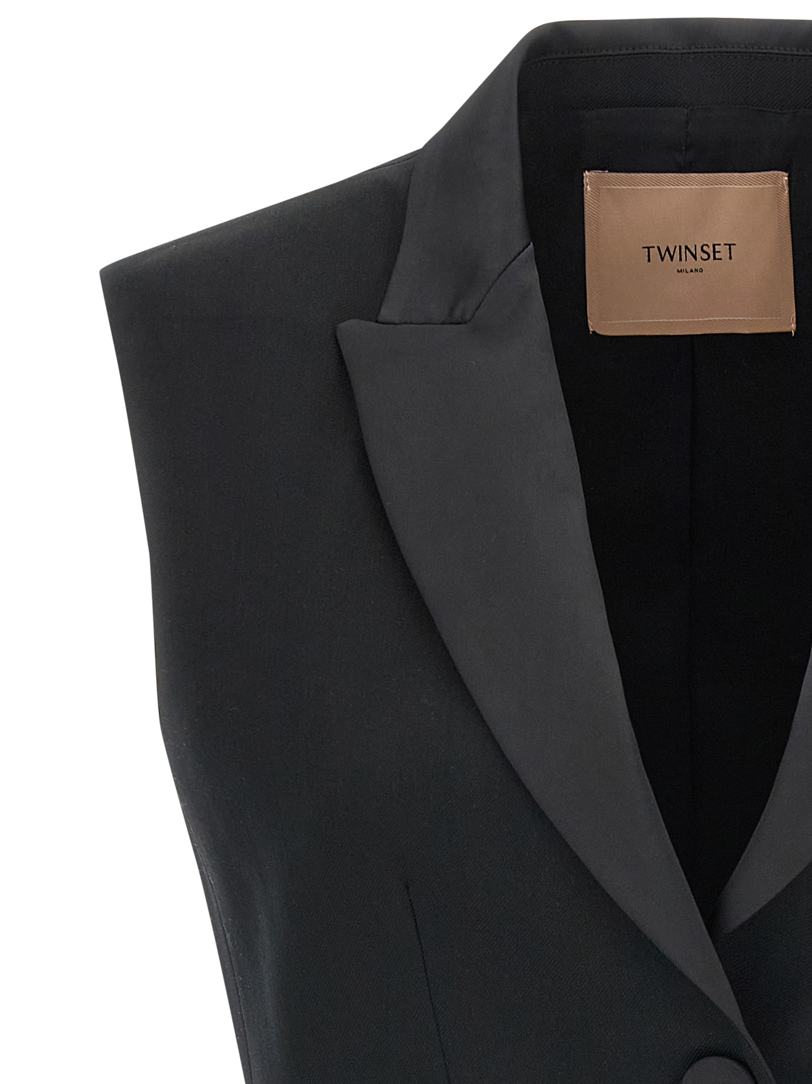 Wool and viscose blend vest, crop model, tone-on-tone satin lapel collar, single-breasted pocket with front button closure.