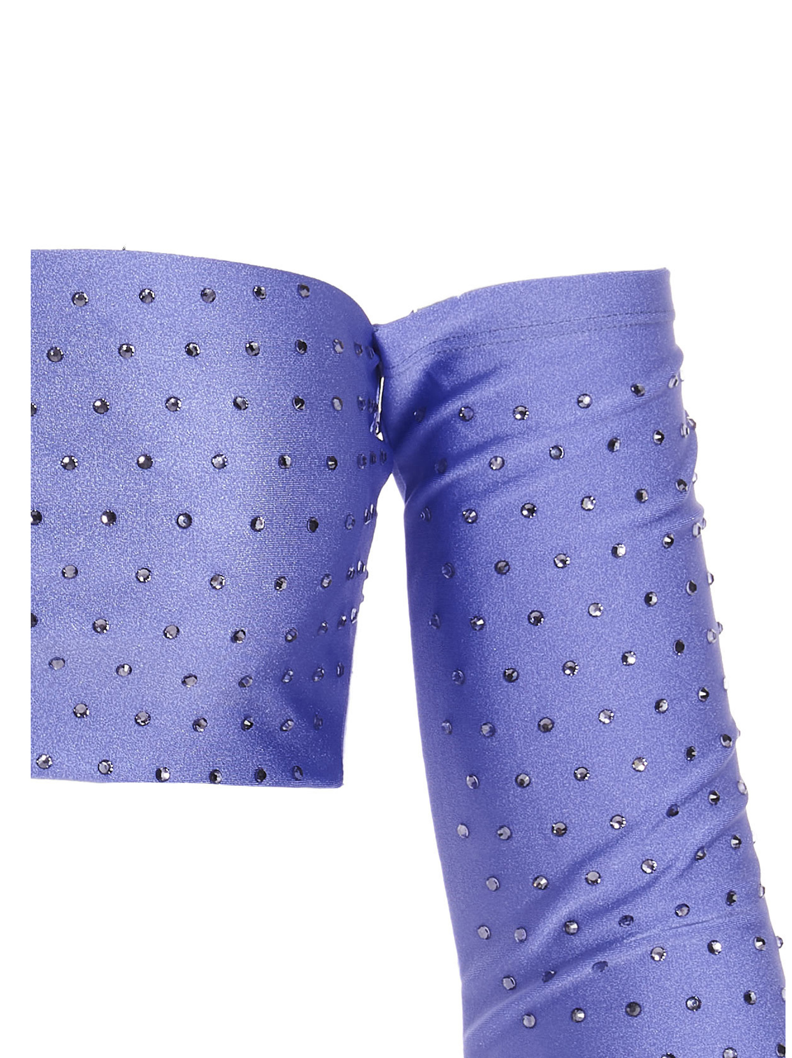 Off-the-shoulder, cropped top in stretch shiny lycra with crystal embellishment, long sleeves.s.