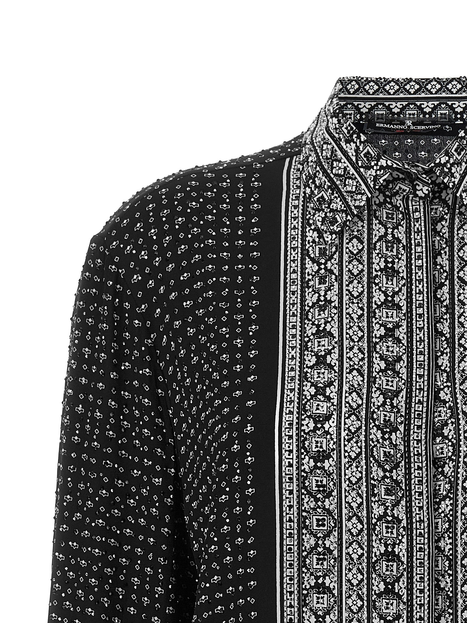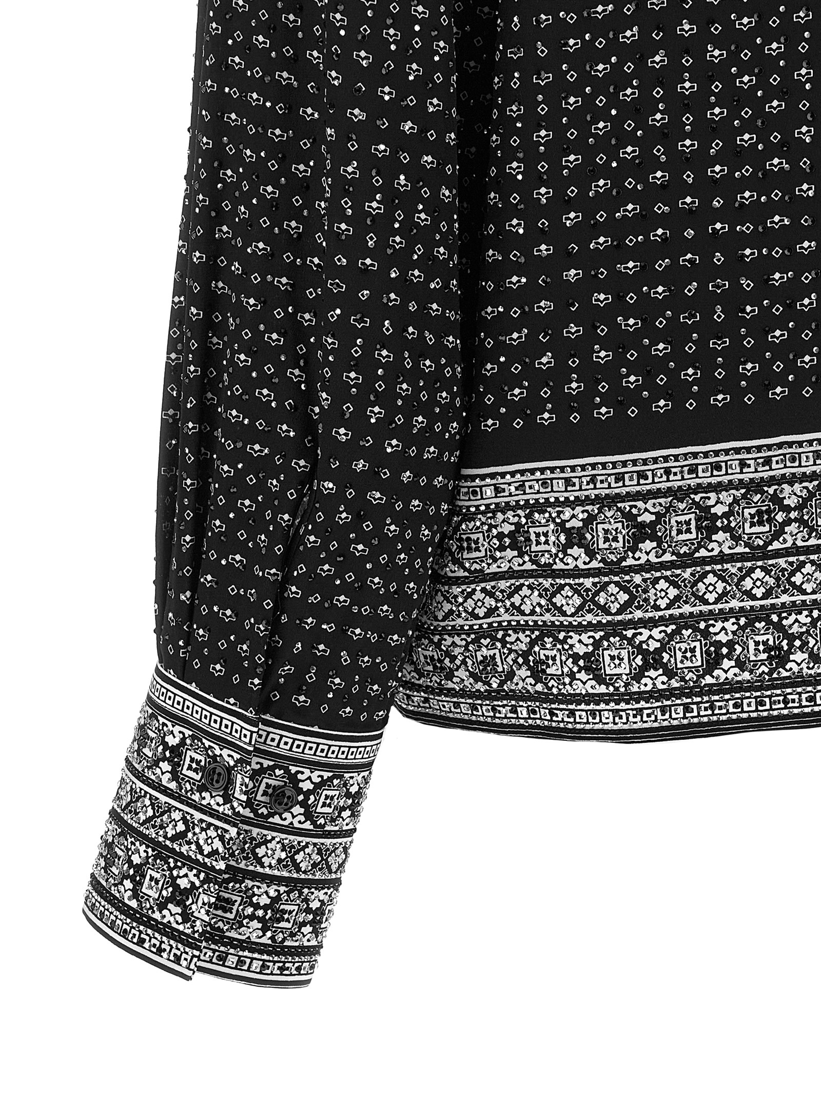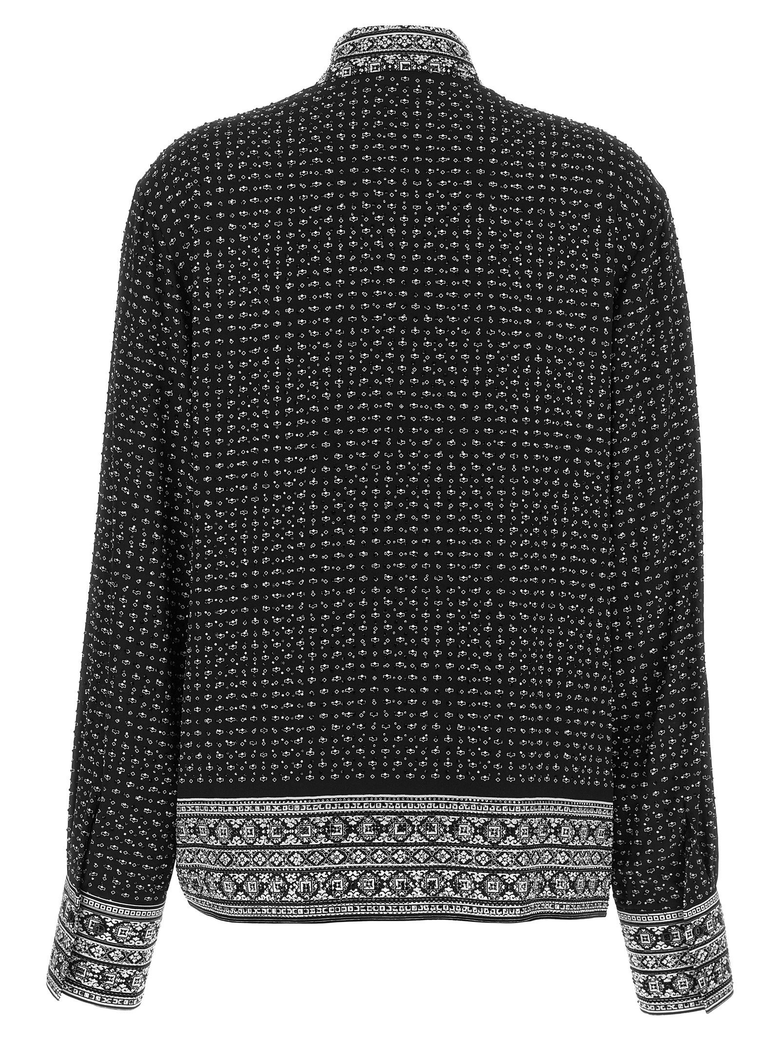 Bandana-print crepe de chine silk shirt with all-over hand-applied crystals, pointed collar, front button closure, long cuffed sleeves and dropped shoulders.