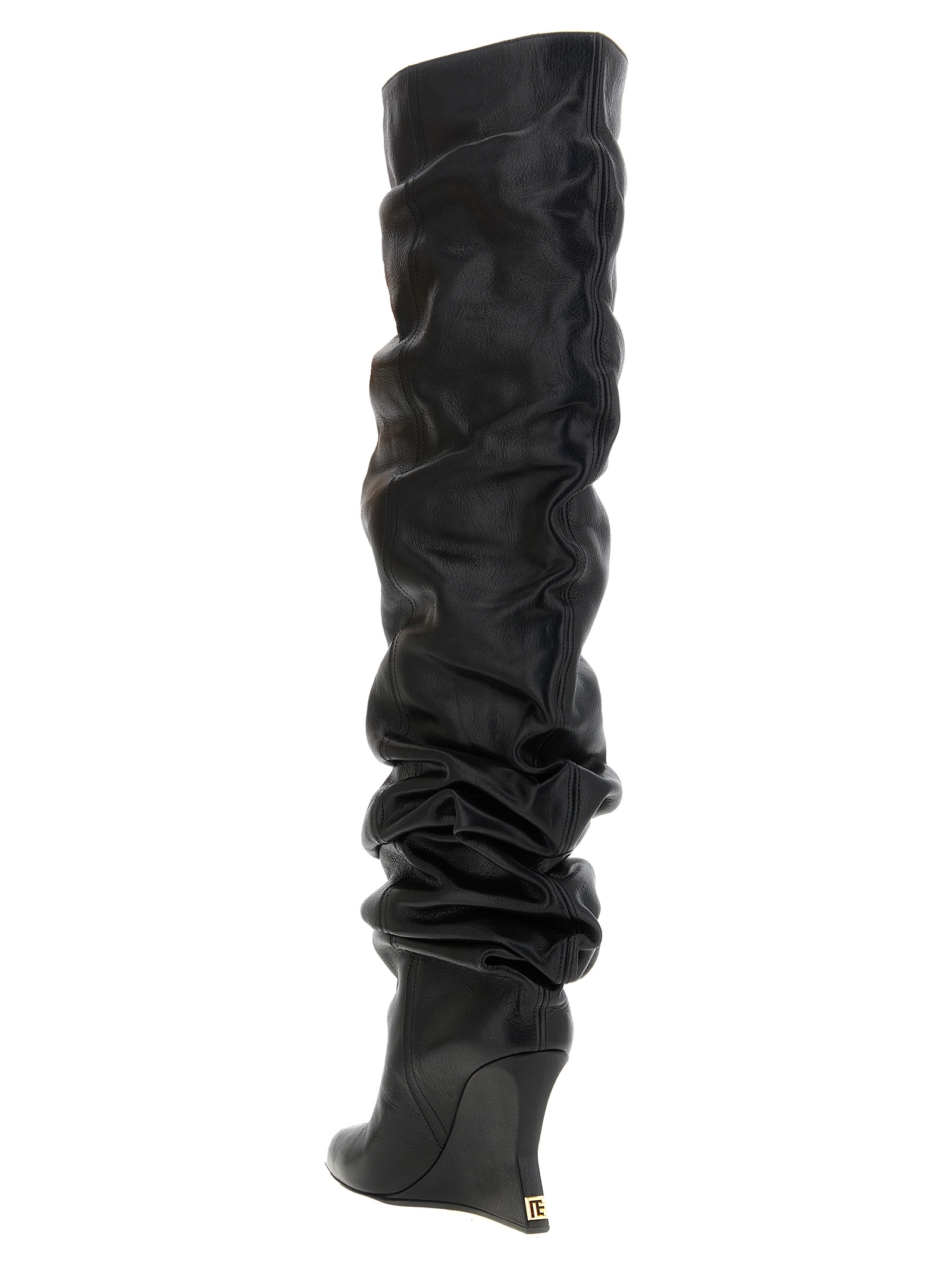 Hammered leather cuissardes, gaiter-style draped leg, pointed toe, wedge heel and metal logo appliqué, leather sole.