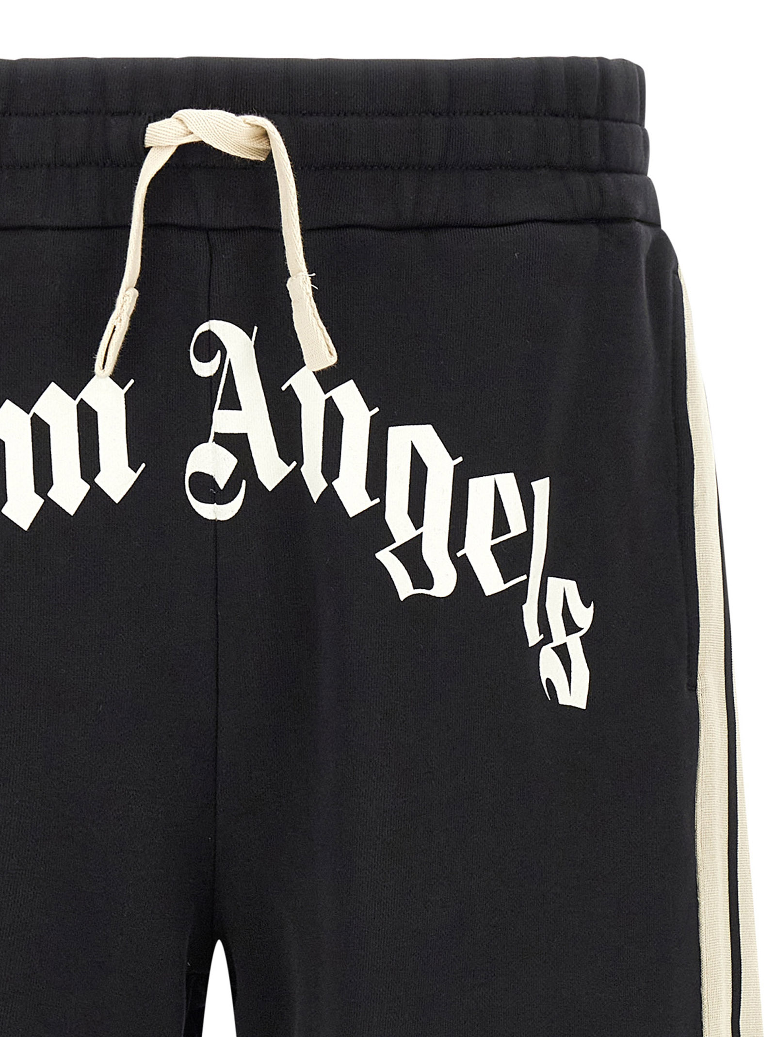 ‘Curved Logo Track’ gauze cotton bermuda shorts with contrast stripes on the sides, ‘Curved Logo’ graphic print on the front, drawstring elastic waistband, pockets, leg bottoms with raw cut hem.