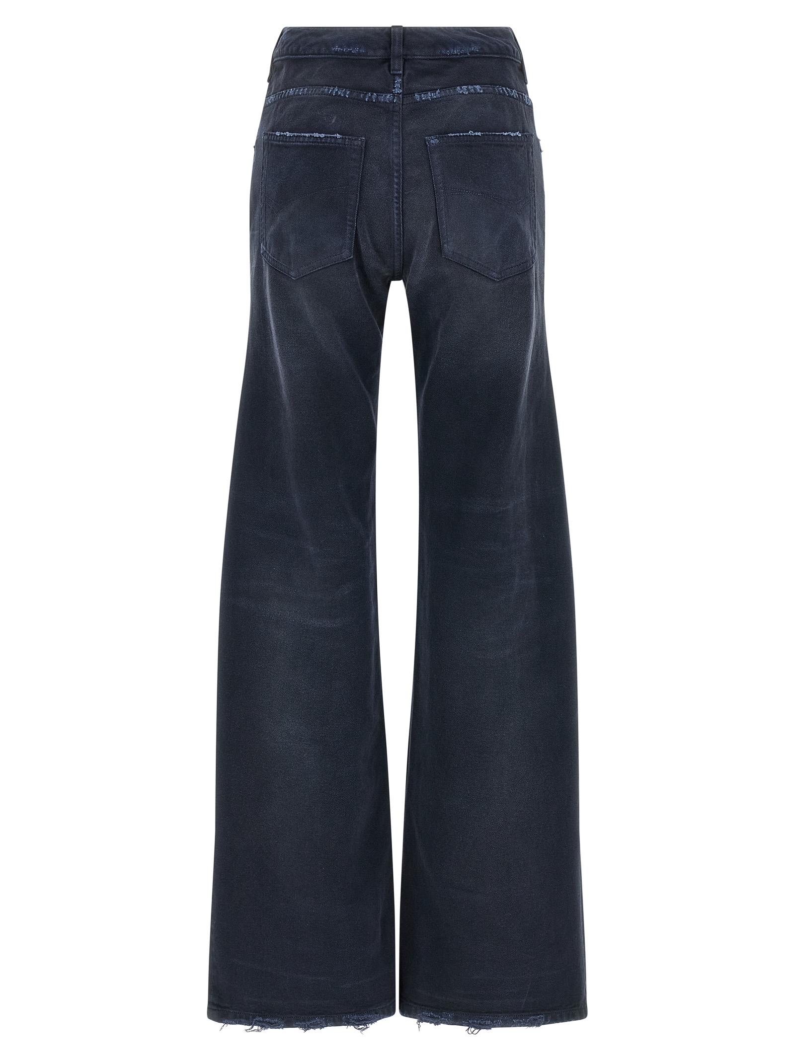 Used-effect cotton denim jeans with curved waist, wide flared leg, zip and front button closure, five pockets.