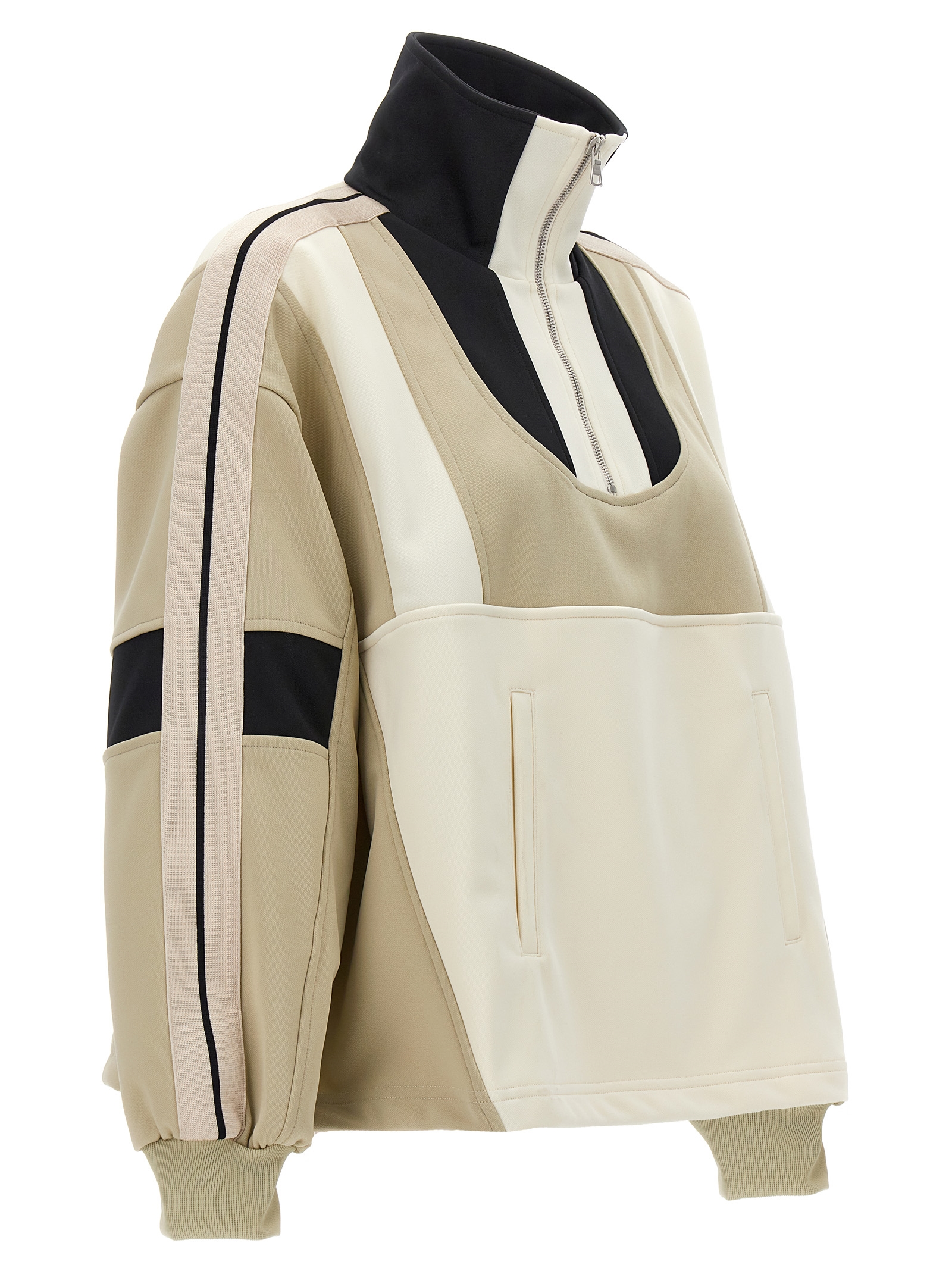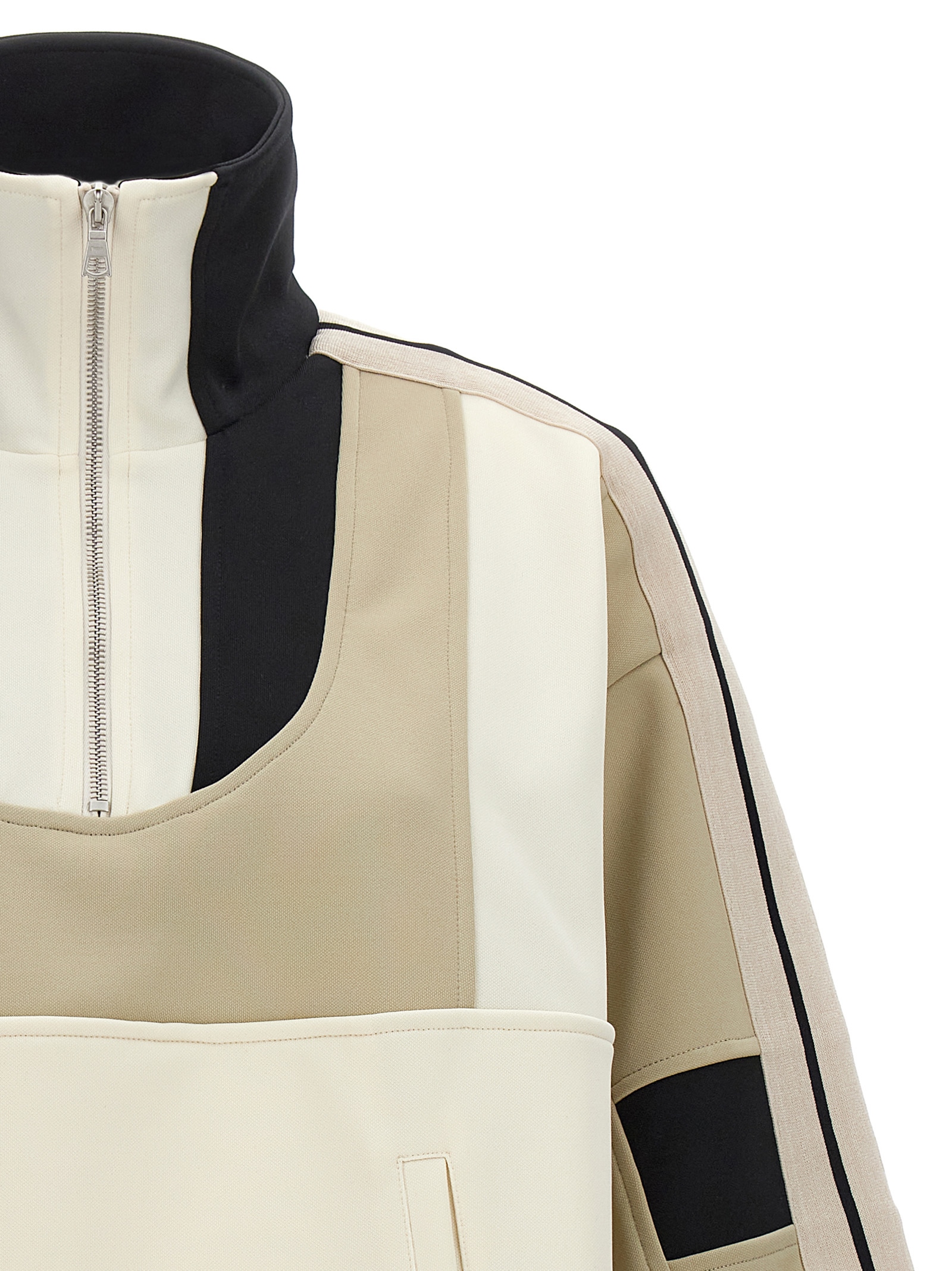 Cut Anorak Track sweatshirt in multicolor patchwork technical fabric with half-zipper closure, kangaroo pocket, high collar, long sleeves with cuffs, and contrasting bands on the sleeves.
