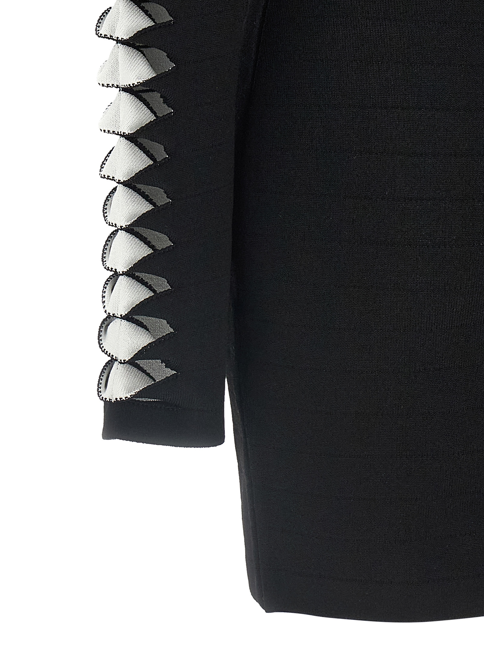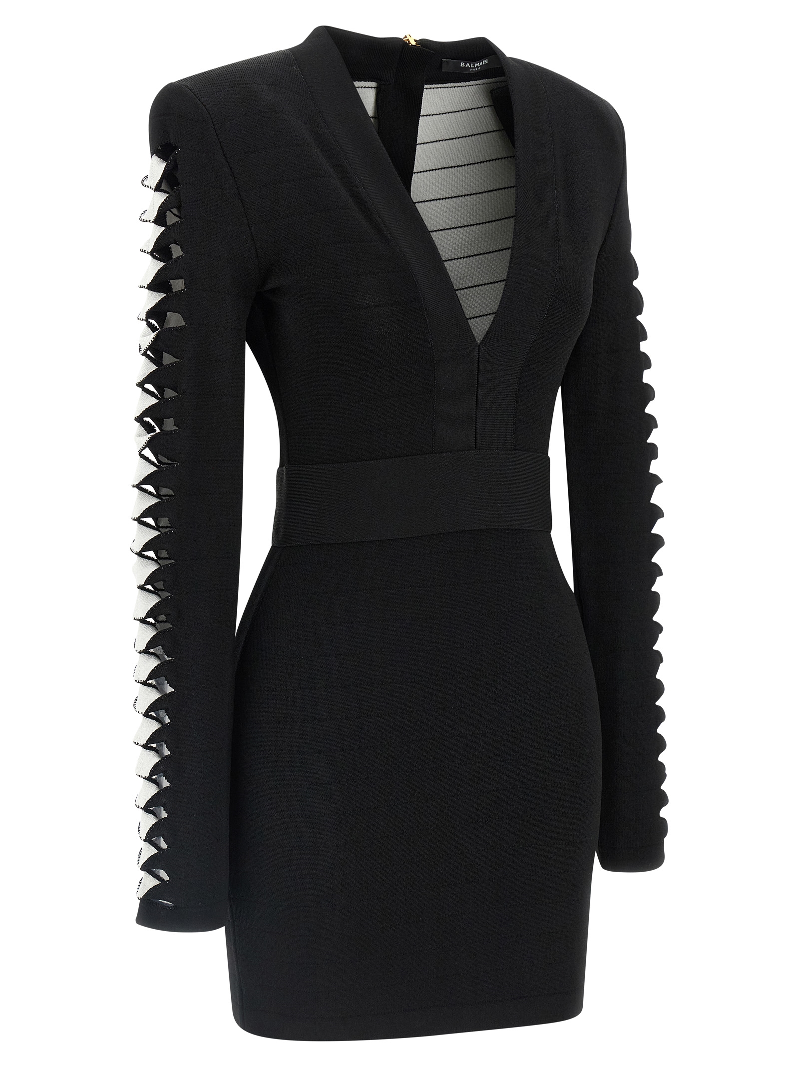 Stretch viscose blend mini dress with cut-out details and fabric turn-ups on the sleeves, padded shoulders, deep front V-neck, back zip closure, long sleeves, unlined.