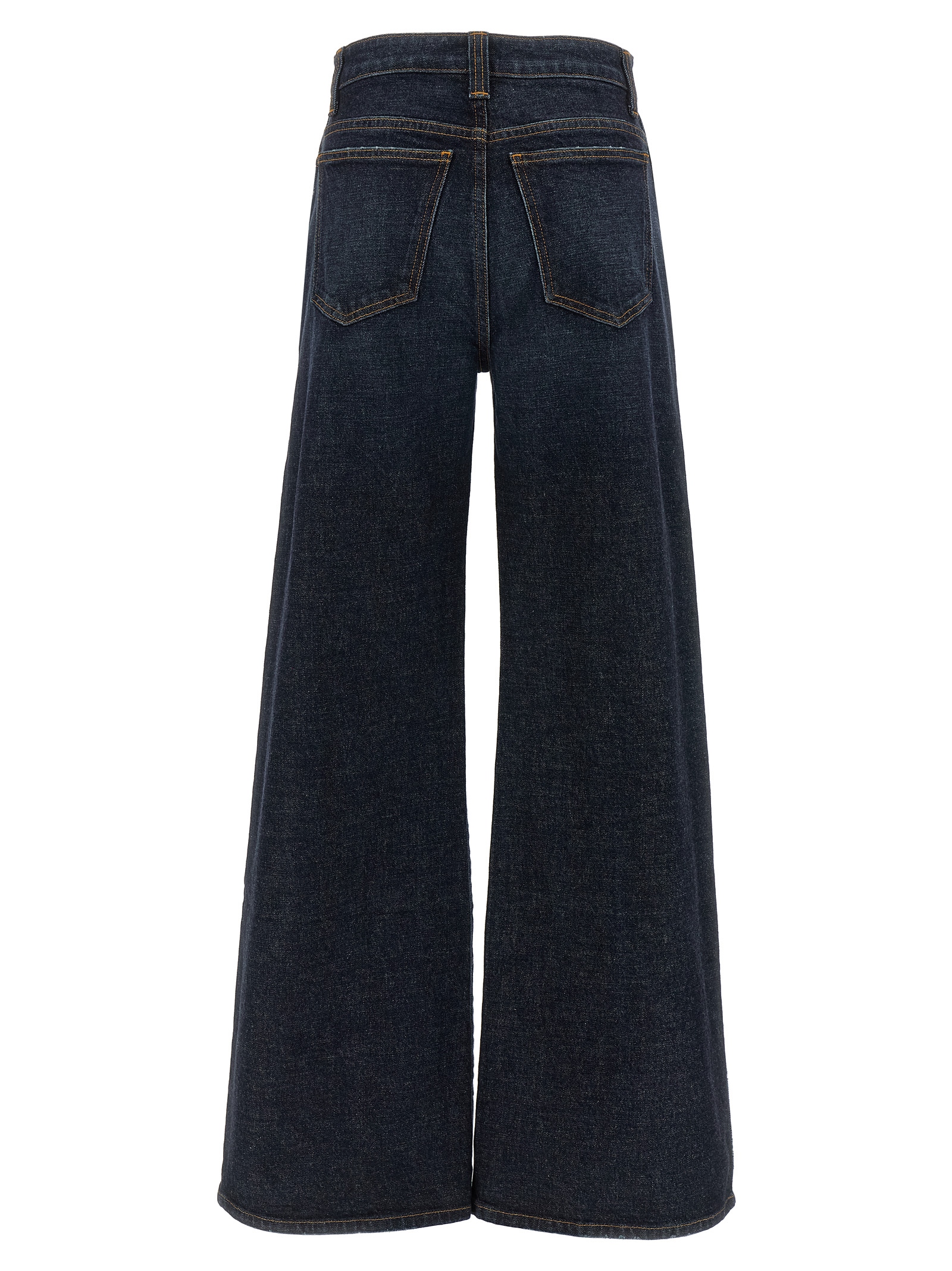 ‘Dane’ cotton denim jeans with contrast stitching, high waist, flared wide leg, five pockets, zip and button closure.