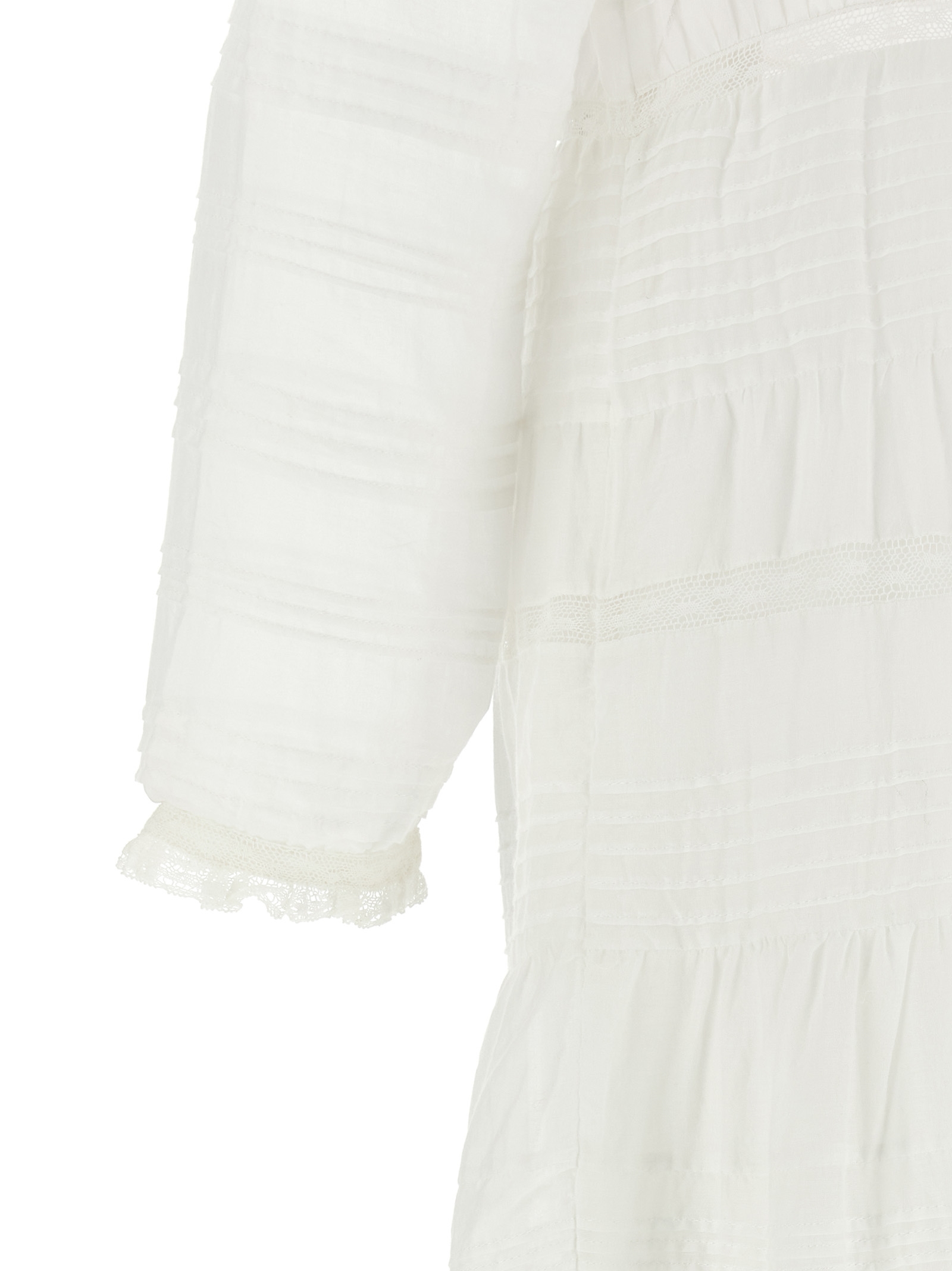 Long ‘Daniva’ dress in light cotton with lace inserts at the crochet I see I do not see and details in sangallo, V-neck, front hidden button closure, long sleeves with cuffs, flounce on asymmetrical hem, lining.