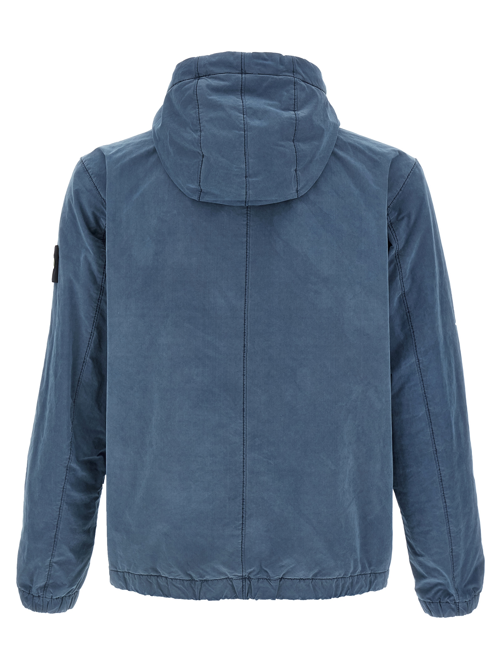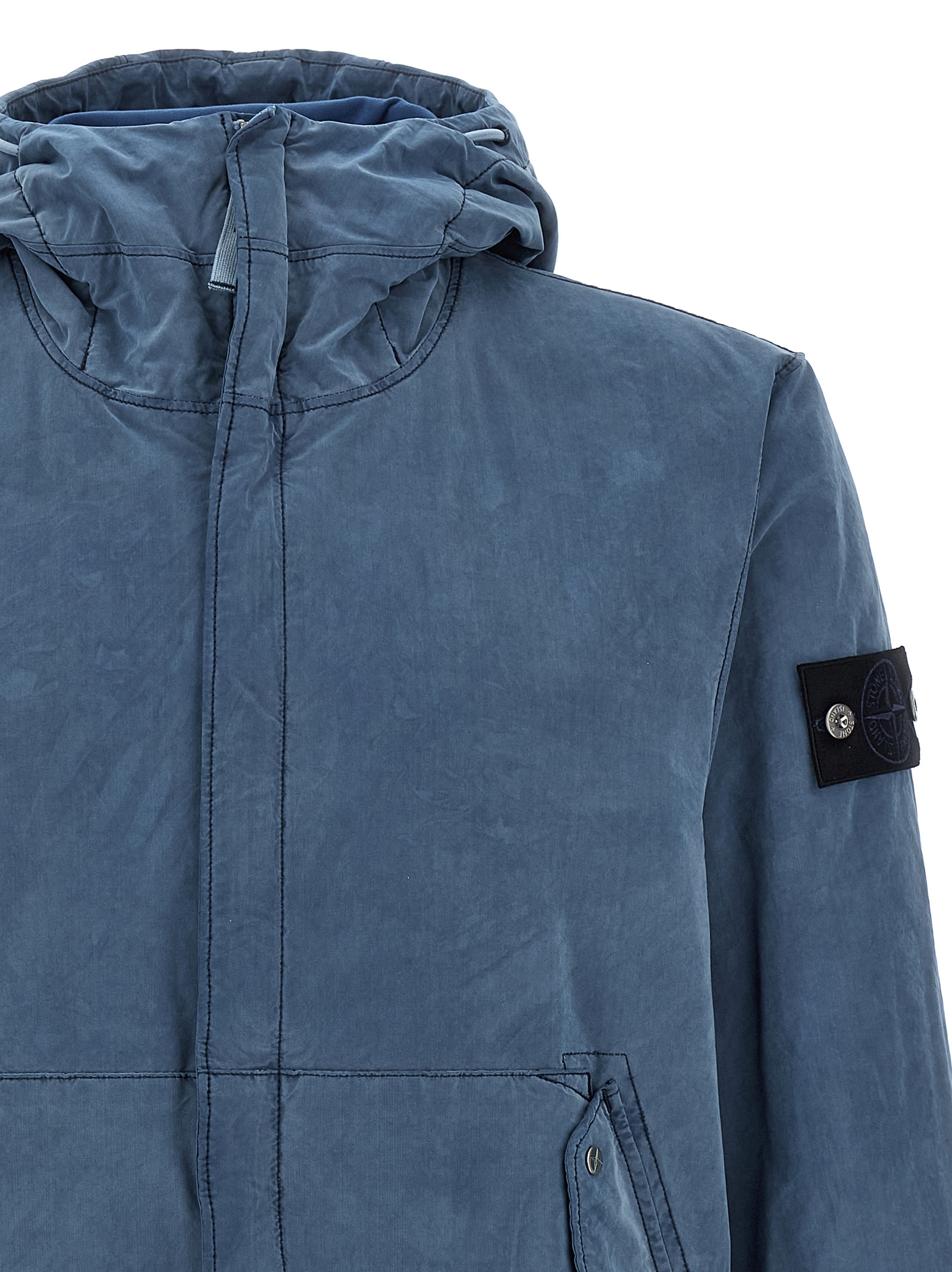 ‘David Light Indigo’ waterproof canvas hooded jacket with front flap and snap pockets, side logo badge. Garment-dyed model with anti-drip treatment.