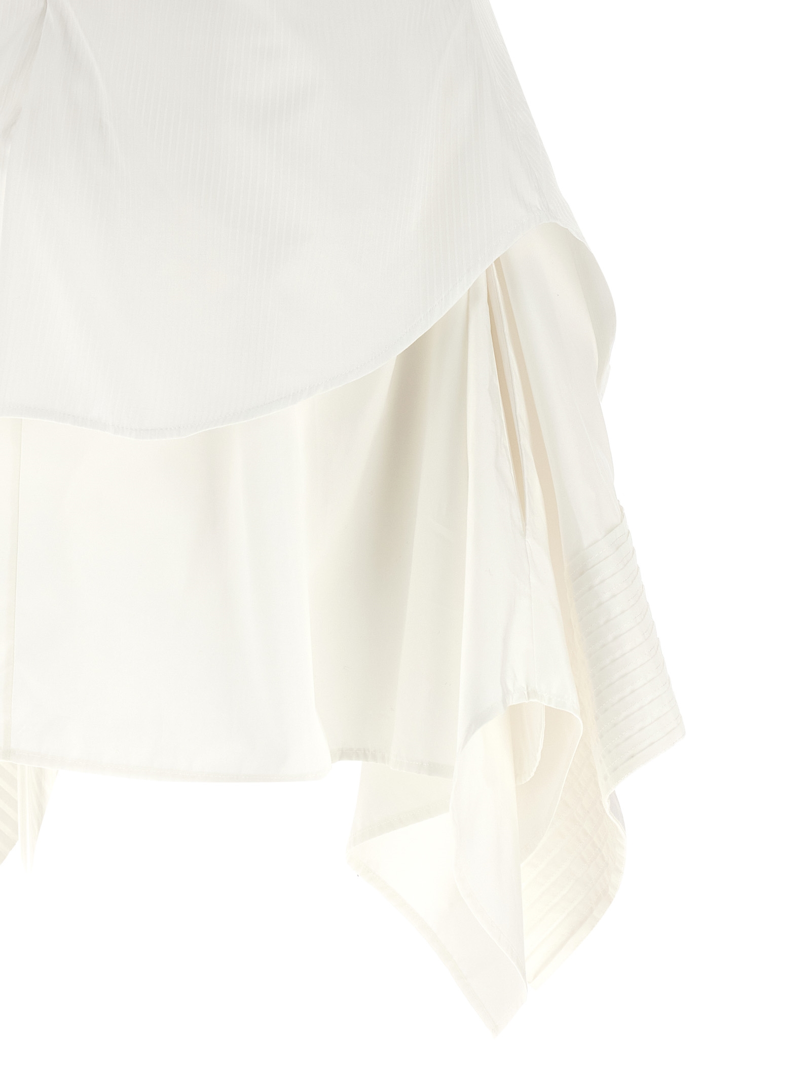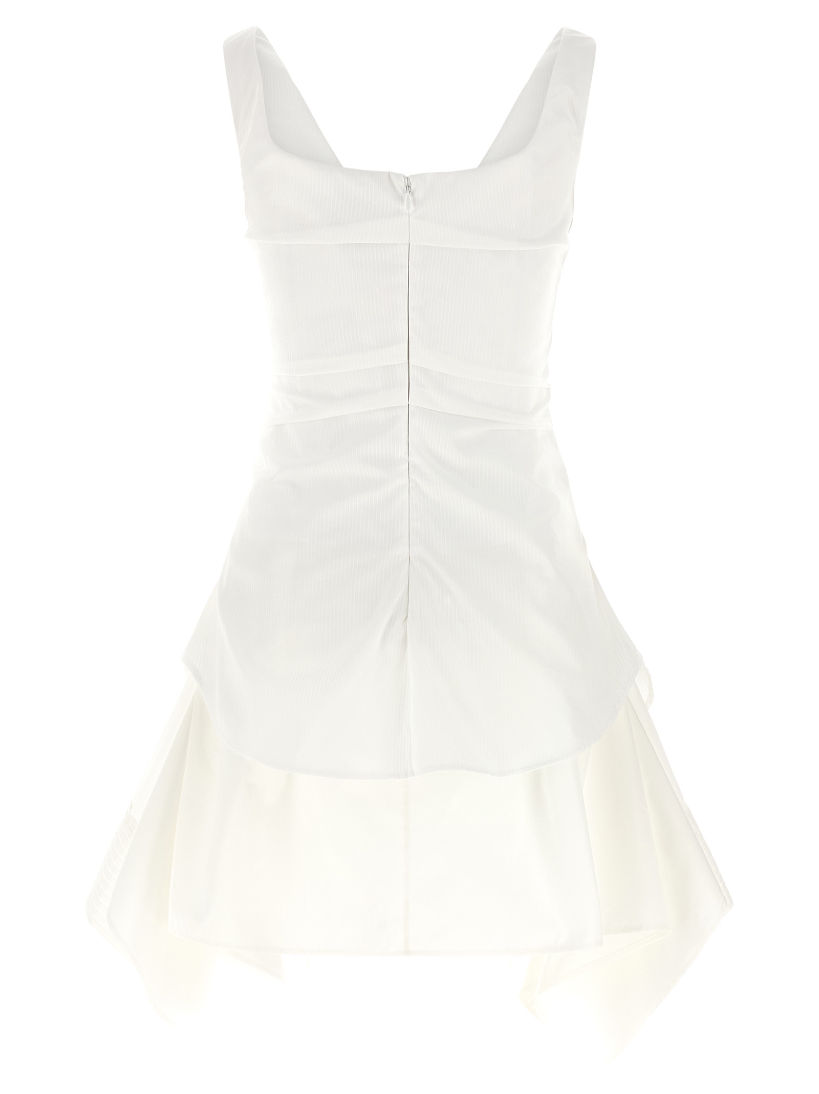 Mini ‘Day’ dress in striped cotton poplin, folded front part with adjustable hook closure, pleats and pleats to create front and back curls, preformed cup, wide front square neckline, thick straps, sleeveless, back zip closure, asymmetrical insert on the hem in cotton poplin with pleats, asymmetrical hem.