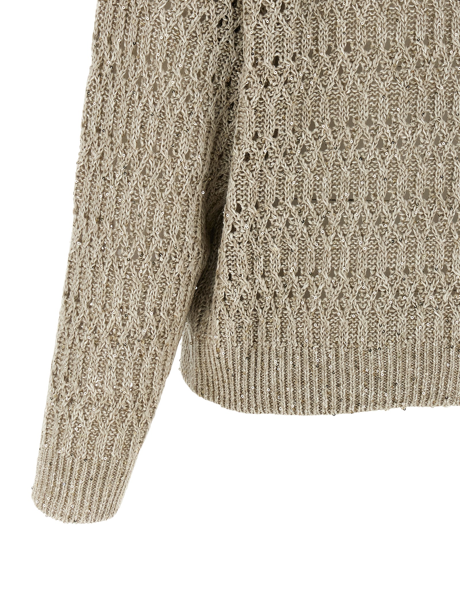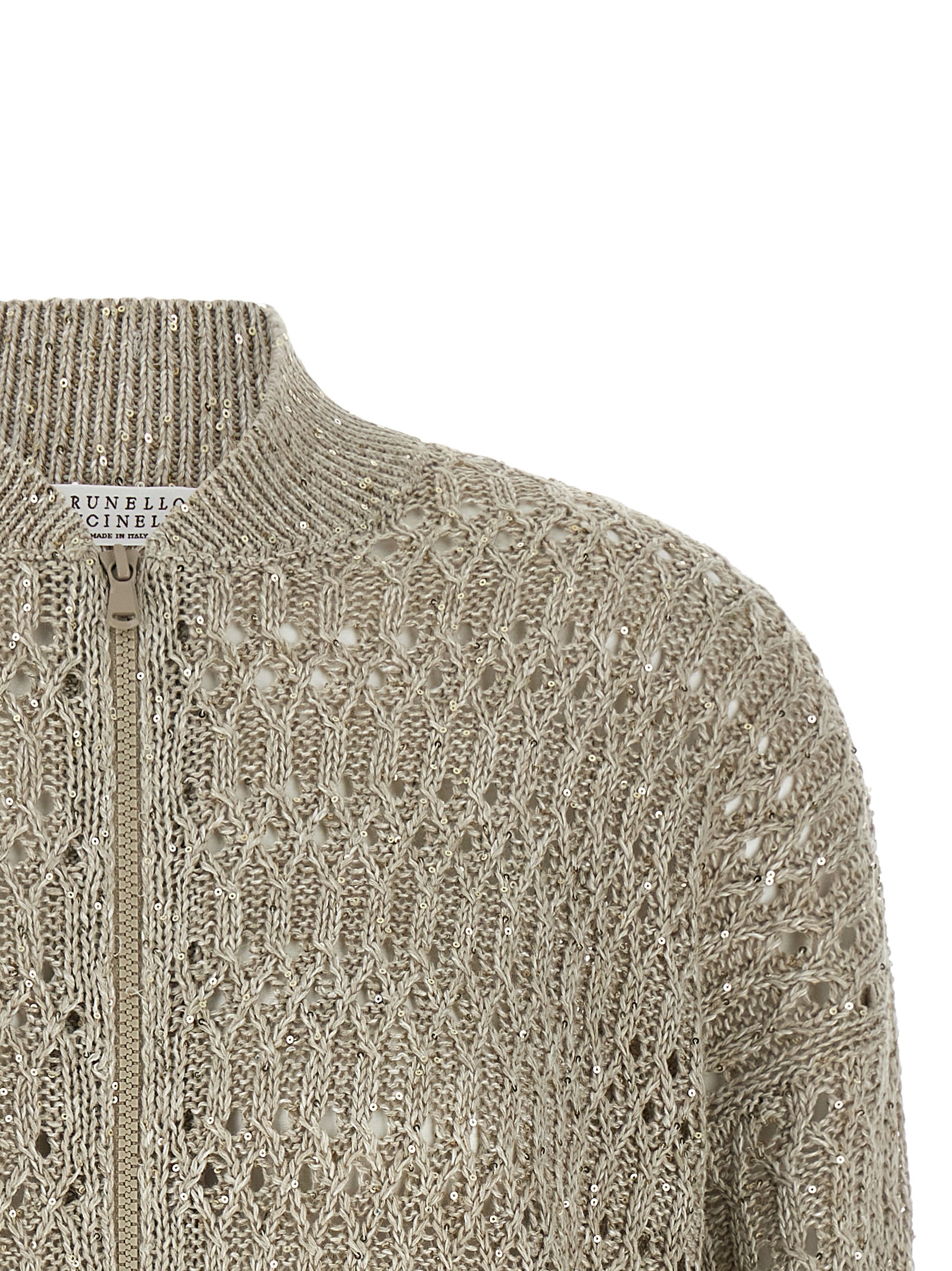 Dazzling Braids’ knitted linen cardigan with all-over sequin appliqué, high neck, front zip closure, long sleeves with cuffs and dropped shoulders.